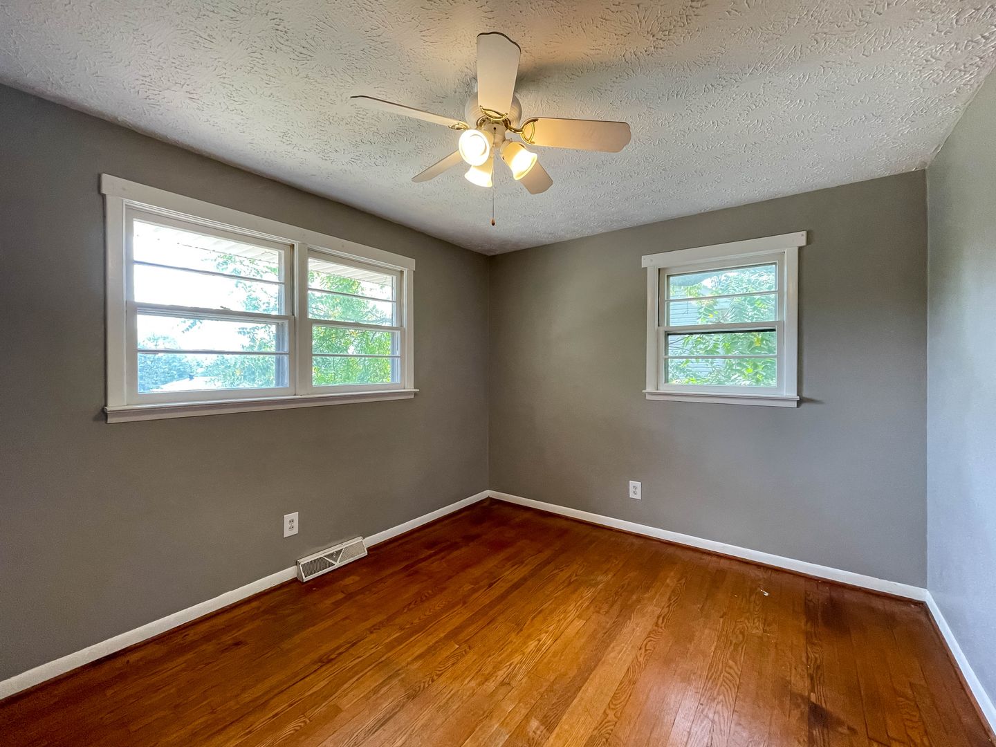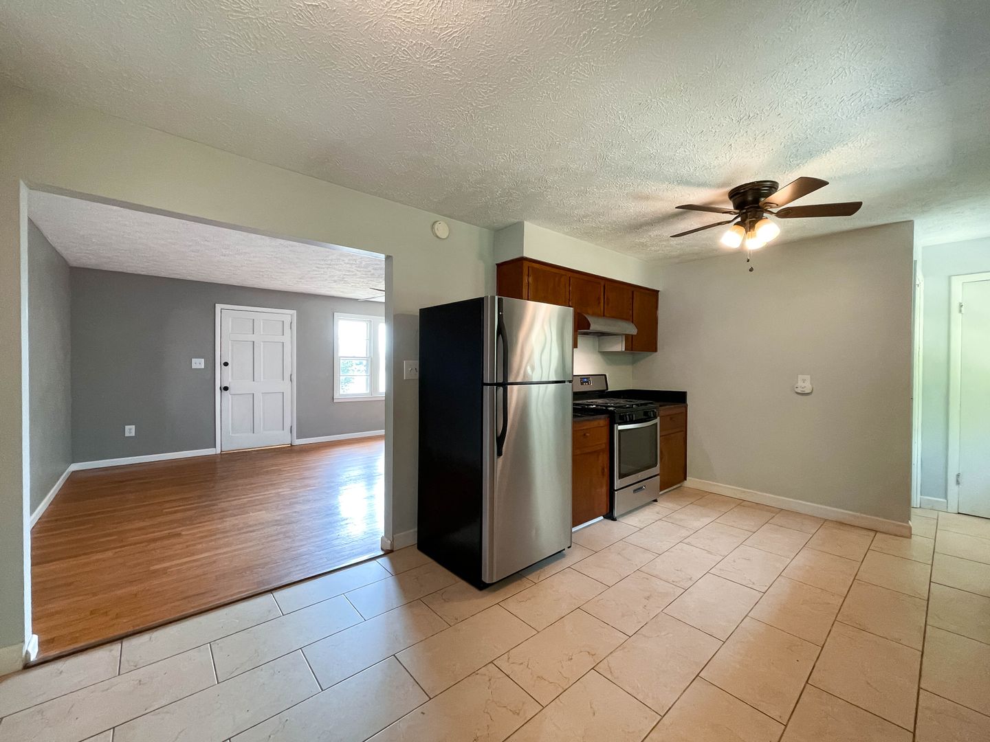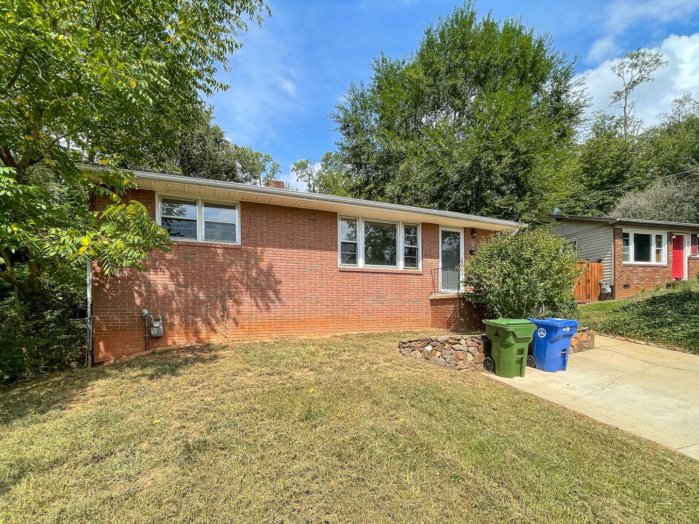 This two-bedroom, one-bath home in West Asheville offers classic hardwood floors throughout the living spaces with tile in the kitchen and bath. The home has been freshly painted and features an updated bathroom with white subway tile. The kitchen is outfitted with a stainless steel top-freezer refrigerator and gas range, plus wood cabinetry and ample counter space.