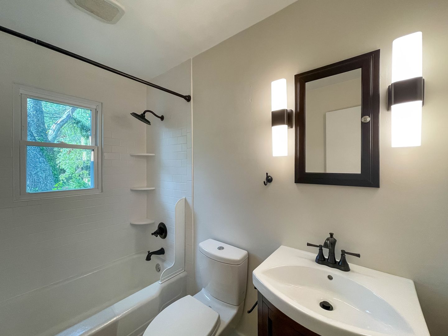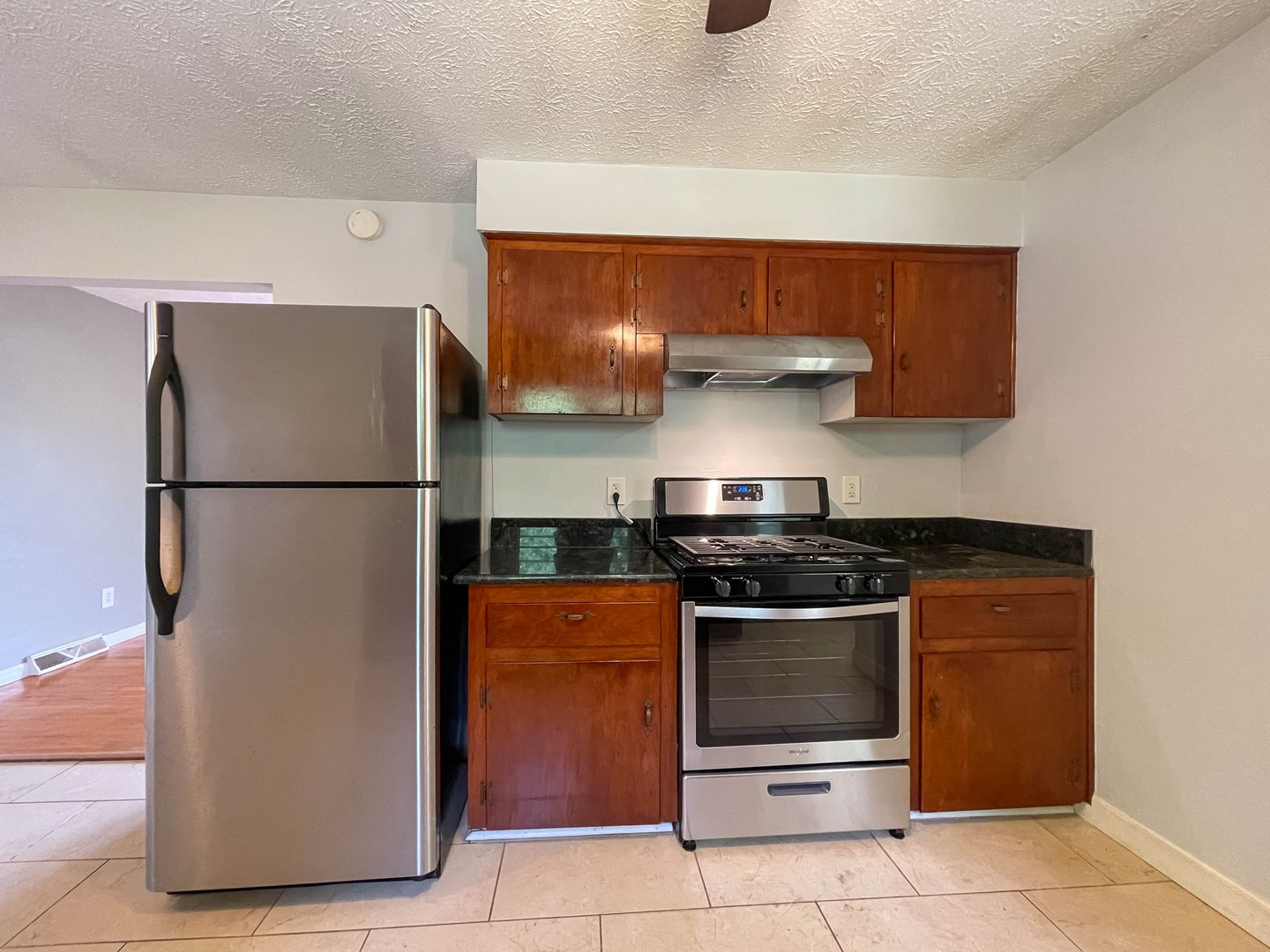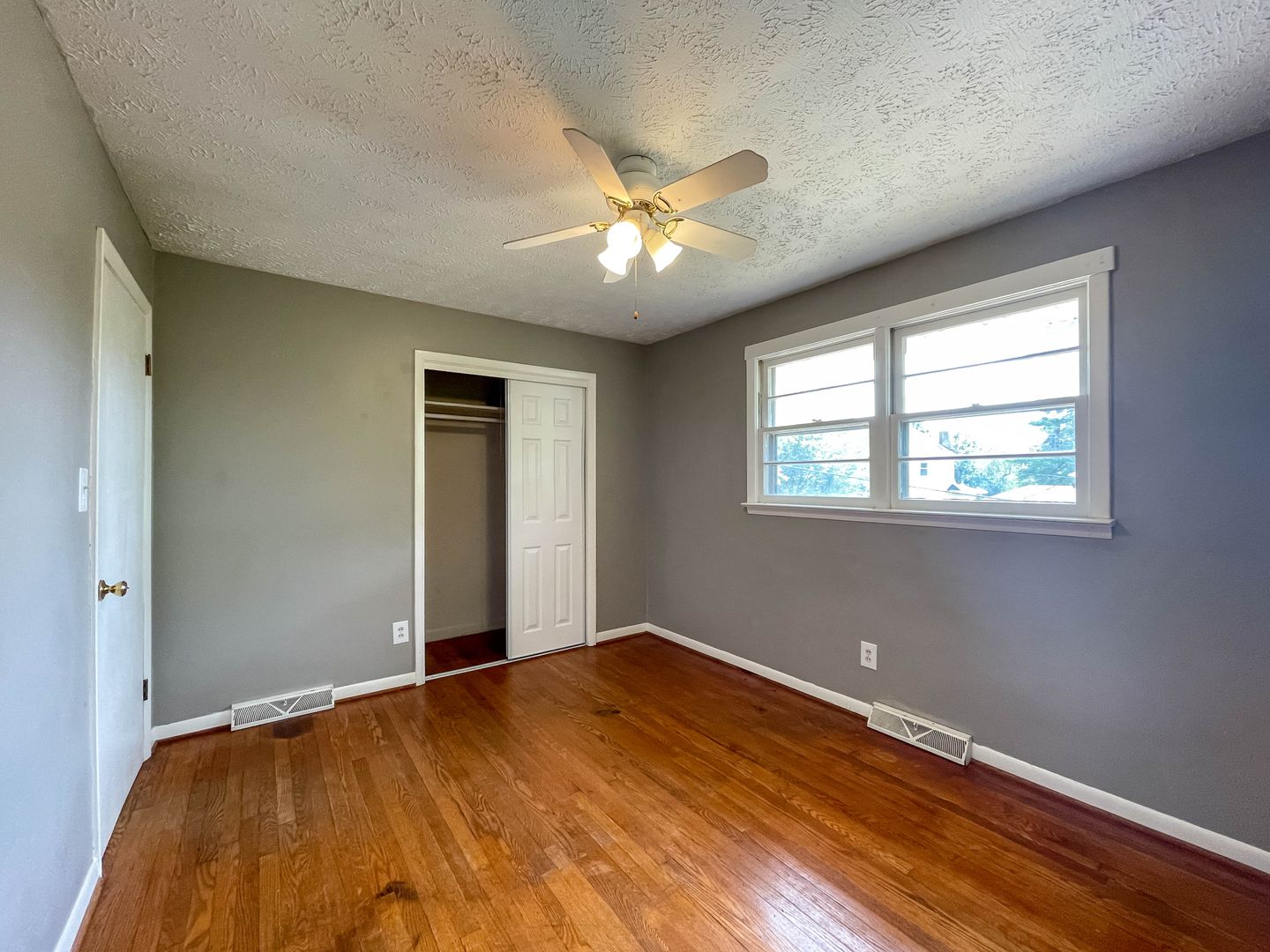 This two-bedroom, one-bath home in West Asheville offers classic hardwood floors throughout the living spaces with tile in the kitchen and bath. The home has been freshly painted and features an updated bathroom with white subway tile. The kitchen is outfitted with a stainless steel top-freezer refrigerator and gas range, plus wood cabinetry and ample counter space.