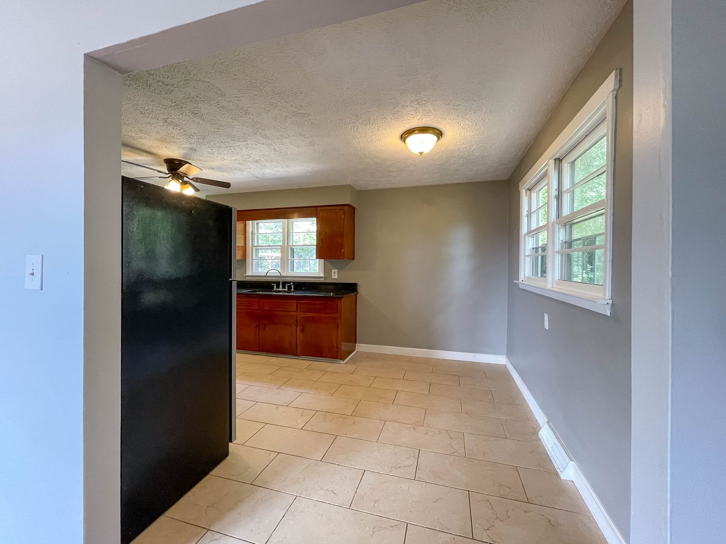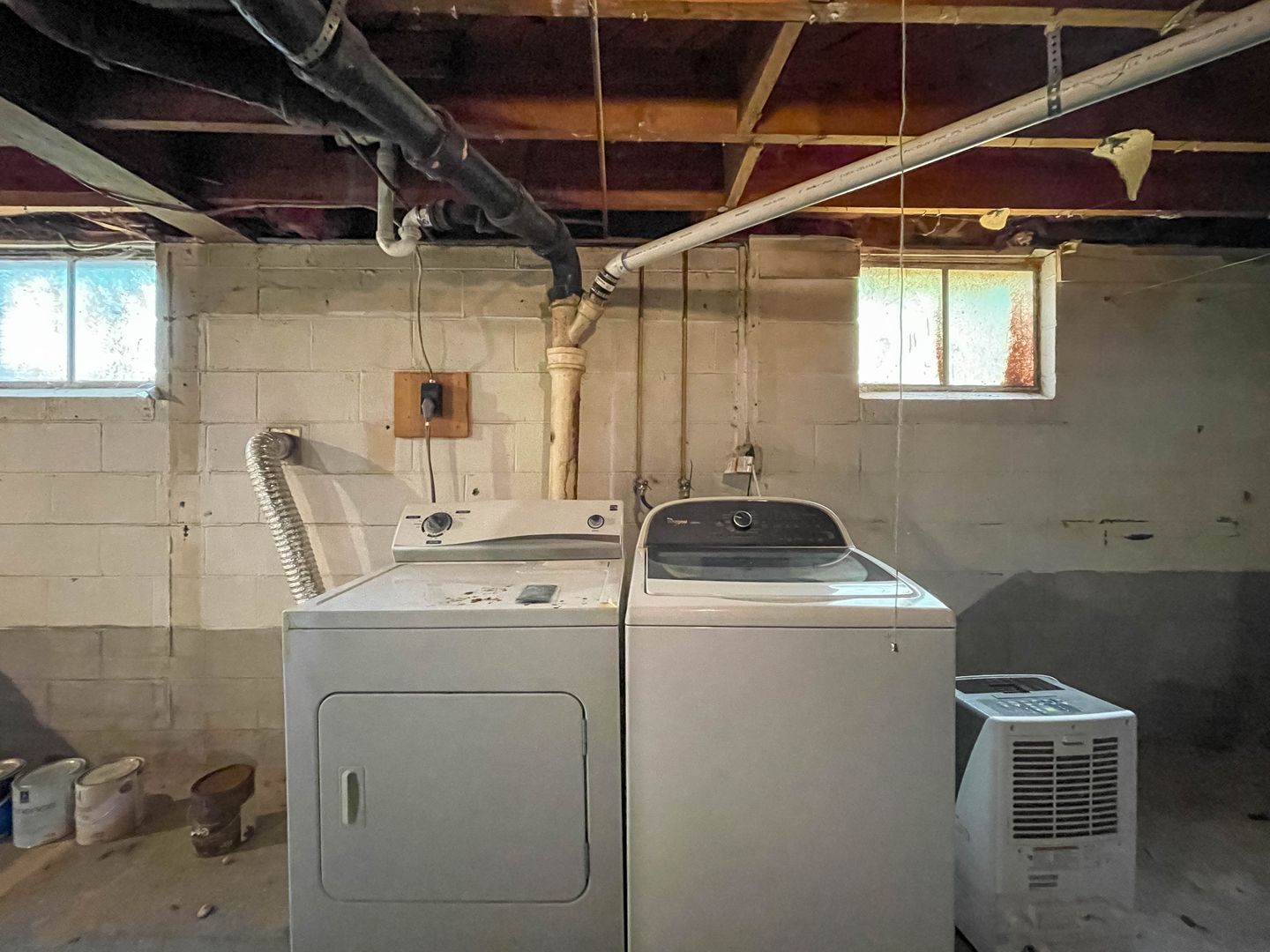 Both bedrooms provide comfortable sleeping quarters with ceiling fans and natural light. The unfinished basement offers plenty of storage space for seasonal items and outdoor gear.