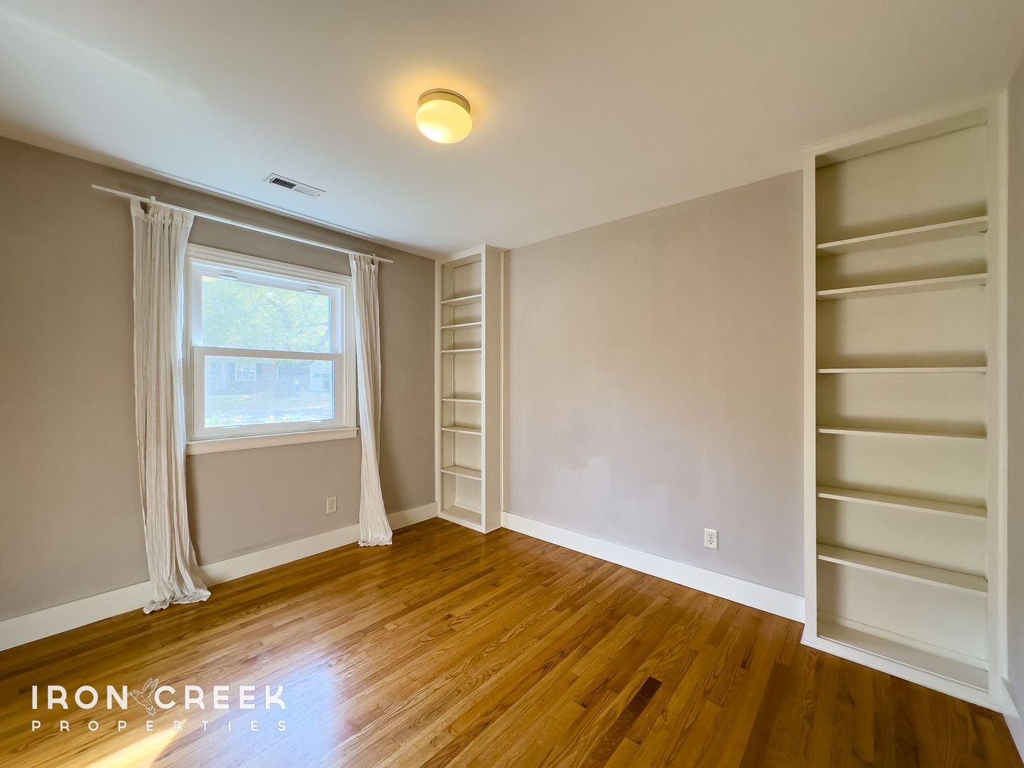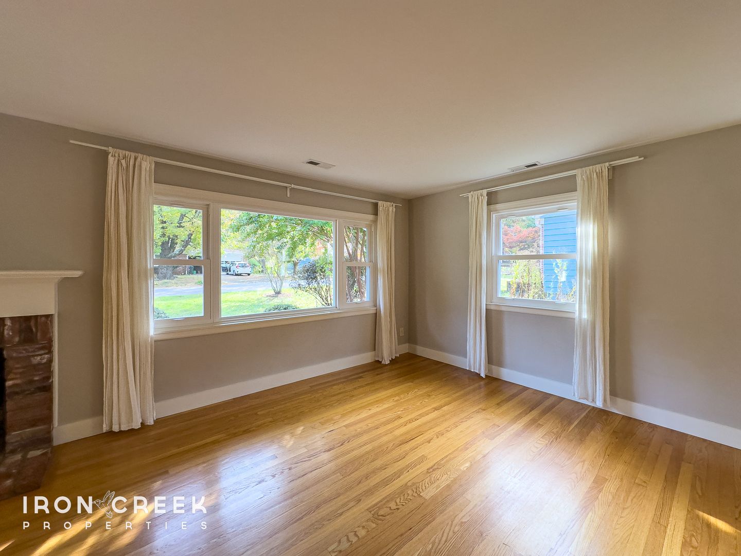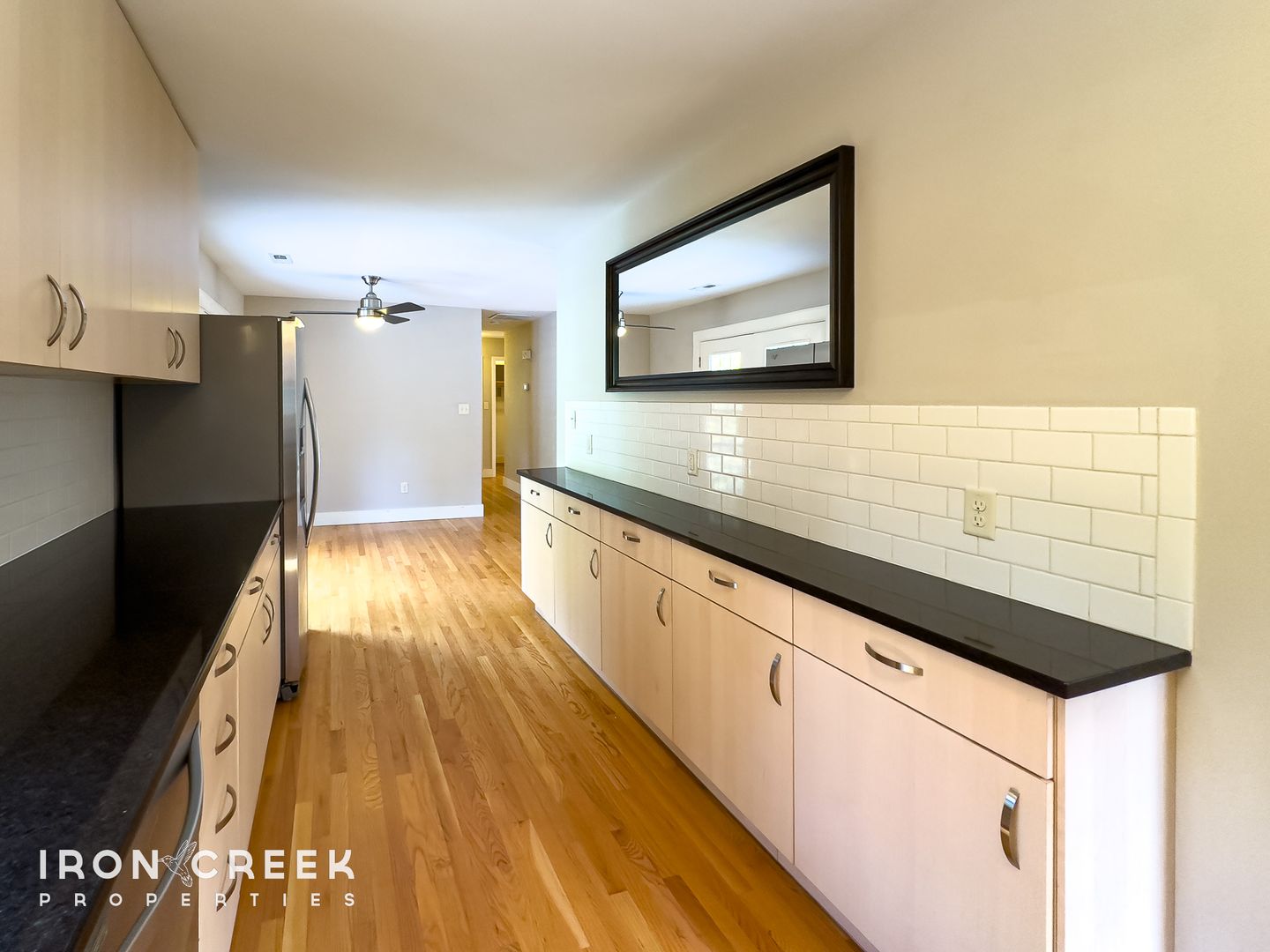 This four-bedroom, three-bath home features hardwood flooring throughout the main level and built-in shelving in one bedroom. The kitchen is outfitted with a side-by-side refrigerator with ice maker, dishwasher, and gas range, complemented by stone countertops and subway tile backsplash.