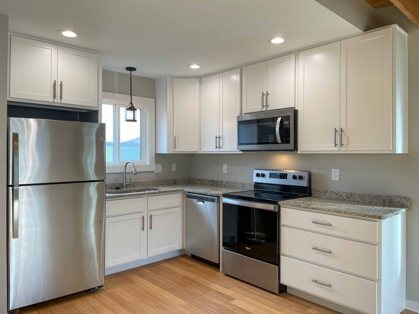 The kitchen is outfitted with an electric range, built-in microwave, dishwasher, refrigerator, stainless-steel sink, and plenty of cabinet and counter space. The exposed rafters and Edison bulbs add warmth to the living room. The bedrooms have large closets and extra storage nooks.