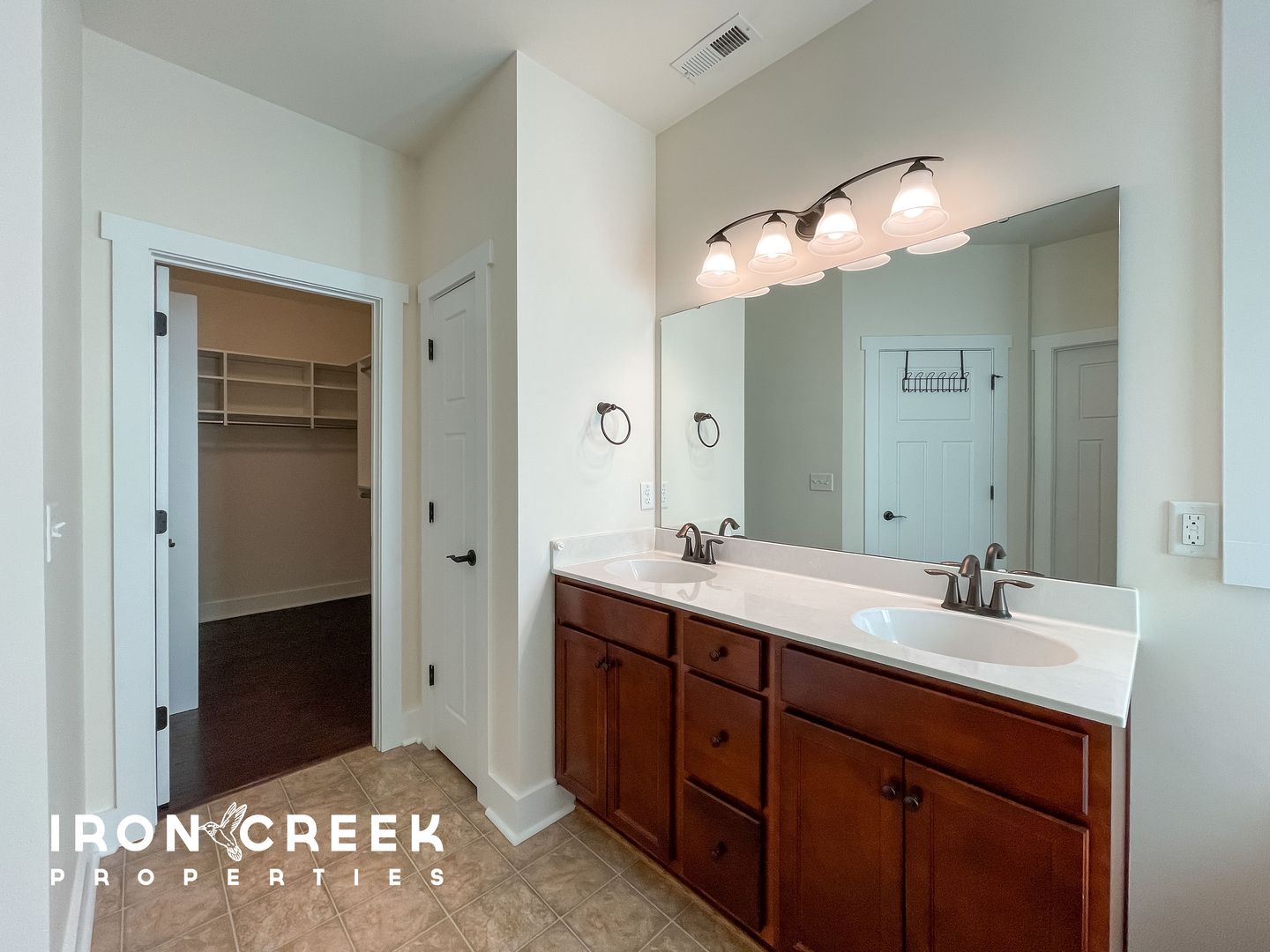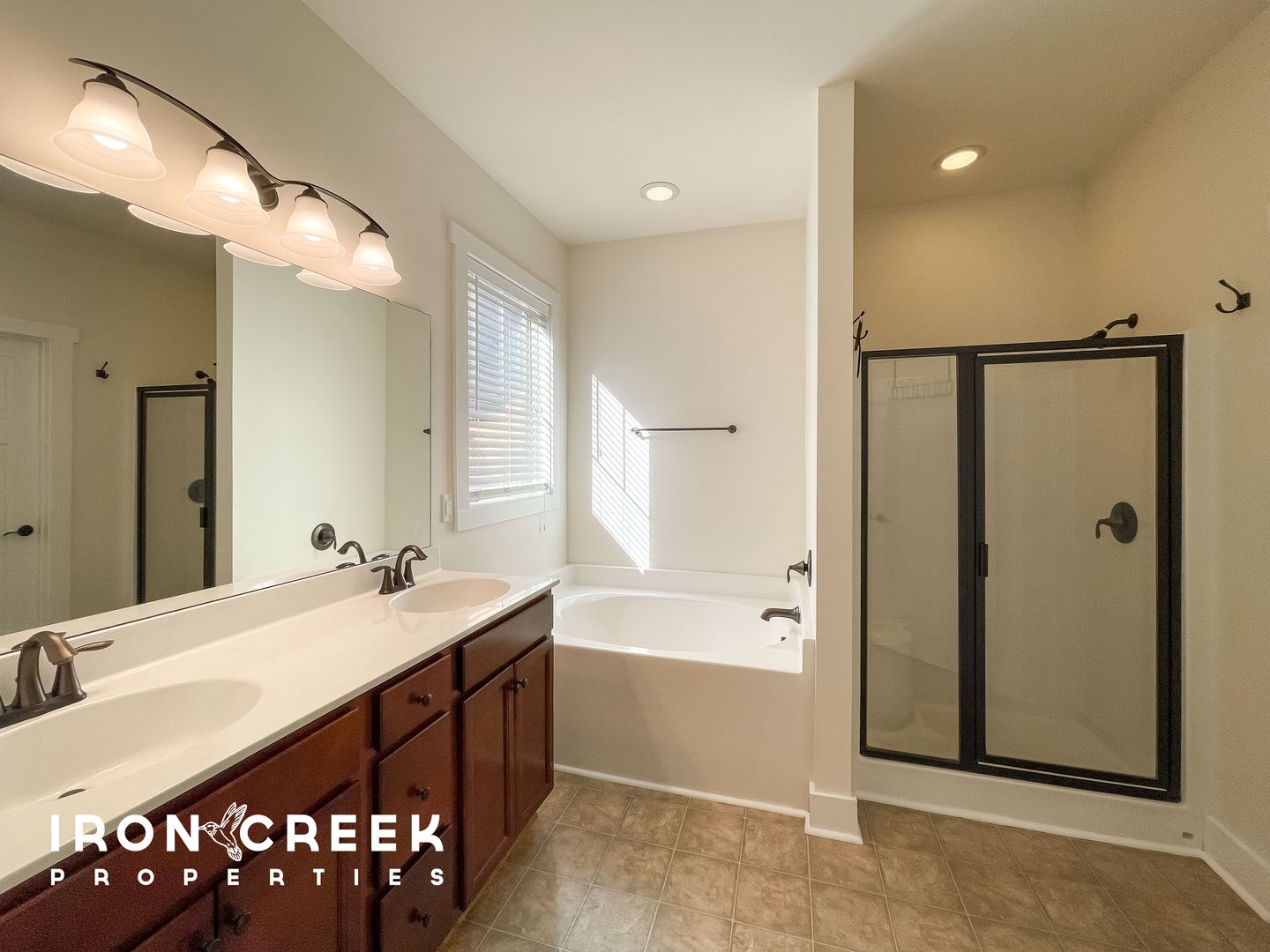 The primary suite is on the main floor with backyard views and a double-vanity en-suite bath featuring a garden tub, separate shower, and walk-in closet. A second bedroom and full bath are also on the main level. Upstairs, two additional bedrooms and a full bath open to a large shared common room offering a flexible second living space well suited for a home office, playroom, or media room.