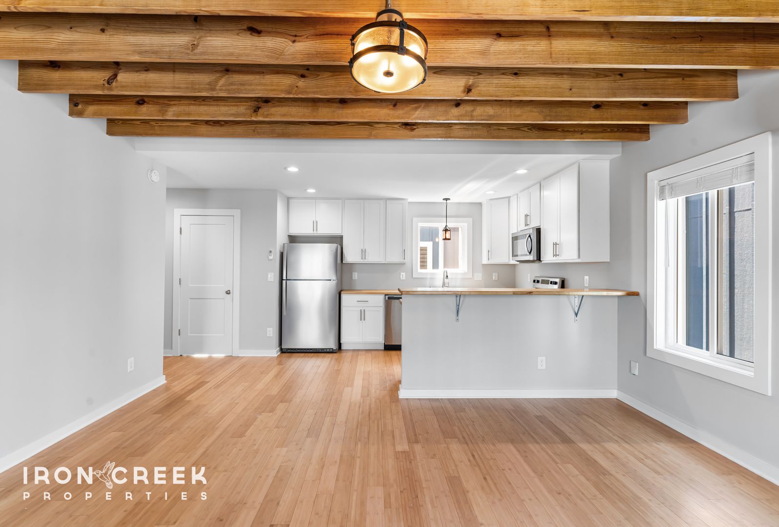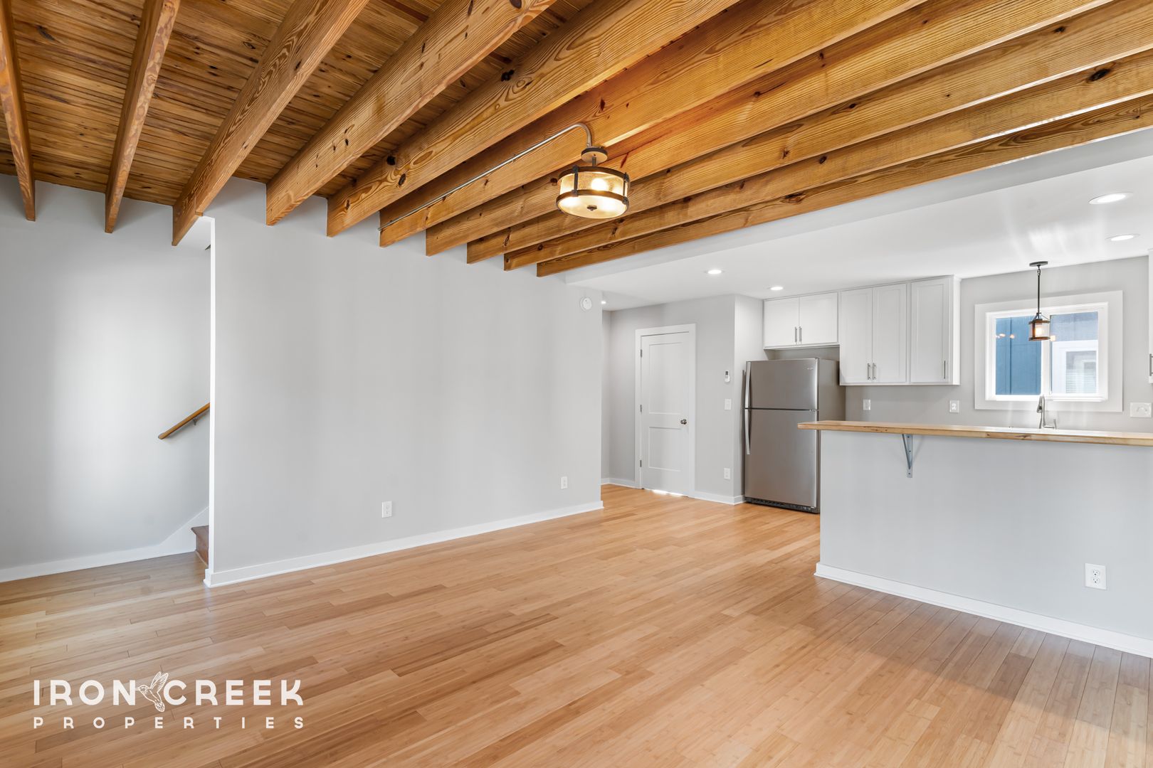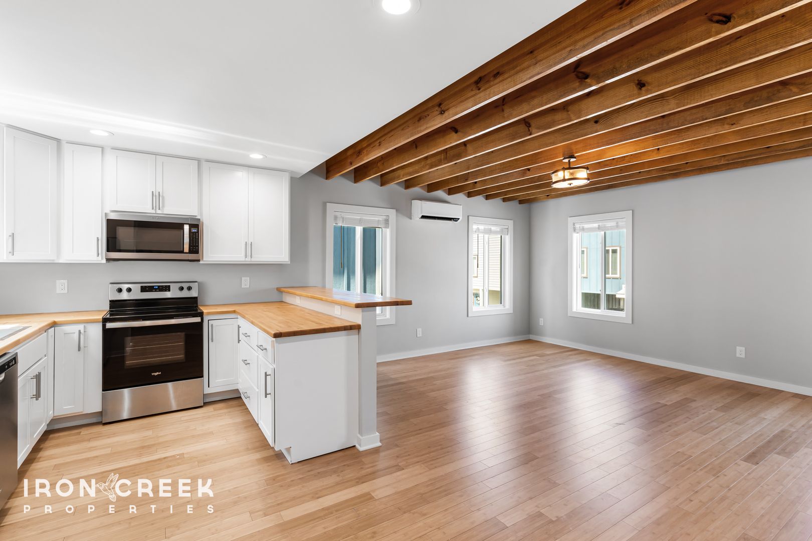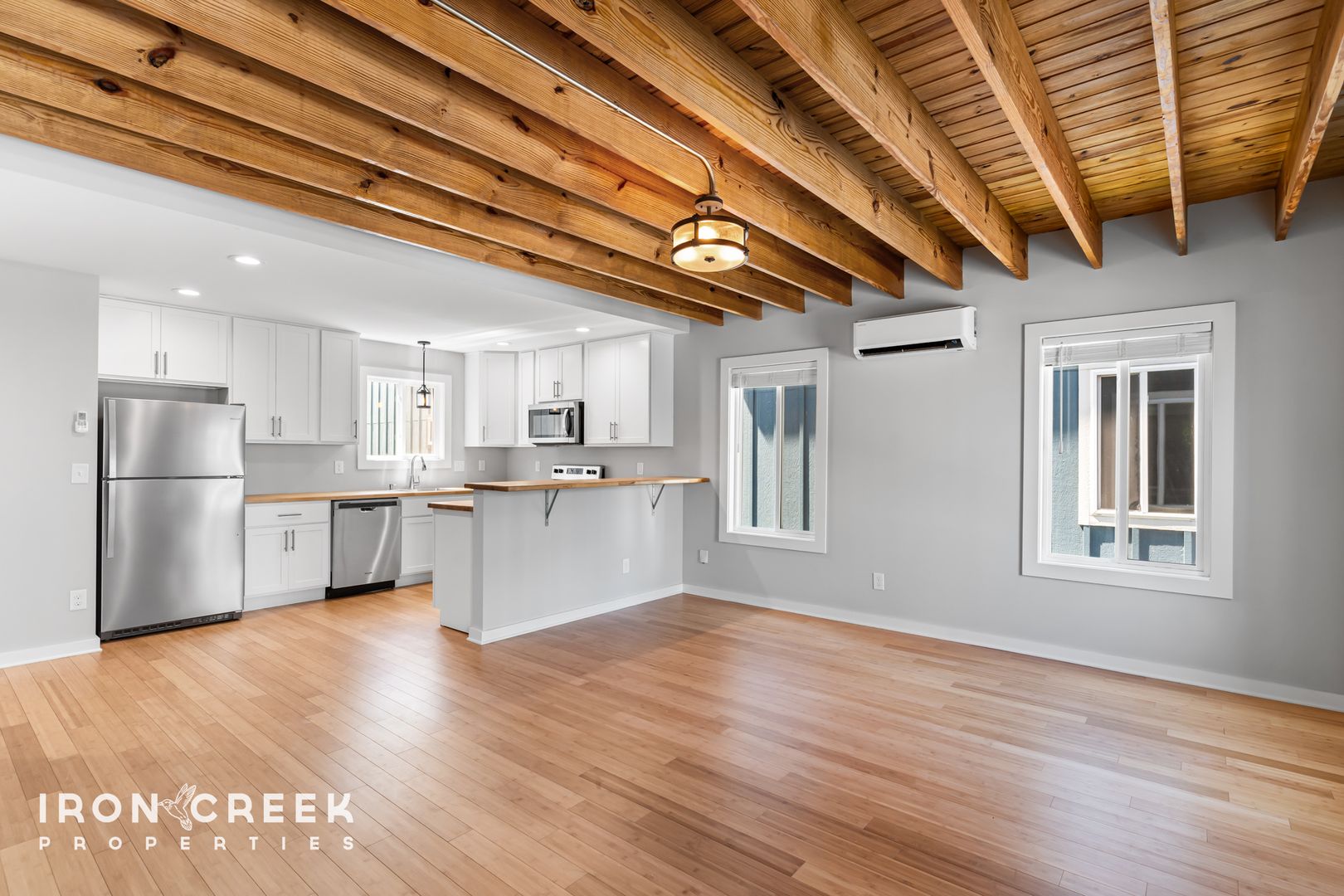 The kitchen is outfitted with an electric range, built-in microwave, dishwasher, refrigerator, stainless-steel sink, and plenty of cabinet and counter space. The exposed rafters and Edison bulbs add warmth to the living room. The bedrooms have large closets and extra storage nooks.