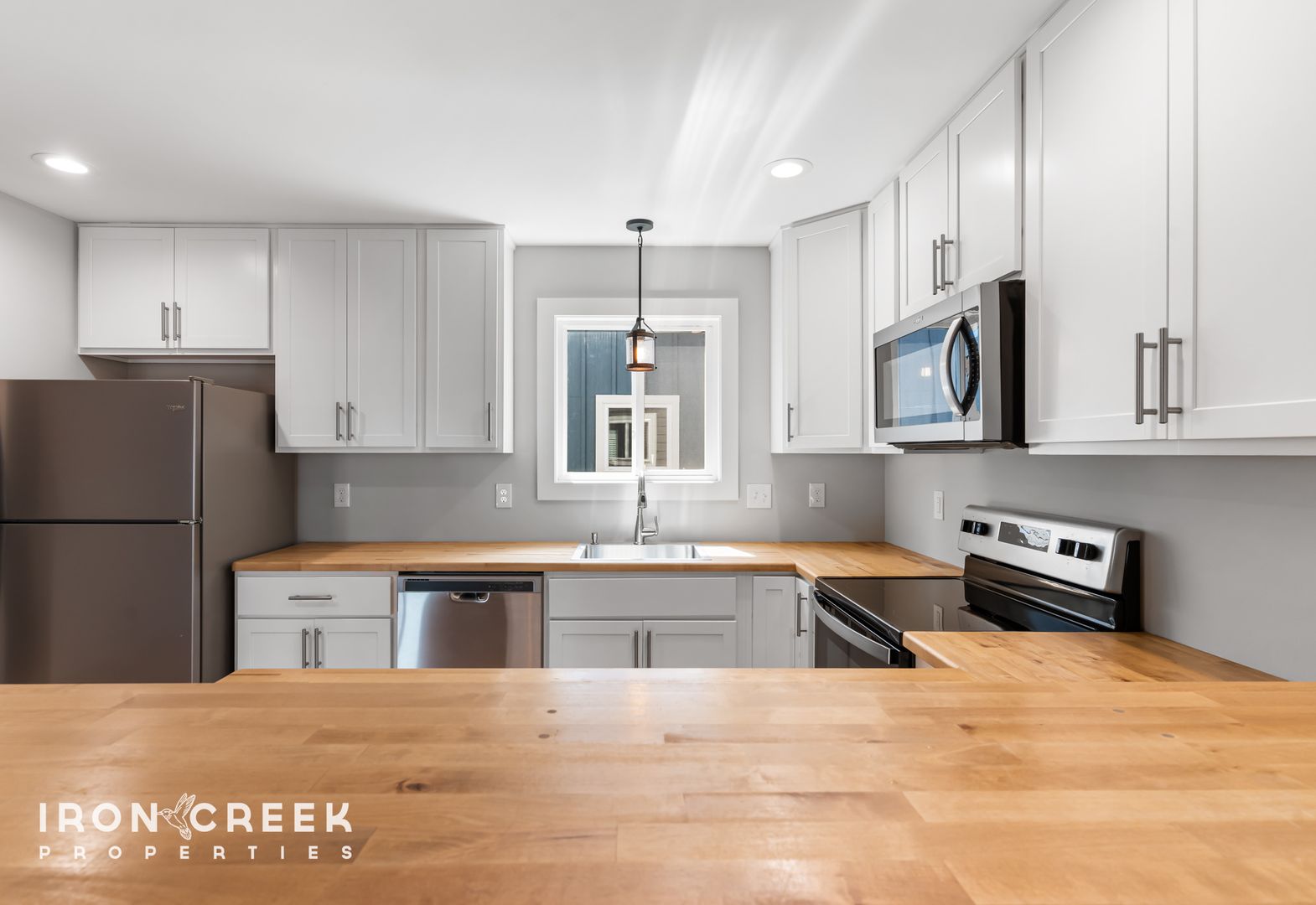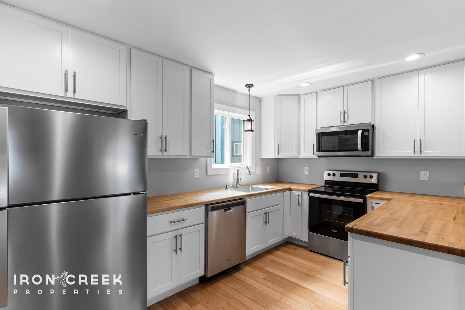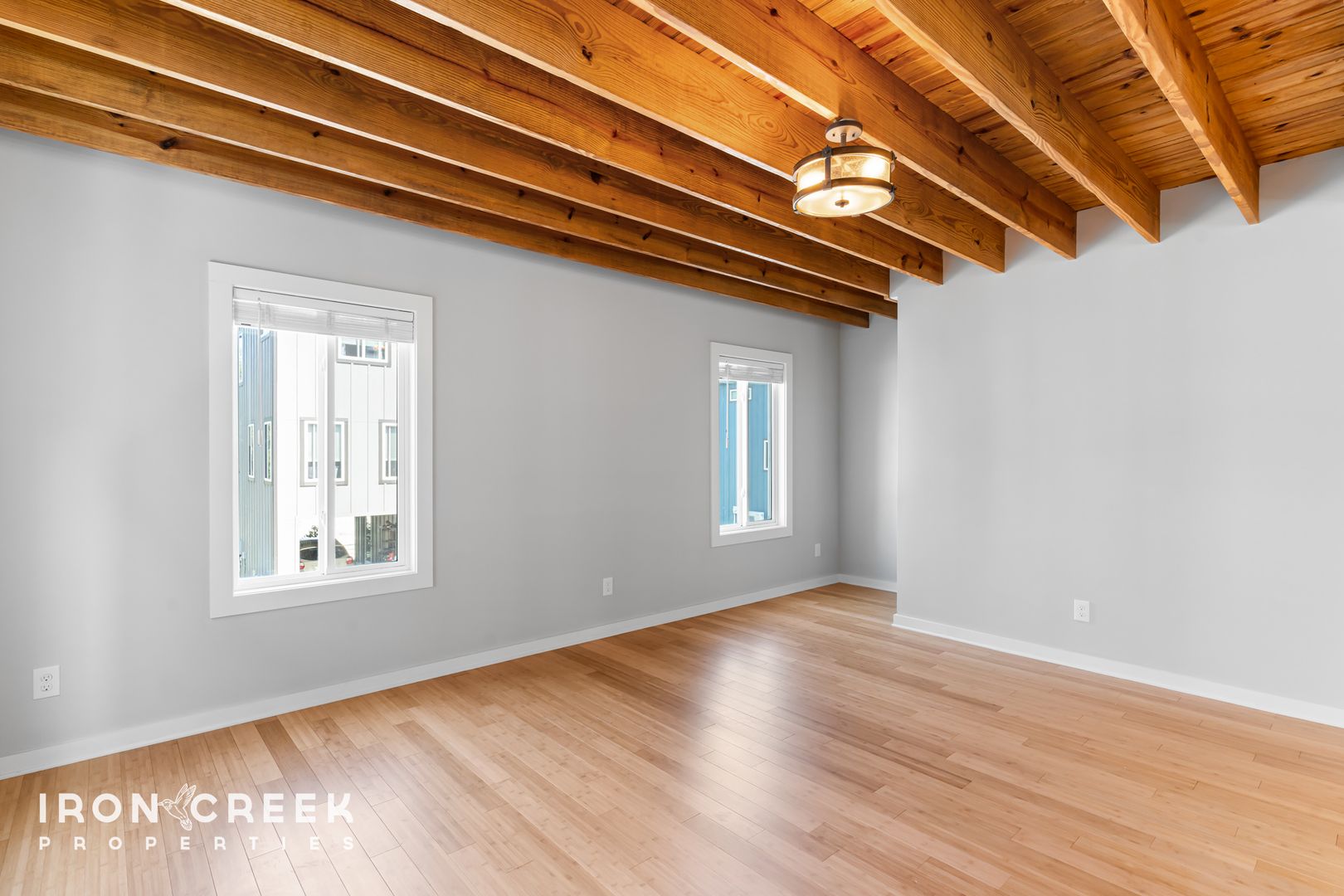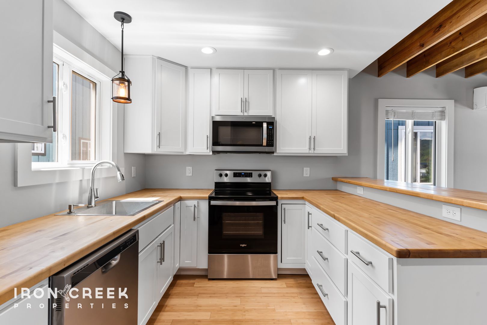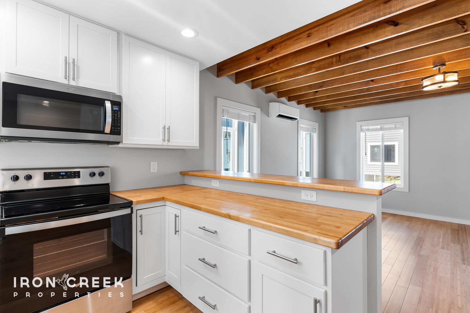 The kitchen is outfitted with an electric range, built-in microwave, dishwasher, refrigerator, stainless-steel sink, and plenty of cabinet and counter space. The exposed rafters and Edison bulbs add warmth to the living room. The bedrooms have large closets and extra storage nooks.