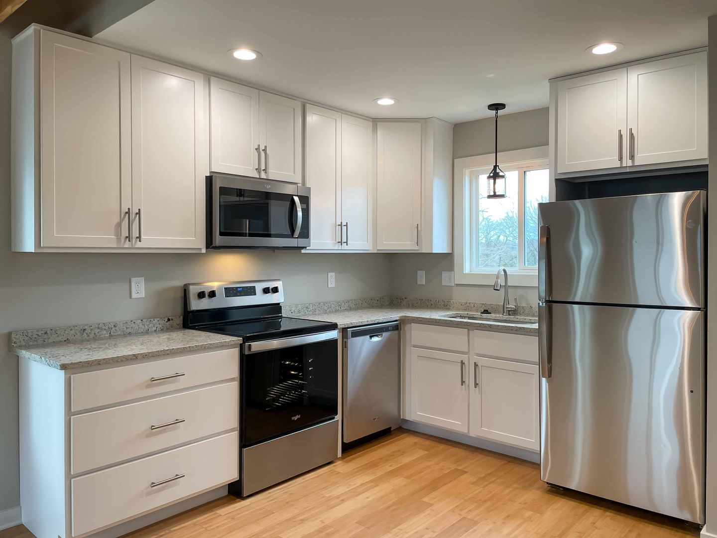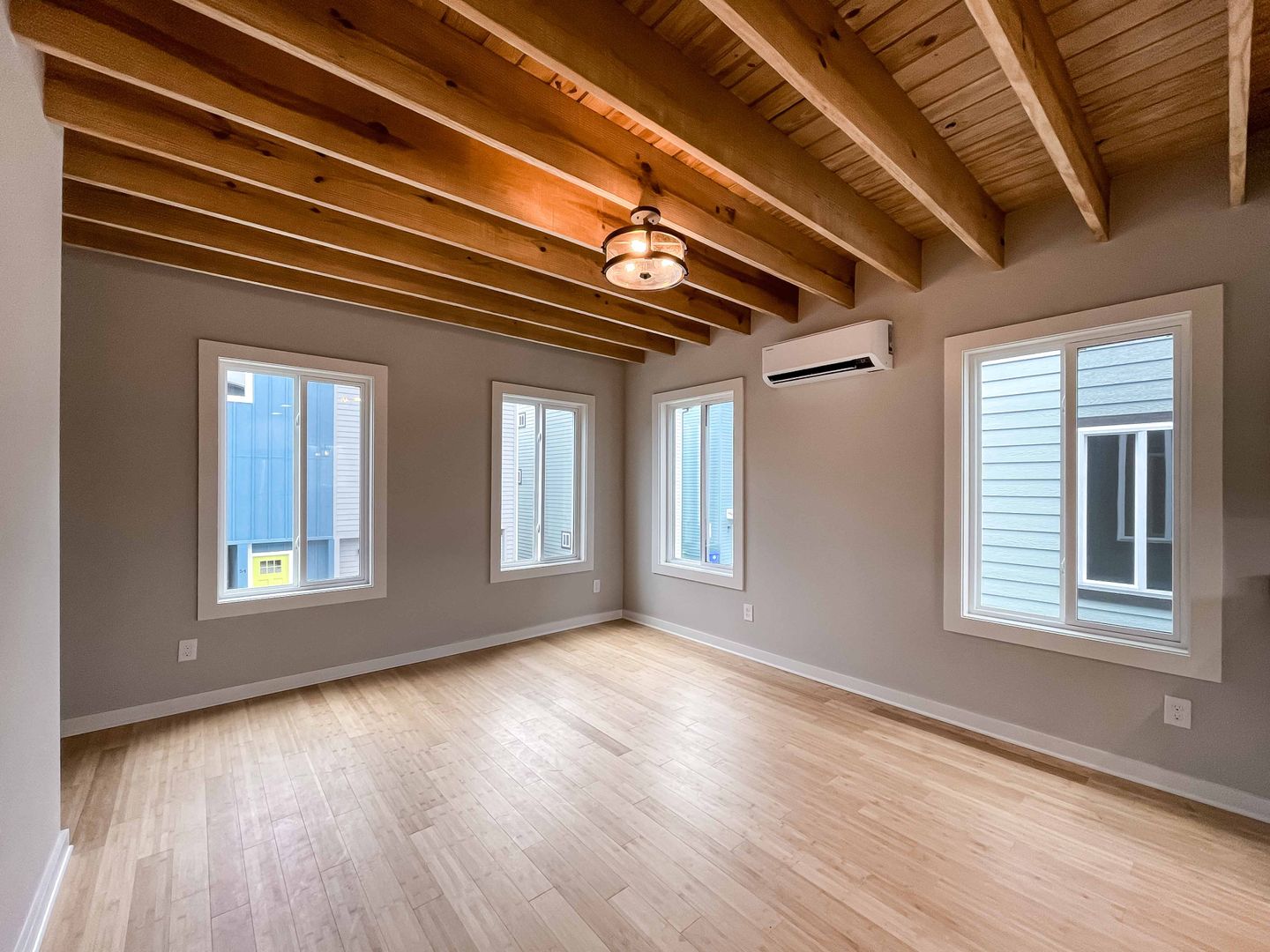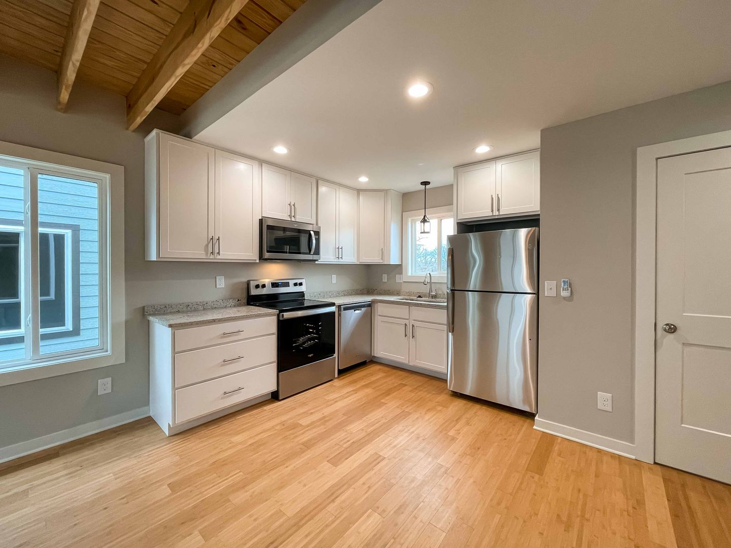 The kitchen is outfitted with an electric range, built-in microwave, dishwasher, refrigerator, stainless-steel sink, and plenty of cabinet and counter space. The exposed rafters and Edison bulbs add warmth to the living room. The bedrooms have large closets and extra storage nooks.