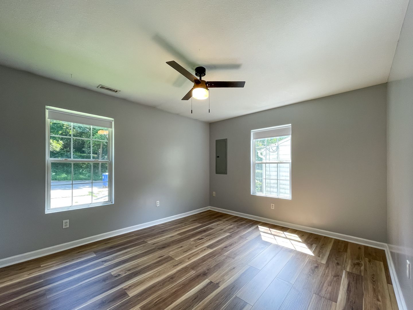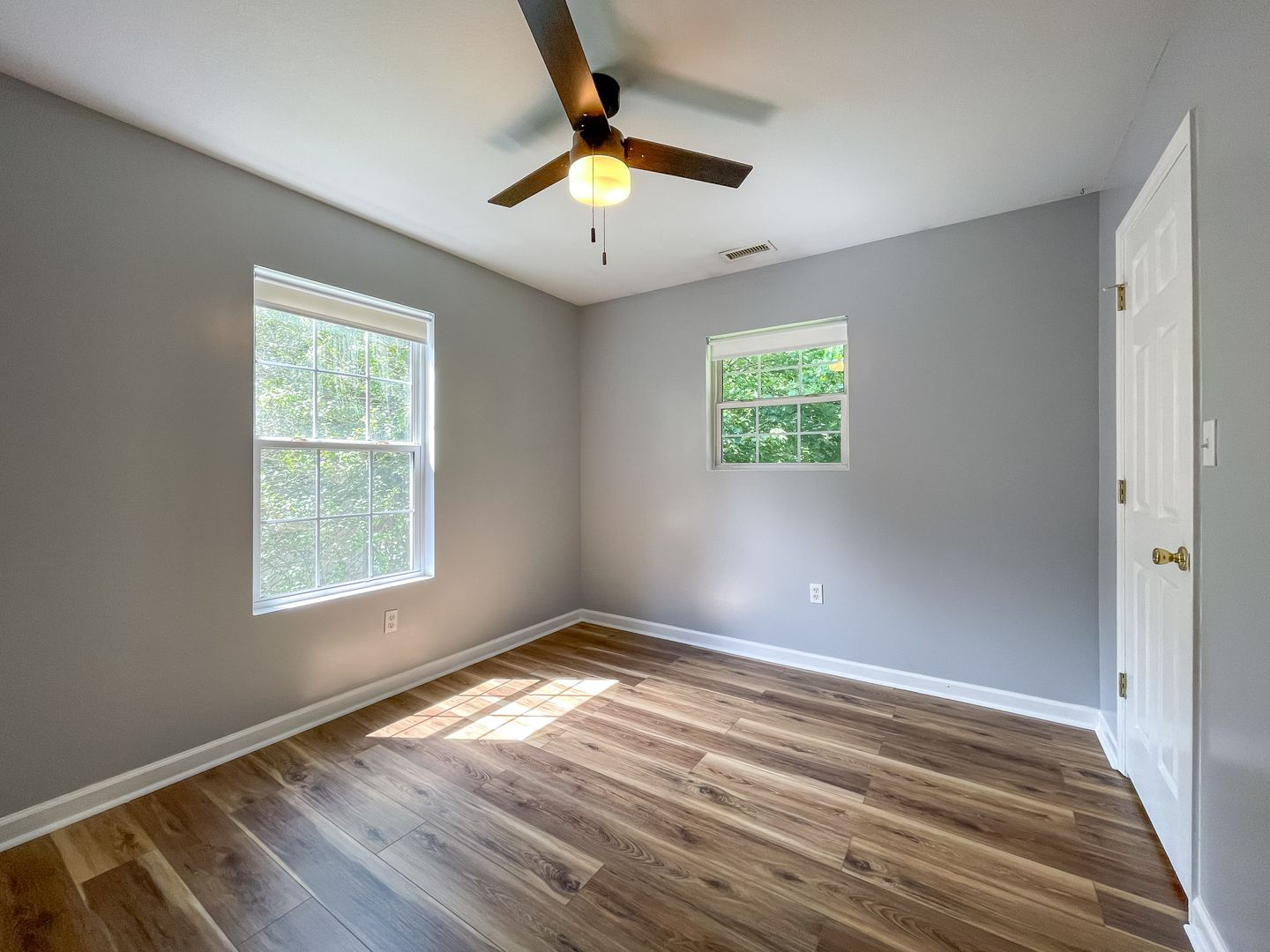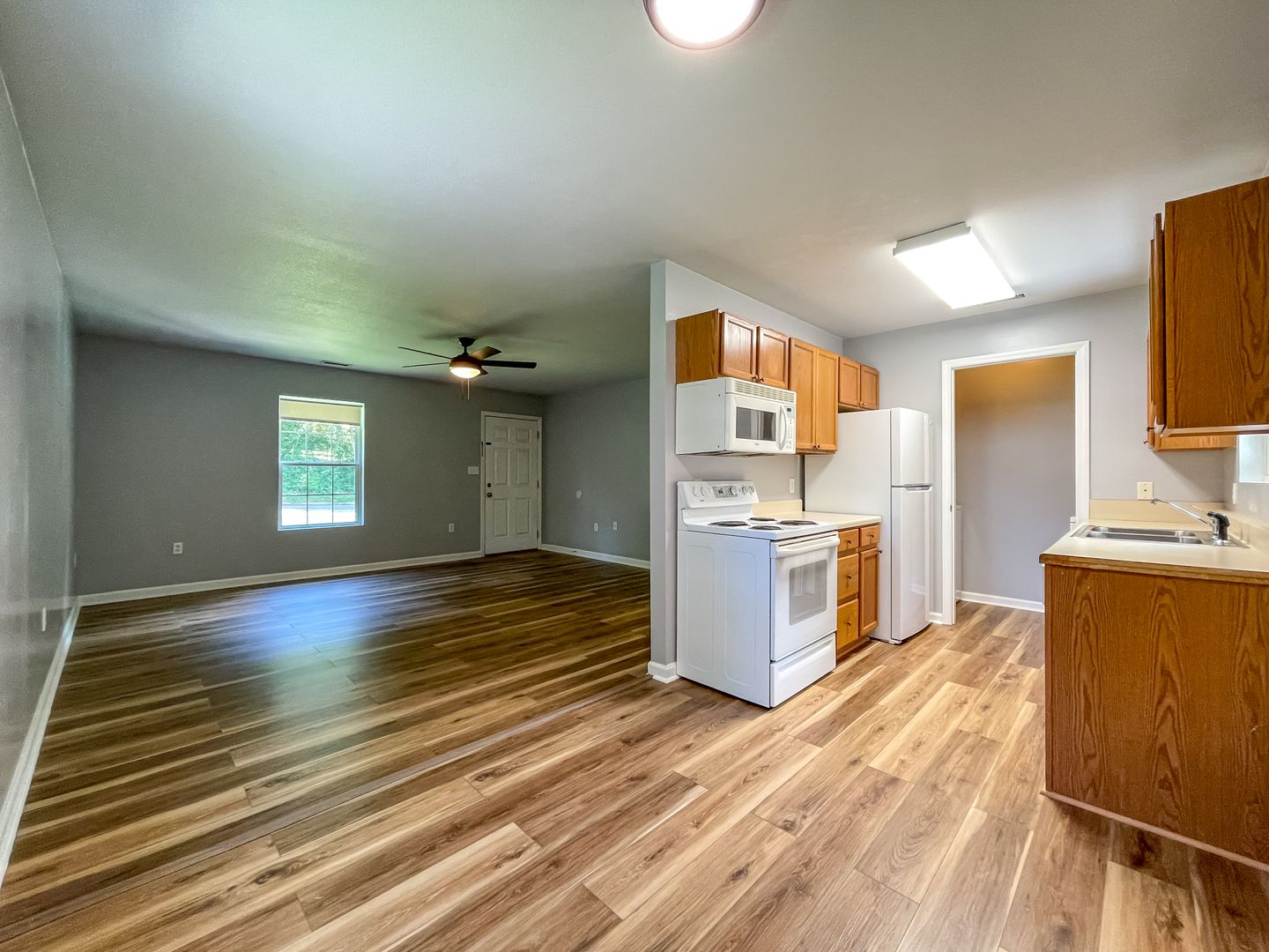 The kitchen is outfitted with a refrigerator, electric range, built-in microwave, and dishwasher. The spacious living room features new luxury vinyl plank flooring. The master bedroom has a large, walk-in closet. Central heat and air as well as ceiling fans throughout help keep you comfortable year-round. The back features a deck overlooking a large yard backing up to a small creek.