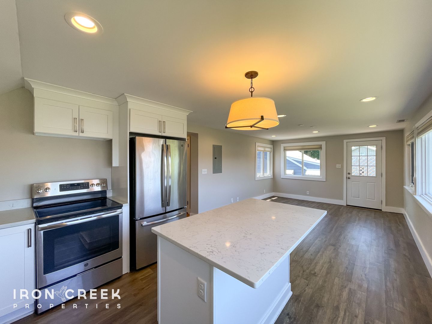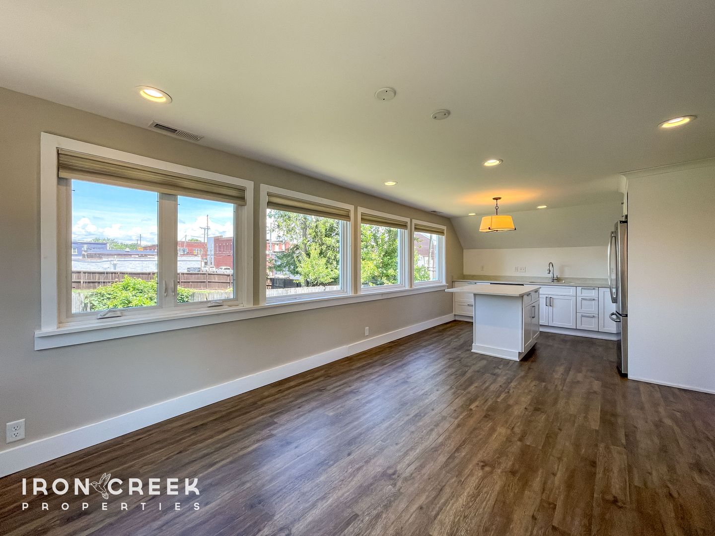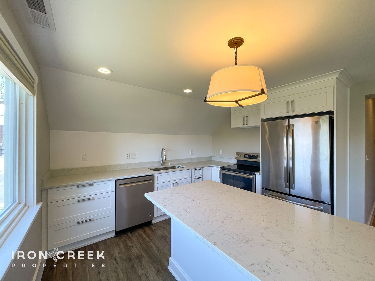 Upstairs offers two additional bedrooms under dormered ceilings with hardwood floors, a full bathroom with subway tile tub/shower surround, and a complete second kitchen with quartz-topped island, stainless steel appliances, and a bank of windows filling the open living area with natural light. A private exterior entrance serves the upper level.