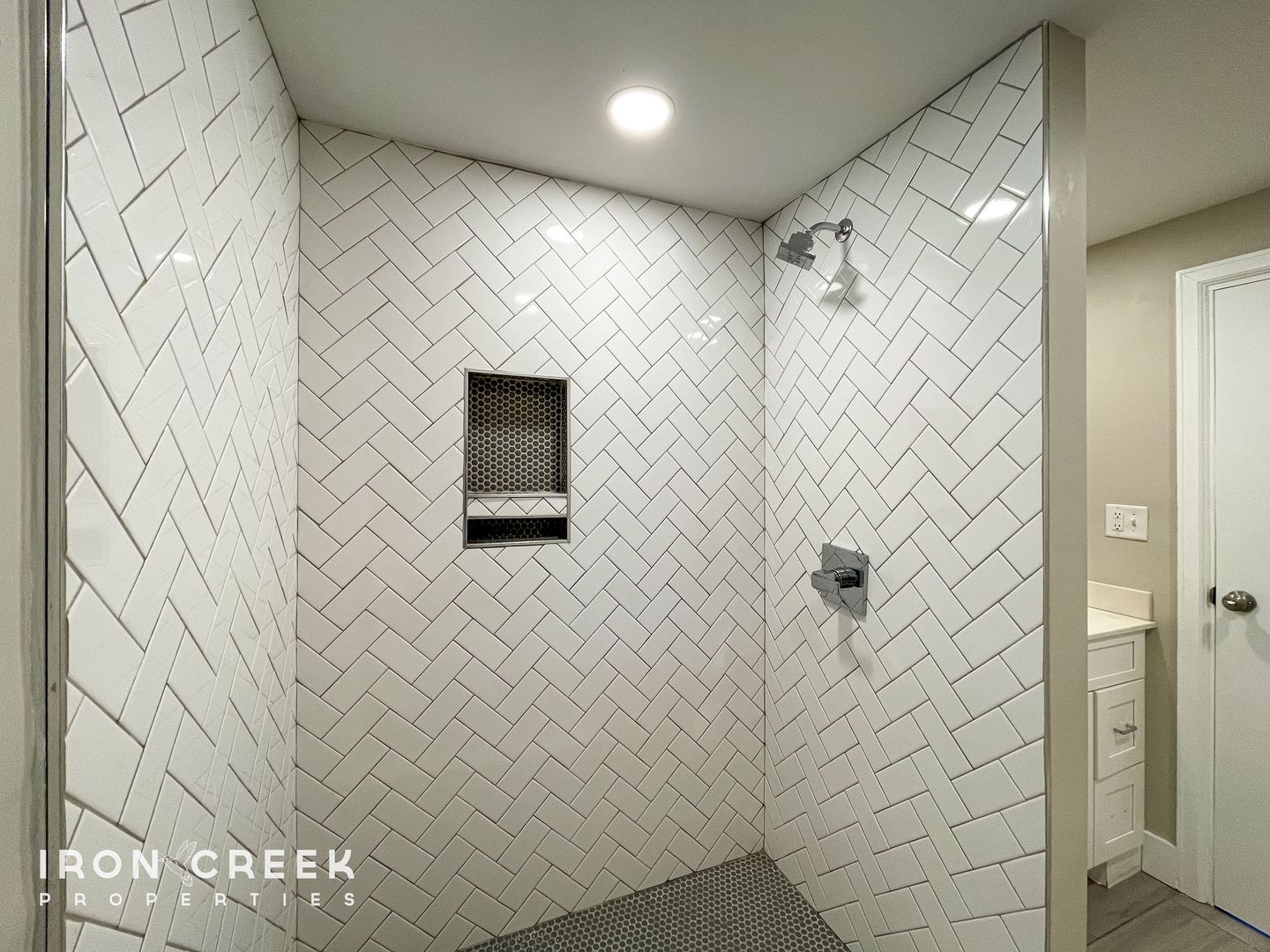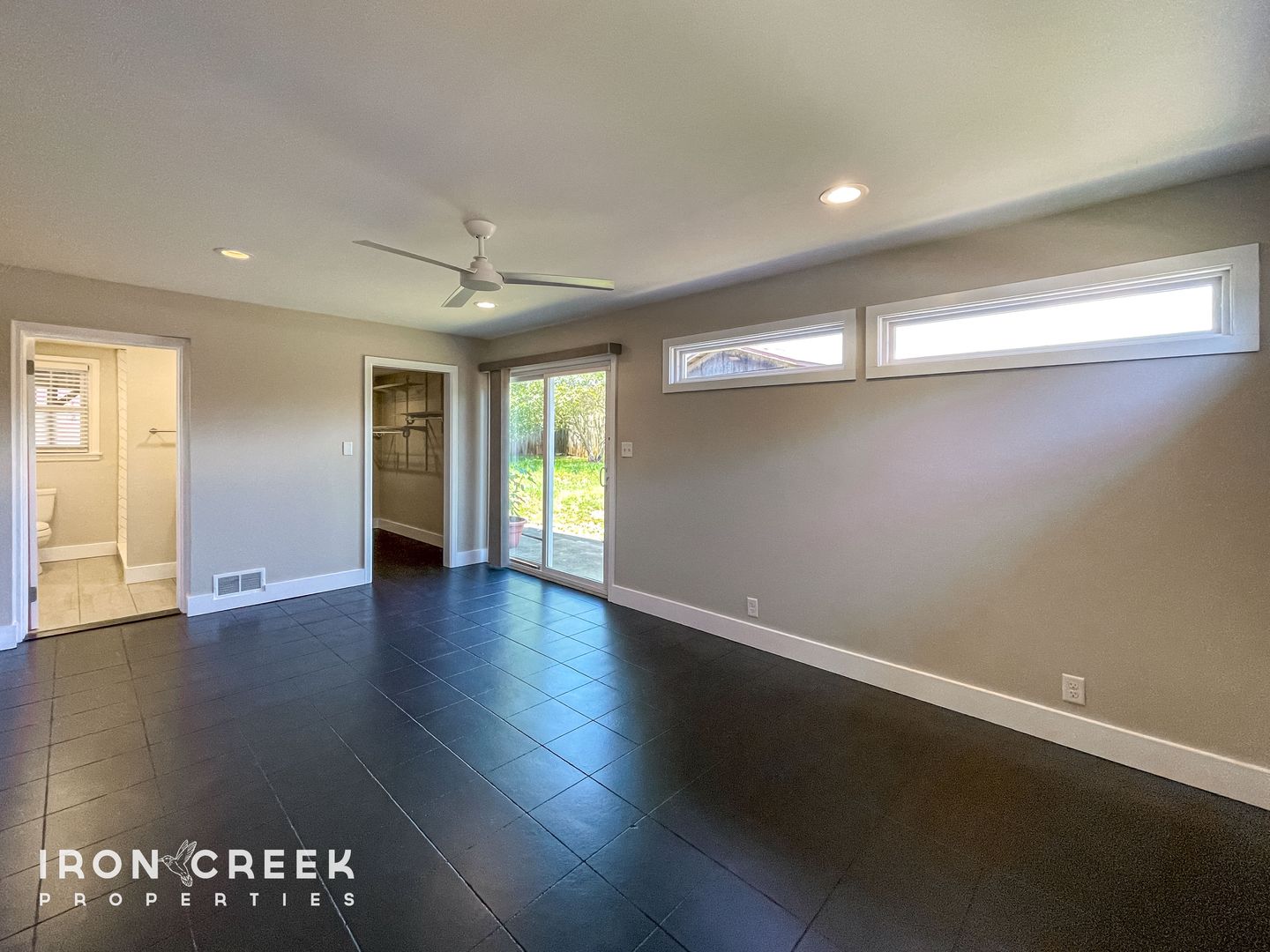 The primary suite occupies its own wing off the main level, offering a two-room layout: a bedroom anteroom leading into a larger living space with dark tile flooring, clerestory windows, and a sliding glass door to the side yard. A walk-in closet and dedicated bathroom round out the suite, finished with herringbone-pattern tile in a walk-in shower, penny tile flooring, and a built-in shower niche.