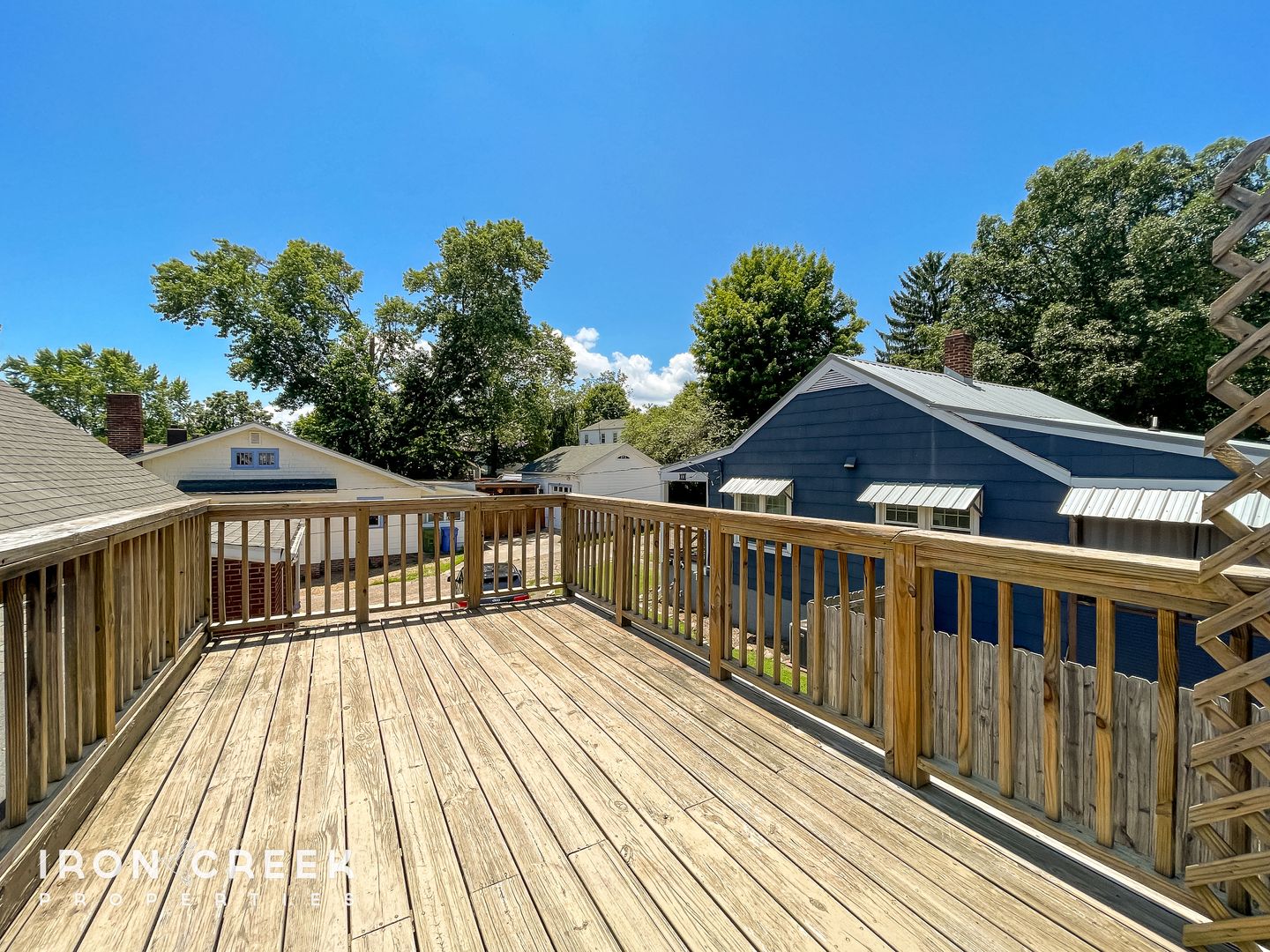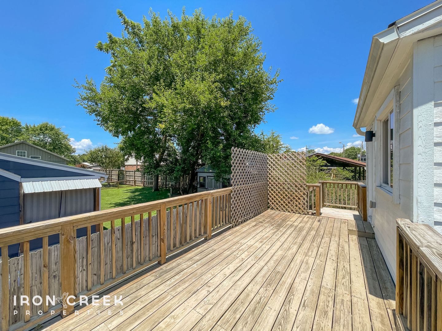 Hardwood floors run throughout the main level and upstairs, with LVP in the upper-level living area and kitchen. Two separate laundry rooms in the basement each include a washer and dryer — one accessible through an exterior door for upper-level convenience. Outside, an elevated wood deck overlooks the yard, which is fenced on three sides, with a concrete patio below and driveway parking at the rear.