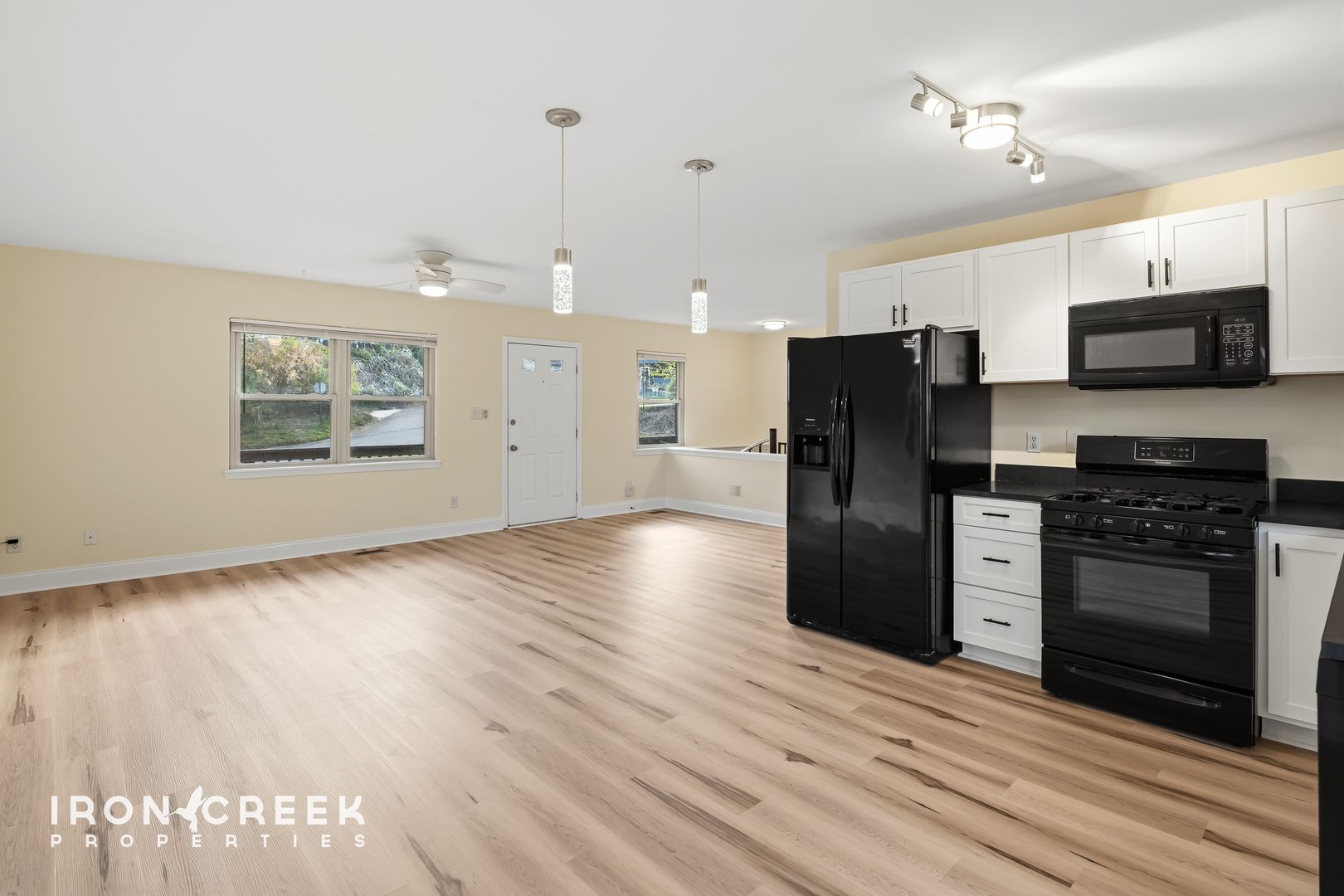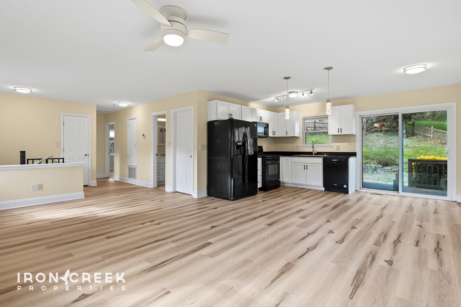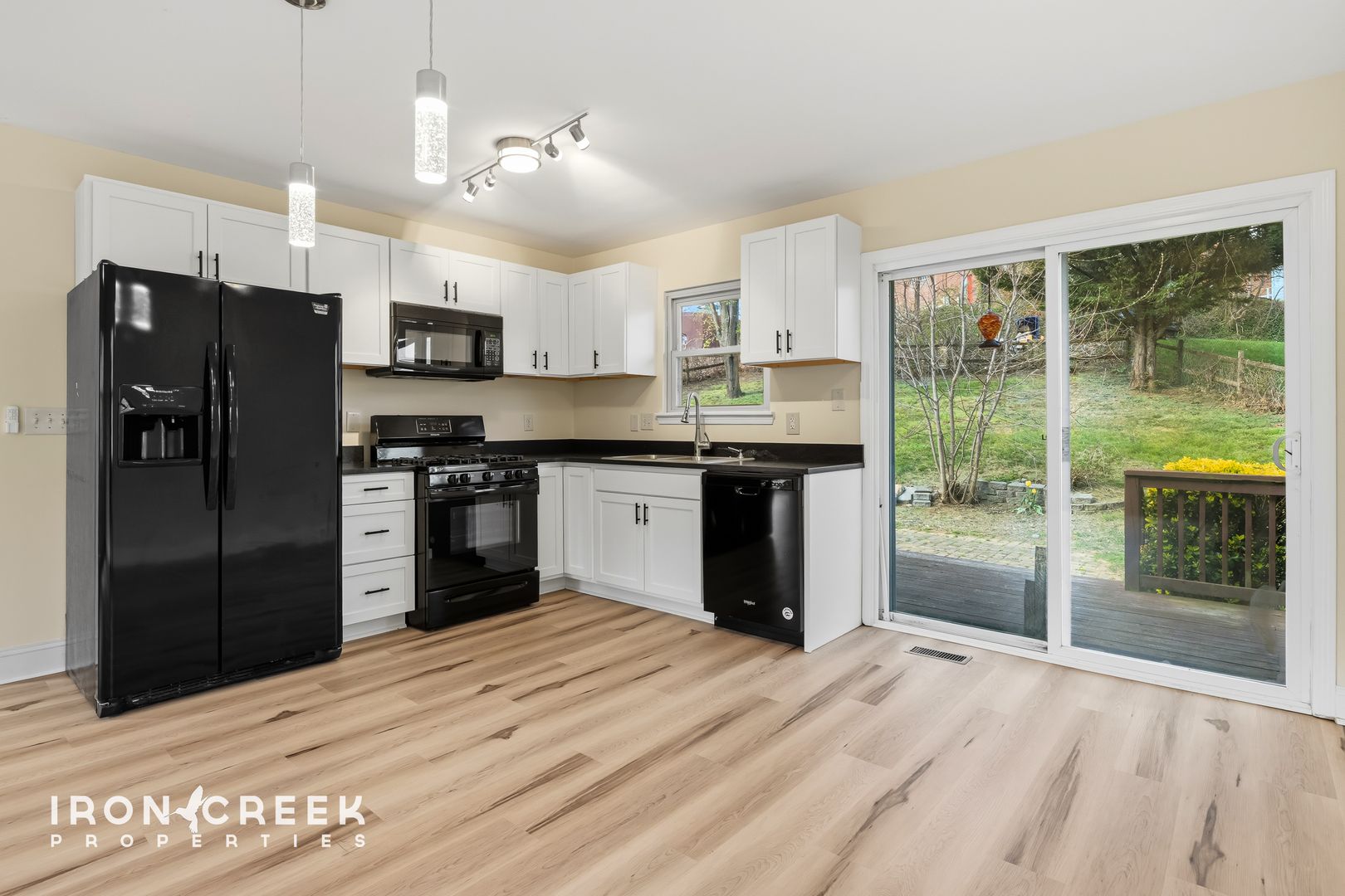 Inside, the main living area features brand new LVP flooring throughout and fresh paint. The kitchen is outfitted with brand new granite countertops and wood cabinets, a gas range, French door refrigerator with built-in ice maker, over-the-range microwave, and dishwasher — all in black finish. A walk-in pantry provides dedicated dry storage. A sliding glass door off the kitchen opens directly to the rear deck and backyard.