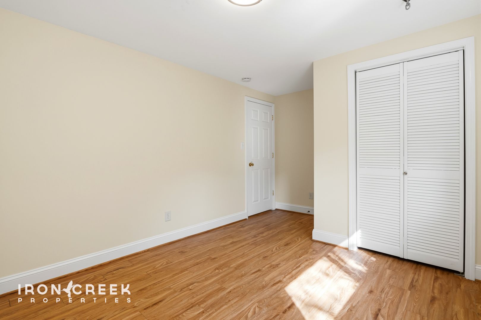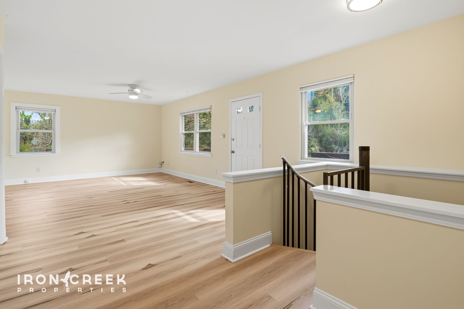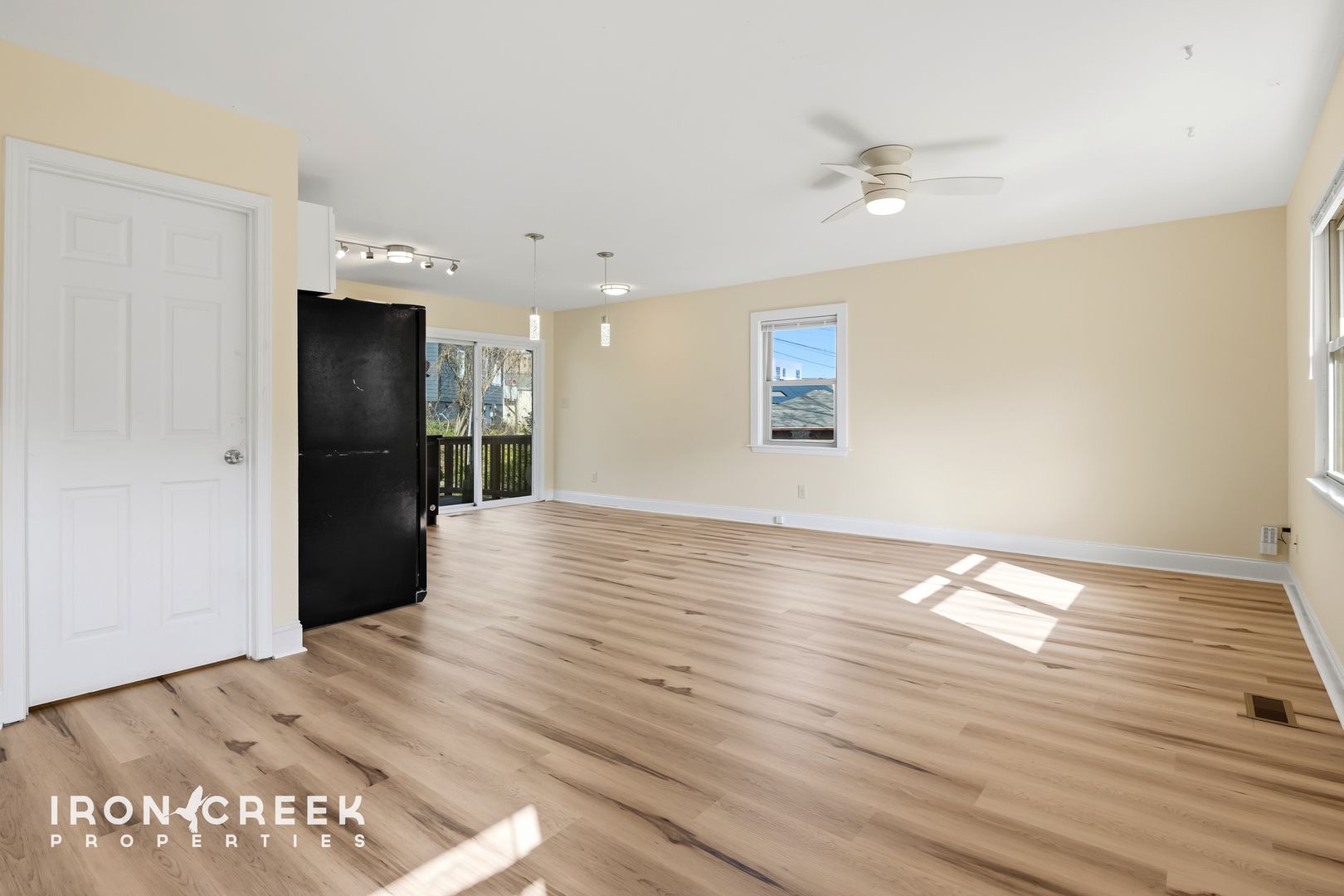 Inside, the main living area features brand new LVP flooring throughout and fresh paint. The kitchen is outfitted with brand new granite countertops and wood cabinets, a gas range, French door refrigerator with built-in ice maker, over-the-range microwave, and dishwasher — all in black finish. A walk-in pantry provides dedicated dry storage. A sliding glass door off the kitchen opens directly to the rear deck and backyard.