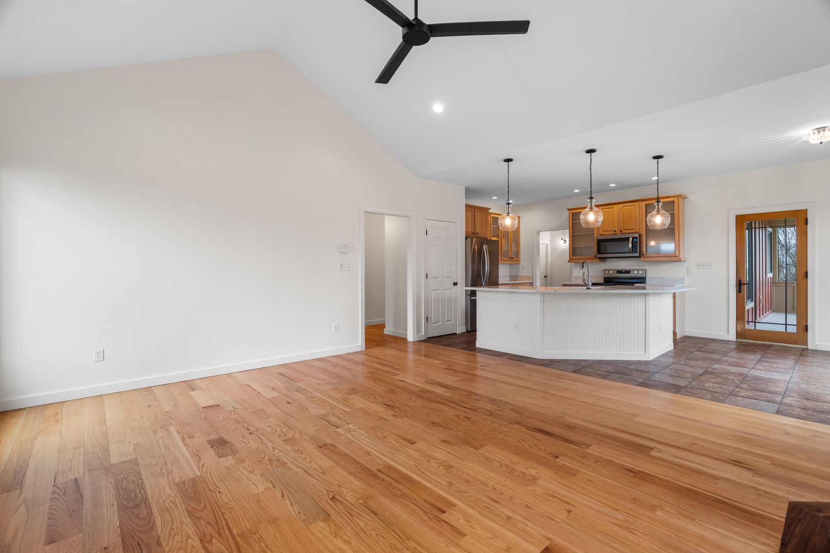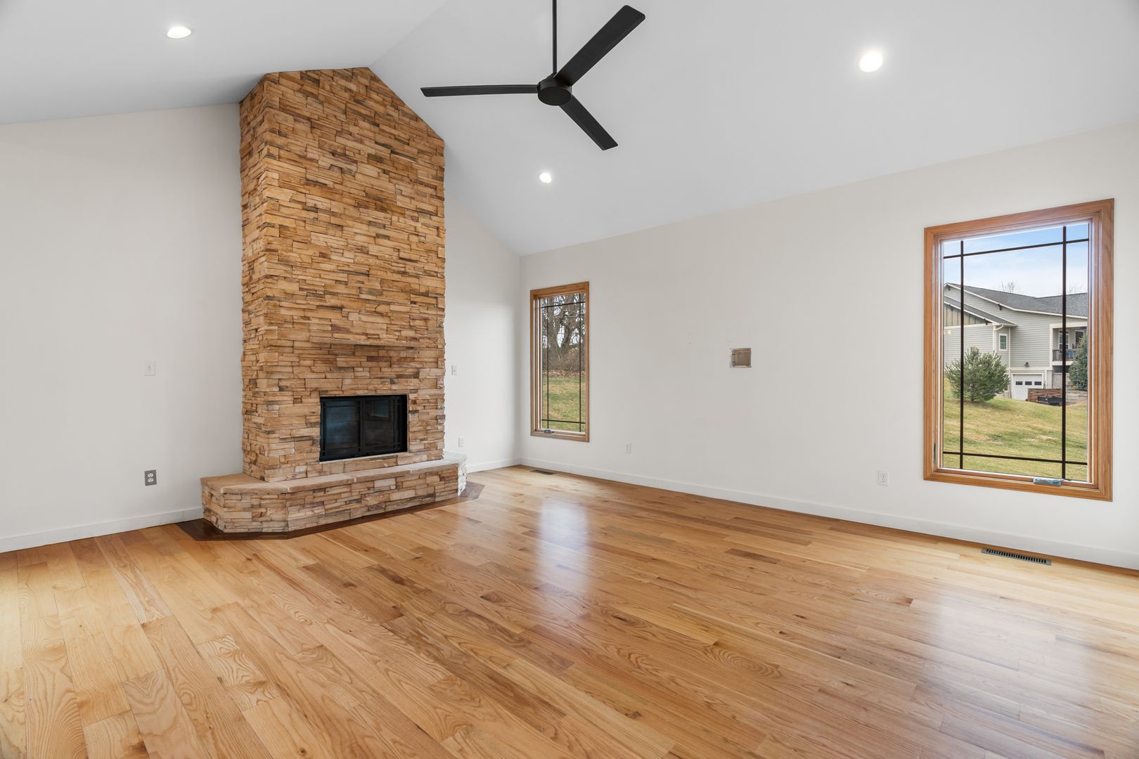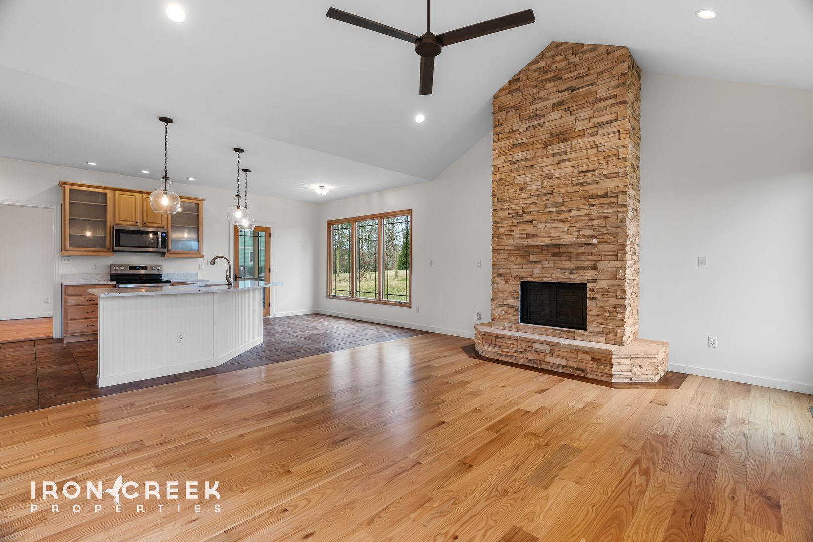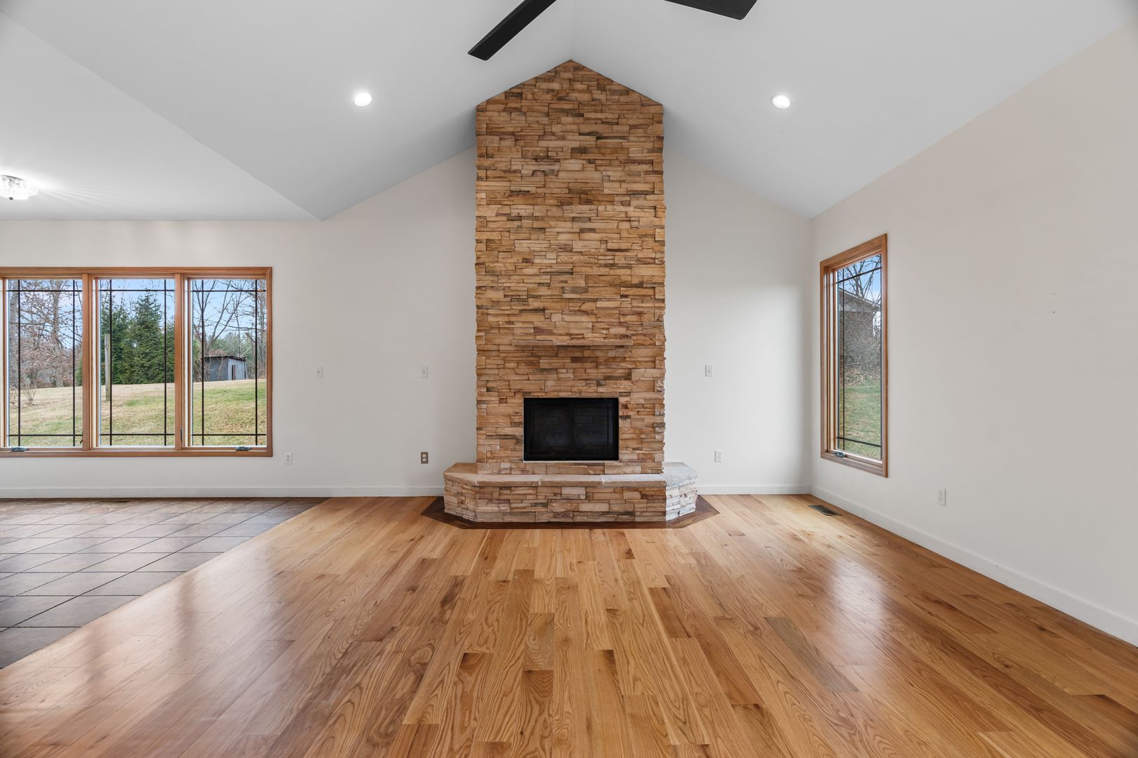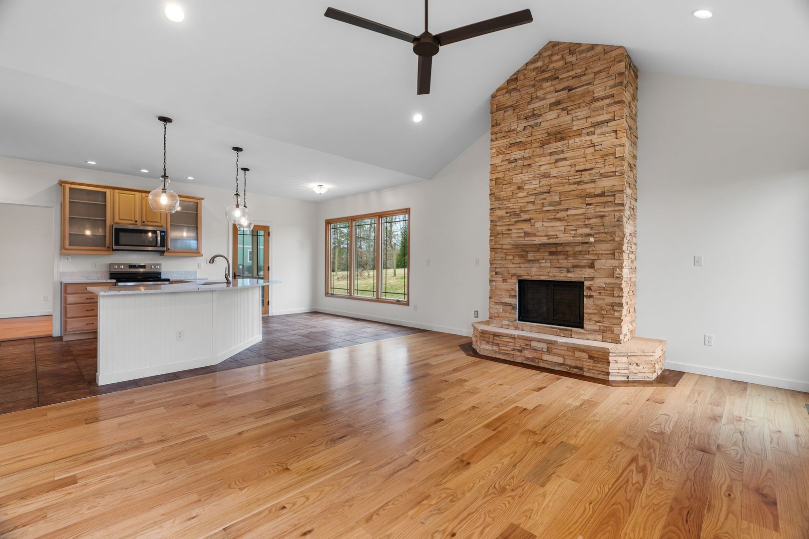 The main level welcomes you with an open-concept layout featuring hardwood floors throughout the living spaces. The great room centers around a dramatic floor-to-ceiling stone gas fireplace with propane logs beneath soaring vaulted ceilings, creating an impressive focal point for gathering and entertaining.