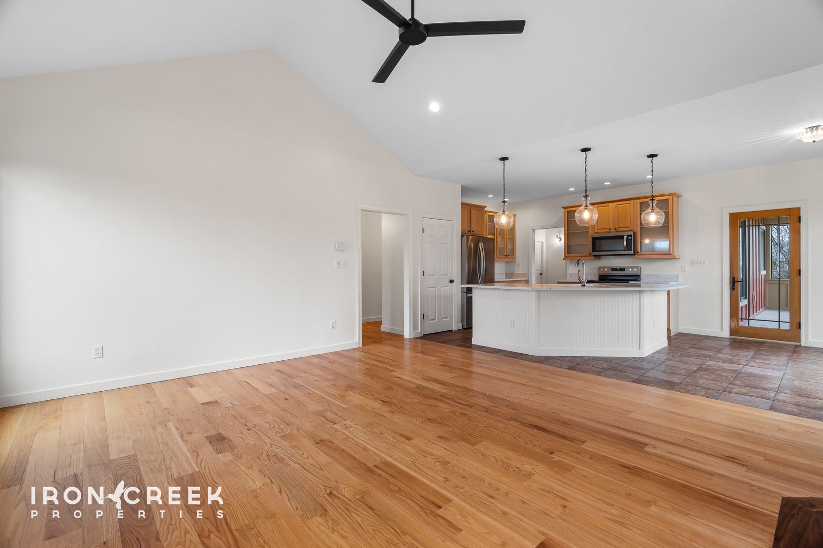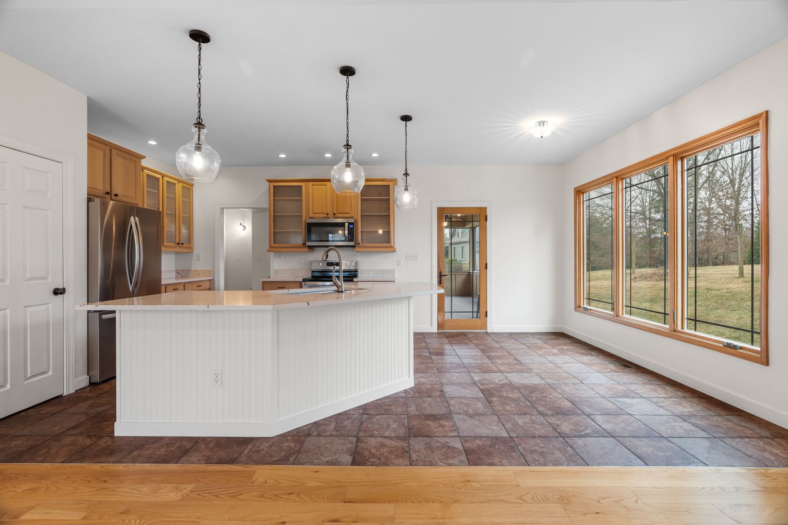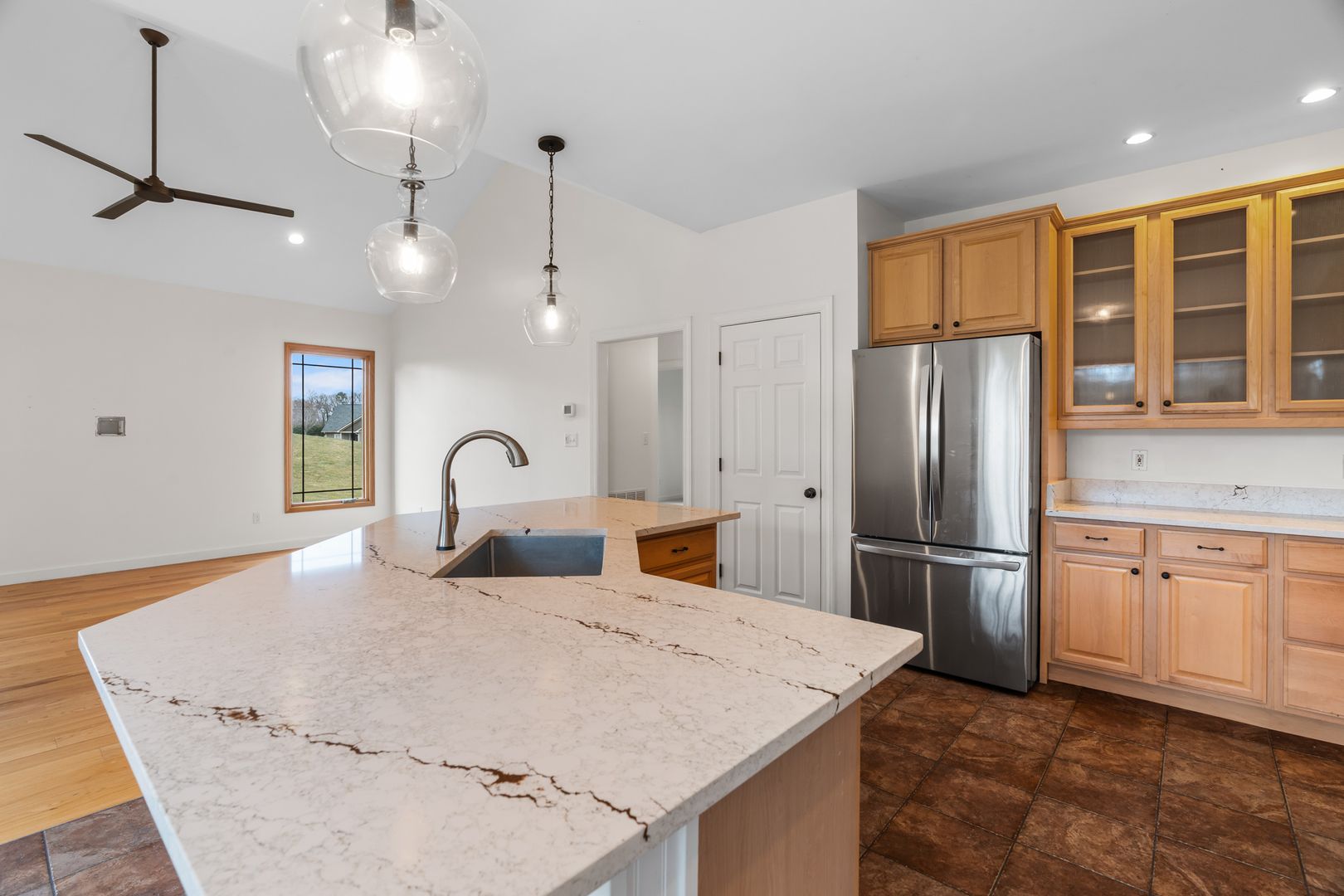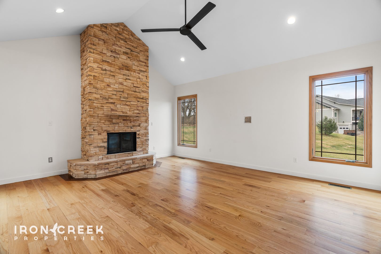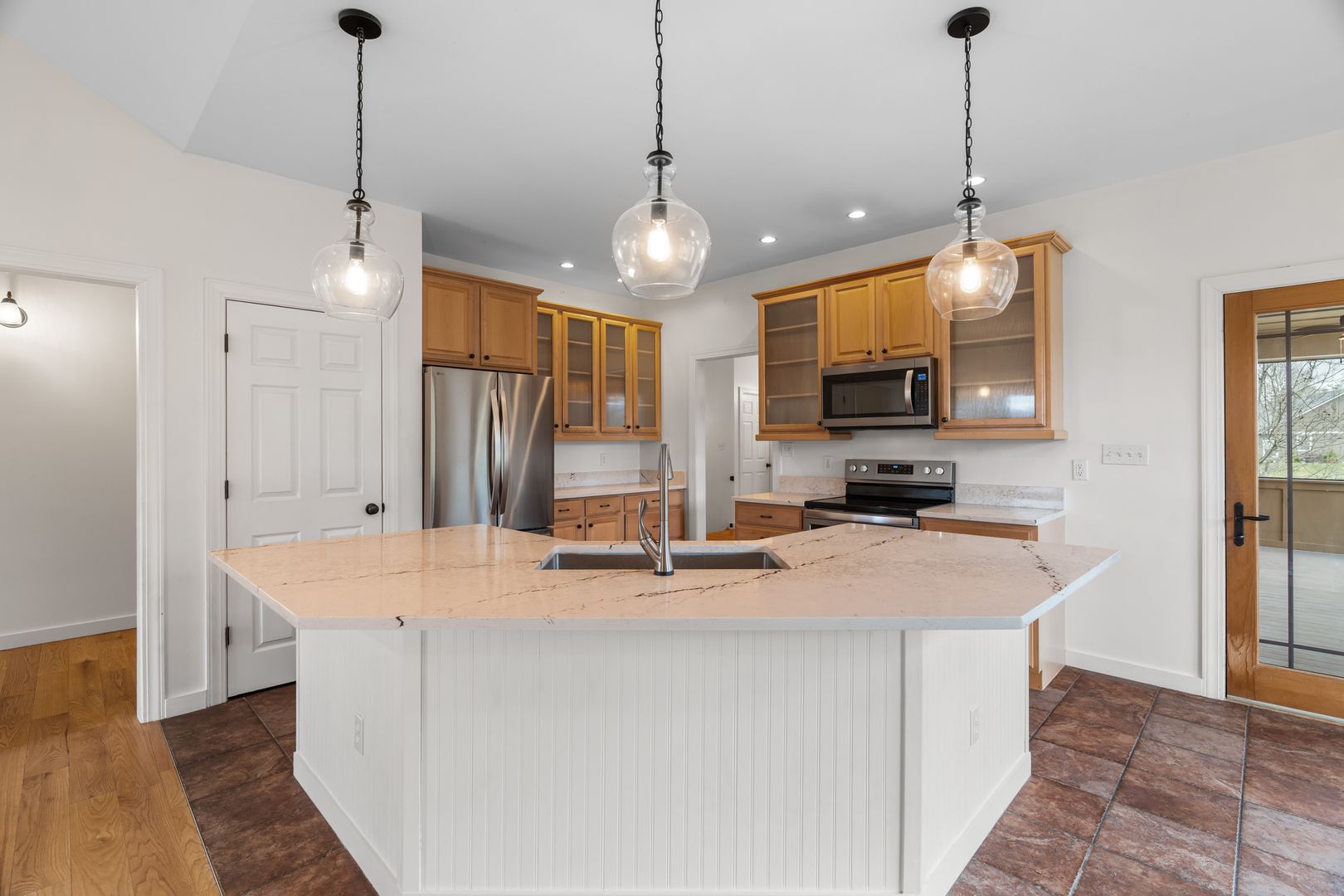 The main level welcomes you with an open-concept layout featuring hardwood floors throughout the living spaces. The great room centers around a dramatic floor-to-ceiling stone gas fireplace with propane logs beneath soaring vaulted ceilings, creating an impressive focal point for gathering and entertaining.