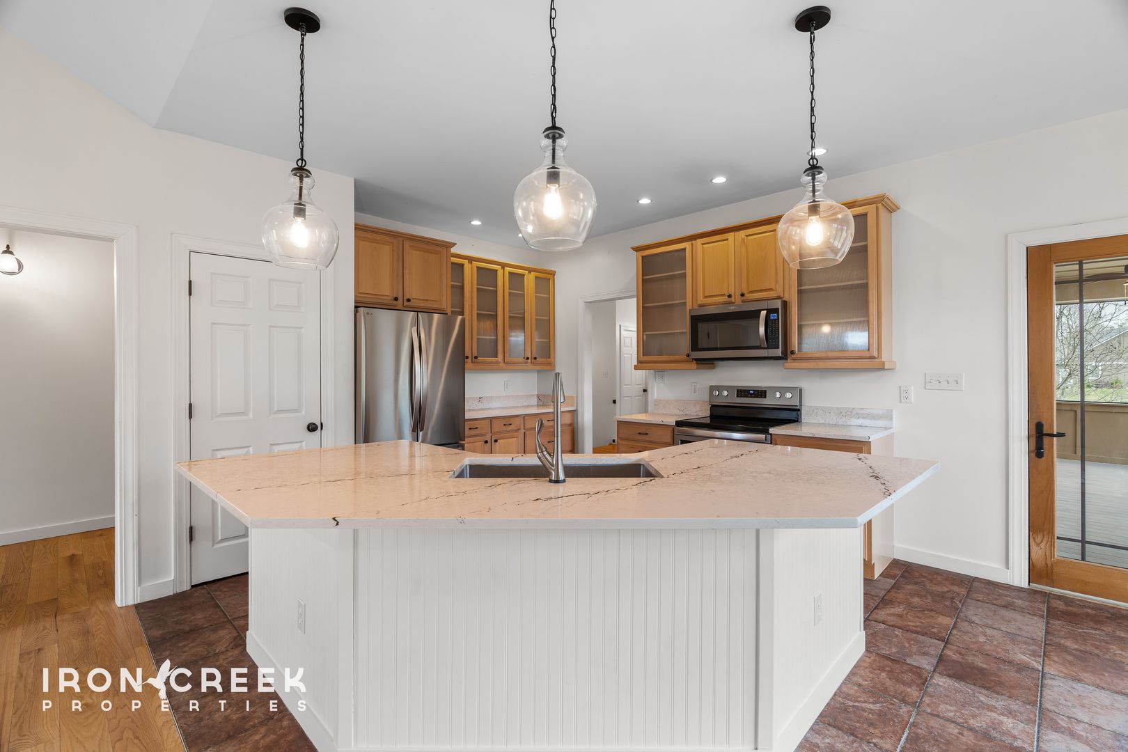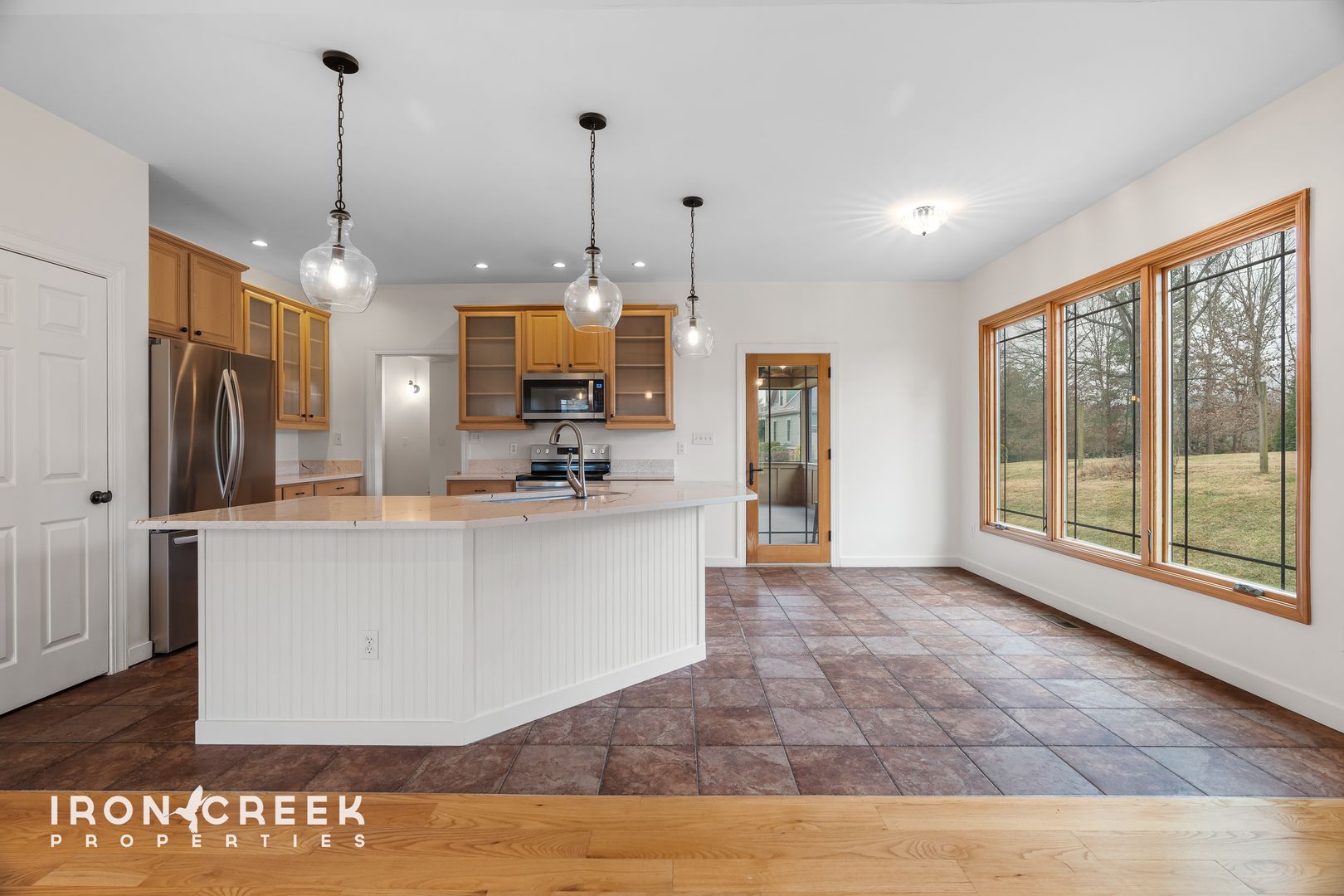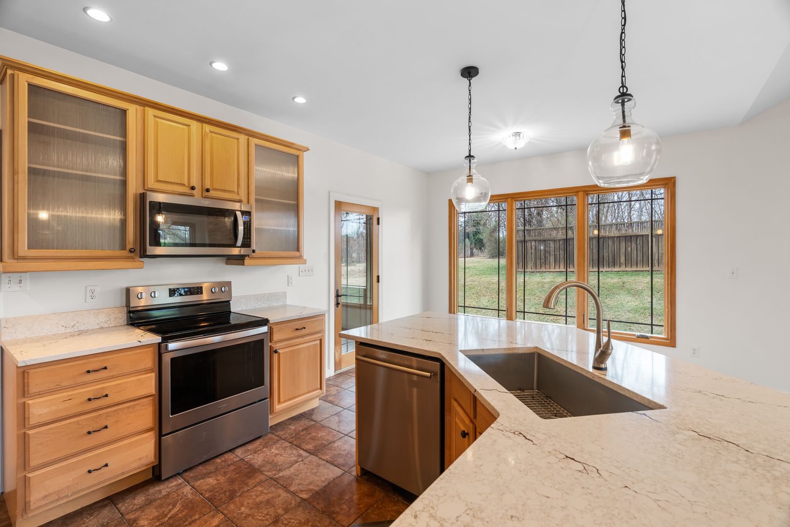 The kitchen is outfitted with stainless steel appliances including a French door refrigerator with ice maker, over-the-range microwave, electric range, and built-in dishwasher, plus a garbage disposal. Quartz countertops span the workspace and extend to the kitchen island with breakfast bar seating. Glass-front wood cabinets add character while providing display space. Large southwest-facing windows bring in plentiful natural light and evening warmth throughout the year, with views of the tree-lined backyard. Adjacent to the kitchen, a separate dining room with tray ceiling provides elegant space for meals and special occasions.