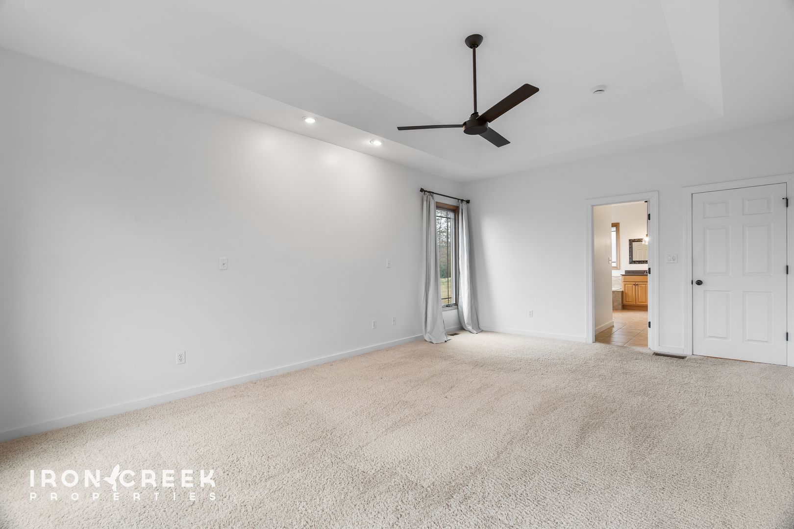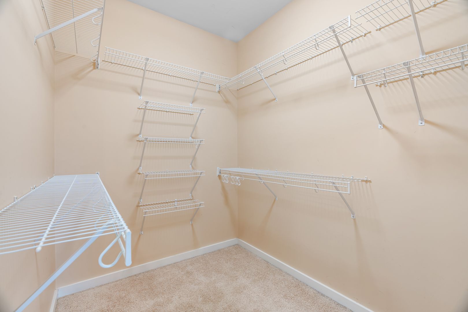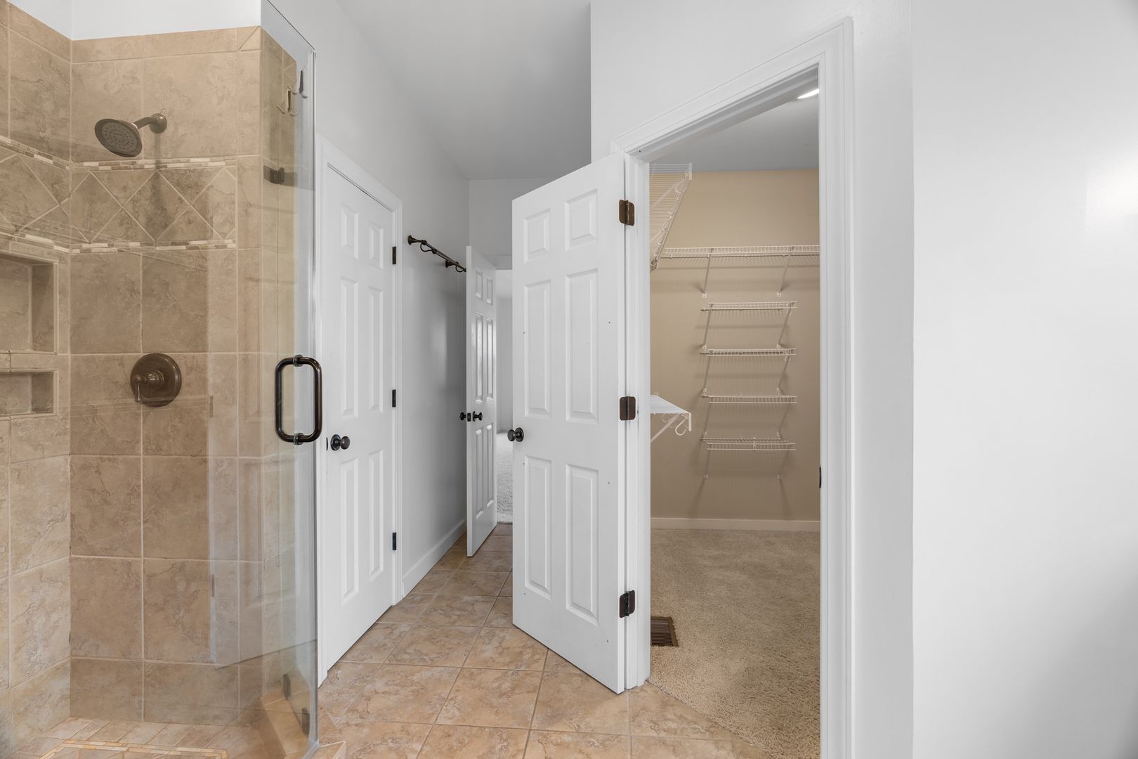 The primary suite on the main level features a tray ceiling, an ensuite bathroom with corner soaking tub, walk-in shower, and double vanity, plus a walk-in closet with built-in storage system. Two additional bedrooms on the main level offer carpet flooring and ample closet space.