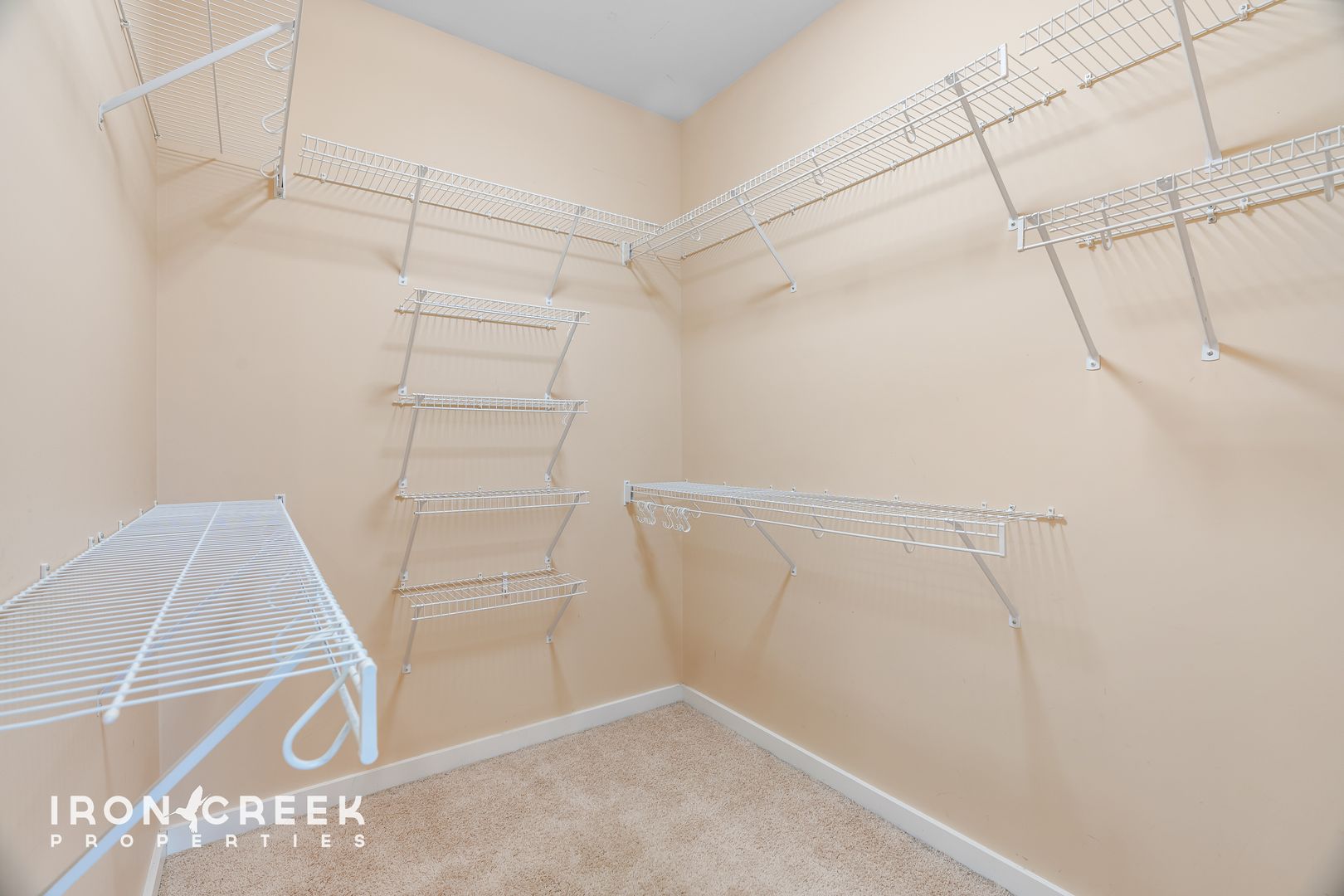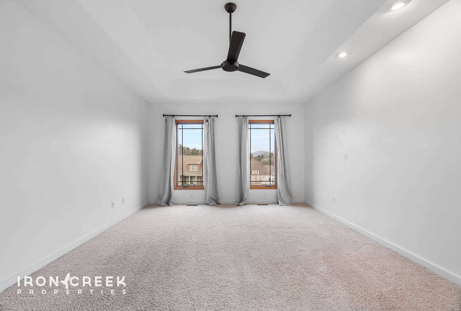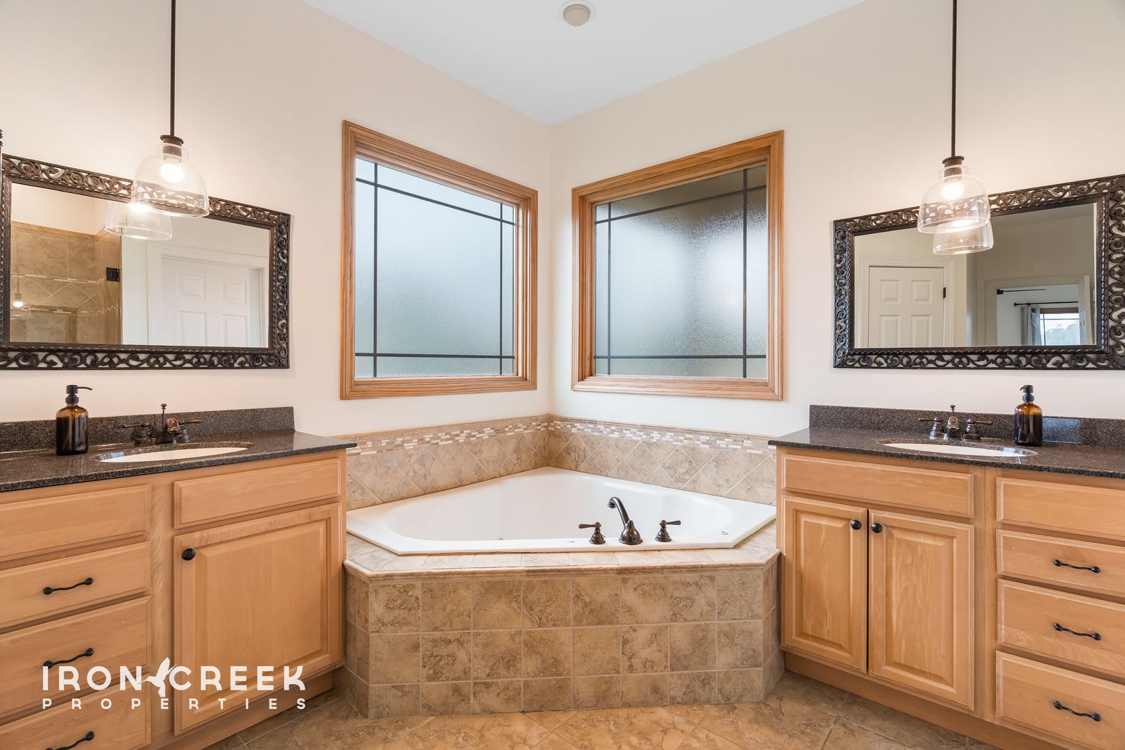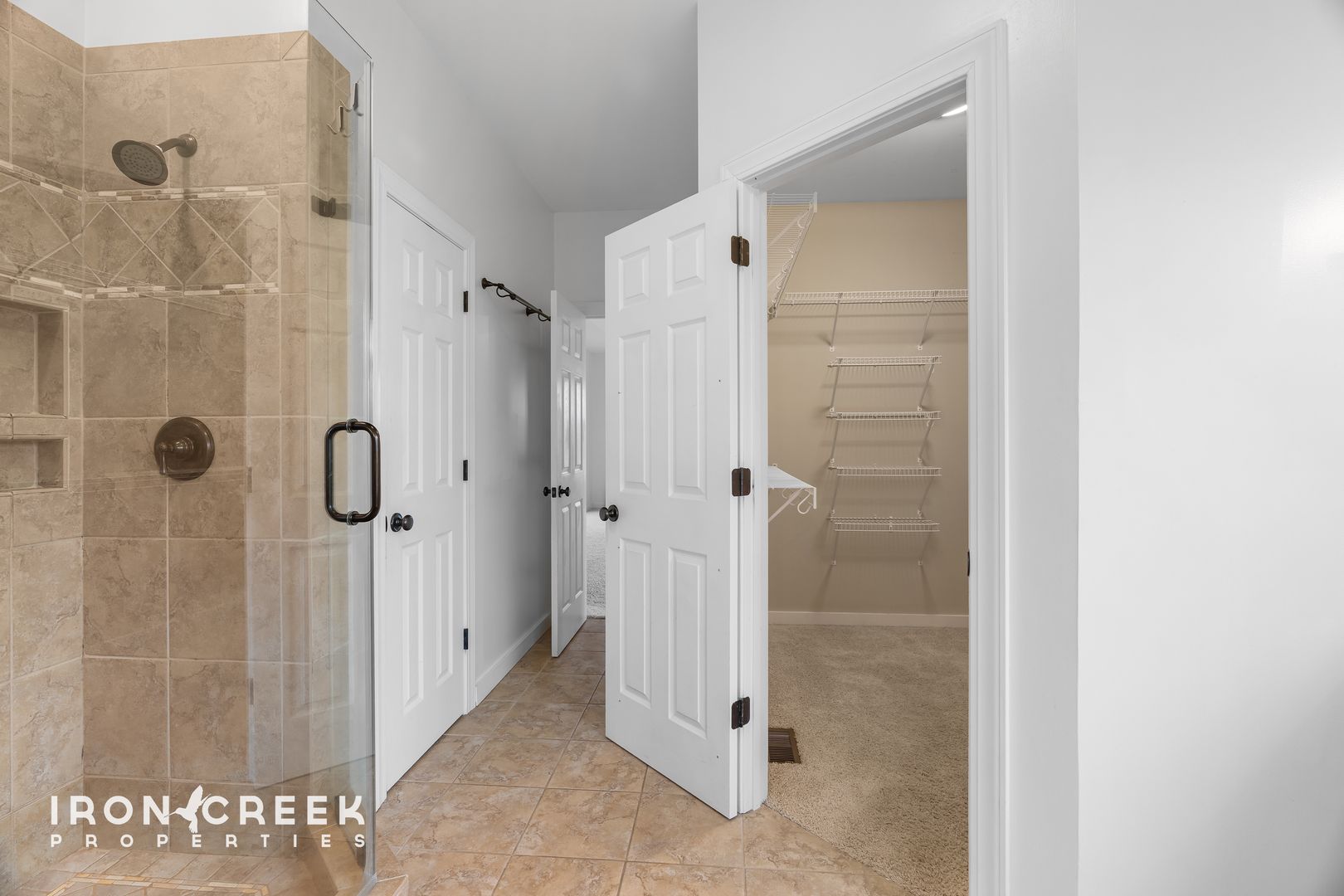 The primary suite on the main level features a tray ceiling, an ensuite bathroom with corner soaking tub, walk-in shower, and double vanity, plus a walk-in closet with built-in storage system. Two additional bedrooms on the main level offer carpet flooring and ample closet space.