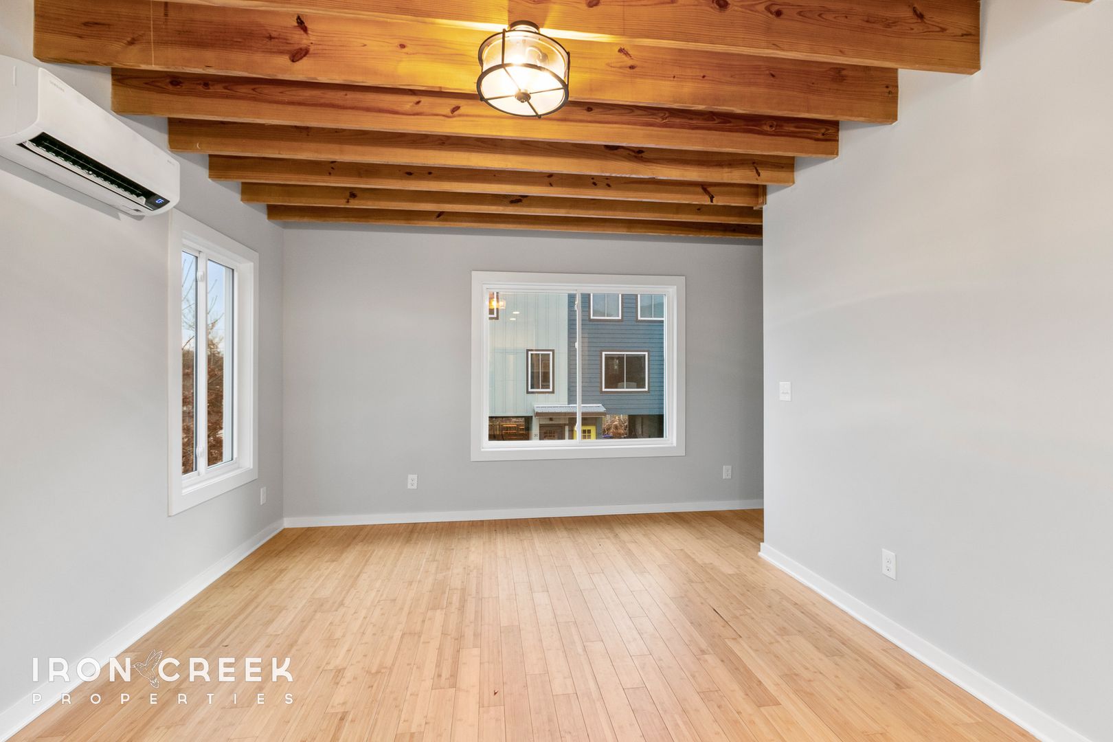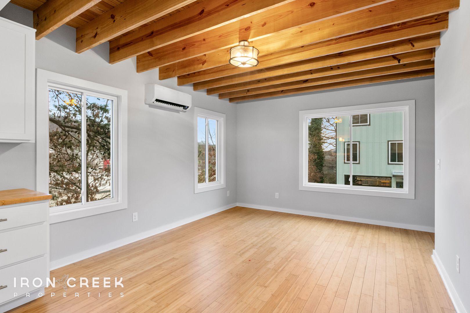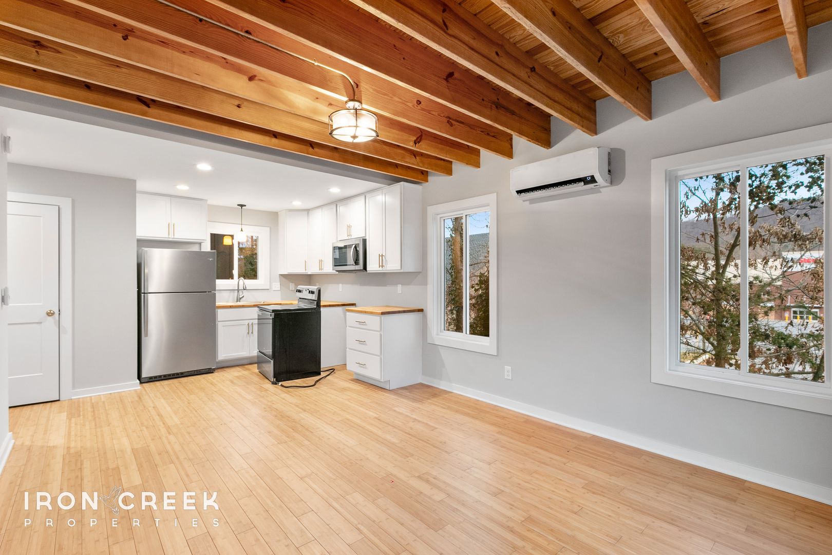 The kitchen is outfitted with an electric range, built-in microwave, dishwasher, refrigerator, stainless-steel sink, and plenty of cabinet and counter space. The exposed rafters and Edison bulbs add warmth to the living room. The bedrooms have large closets and extra storage nooks.