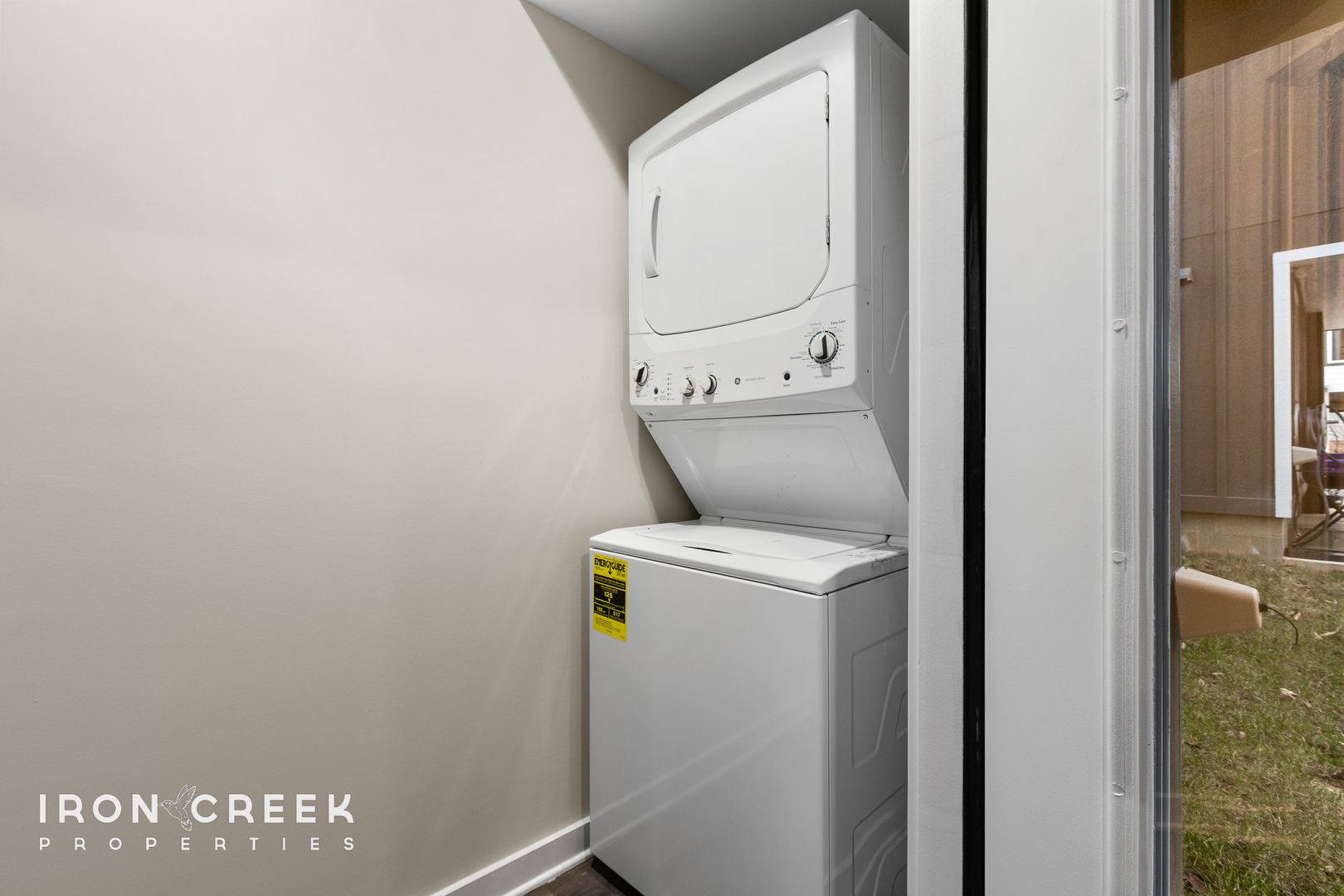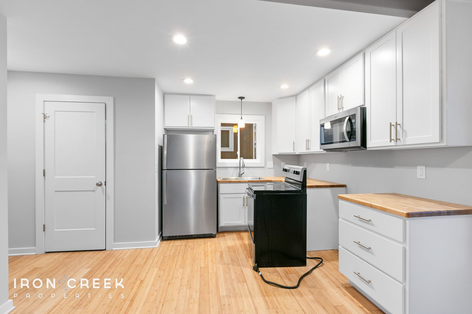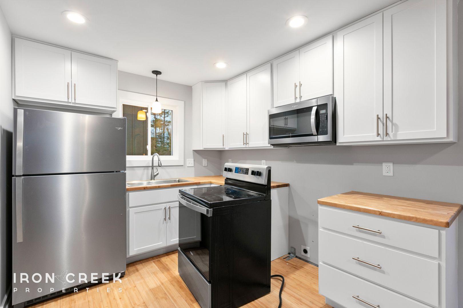 The kitchen is outfitted with an electric range, built-in microwave, dishwasher, refrigerator, stainless-steel sink, and plenty of cabinet and counter space. The exposed rafters and Edison bulbs add warmth to the living room. The bedrooms have large closets and extra storage nooks.