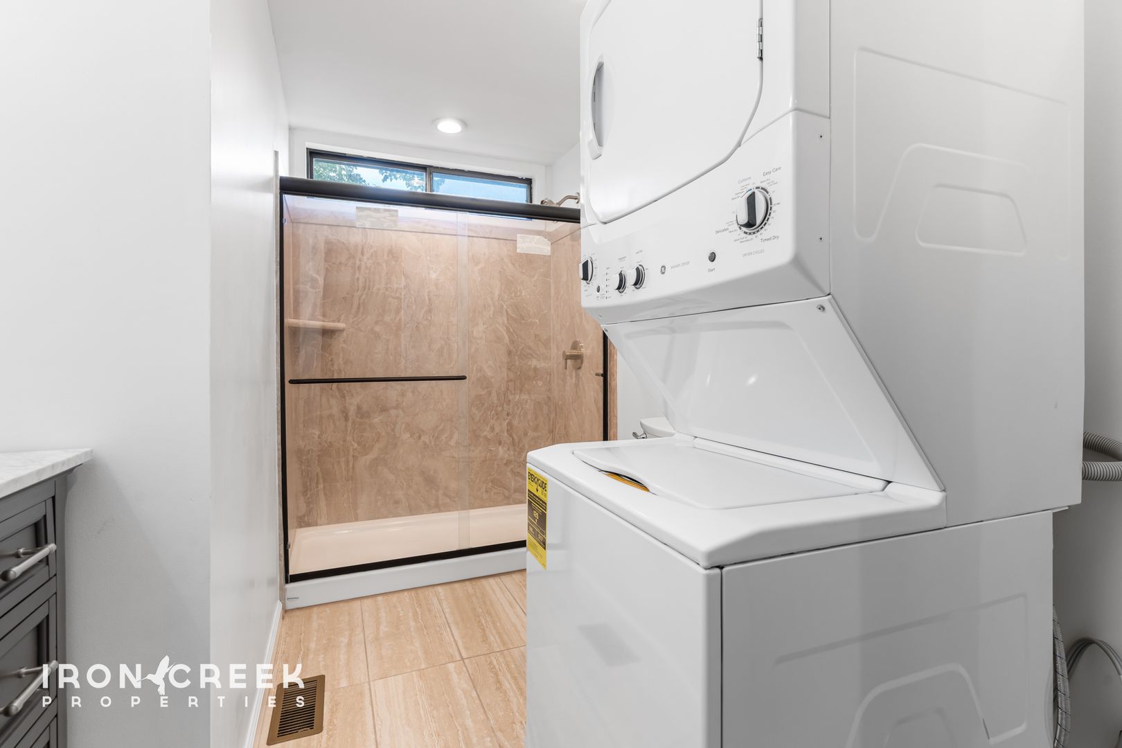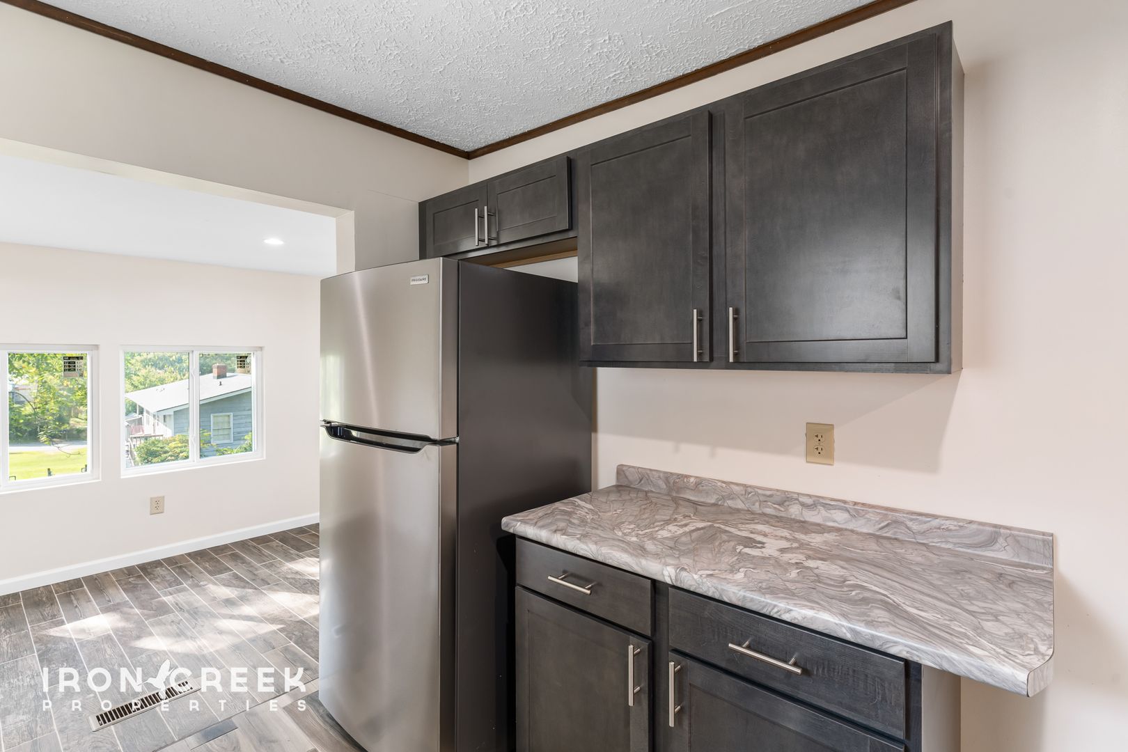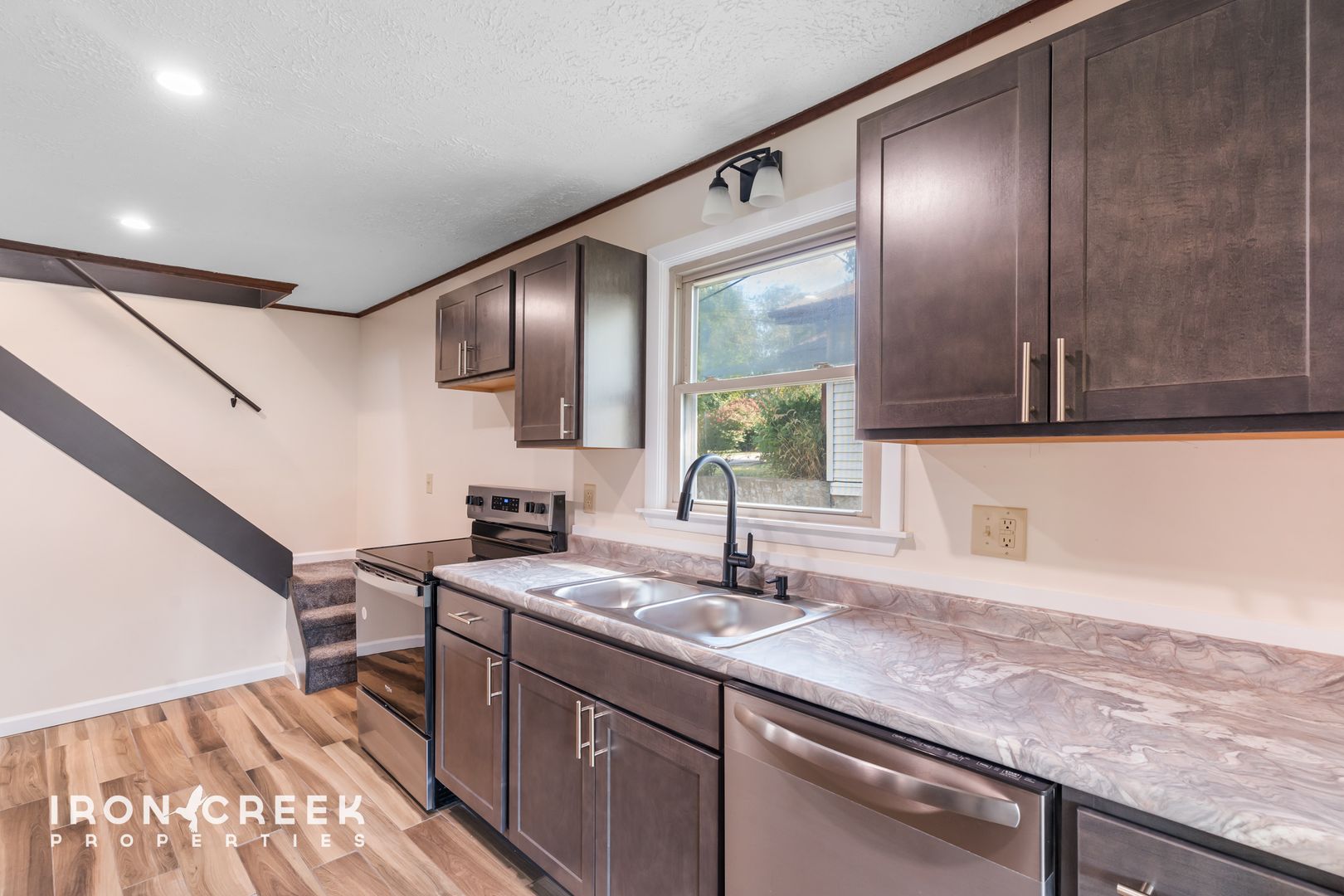 The main level features luxury vinyl plank flooring throughout living areas and wood-look luxury vinyl tile in the kitchen and entry. Two bedrooms on this level provide comfortable sleeping quarters. The kitchen is outfitted with a refrigerator with ice maker, dishwasher, and electric range, all in stainless steel finishes. Natural light fills the open spaces, and the updated full bath includes a walk-in shower with contemporary tile surround.