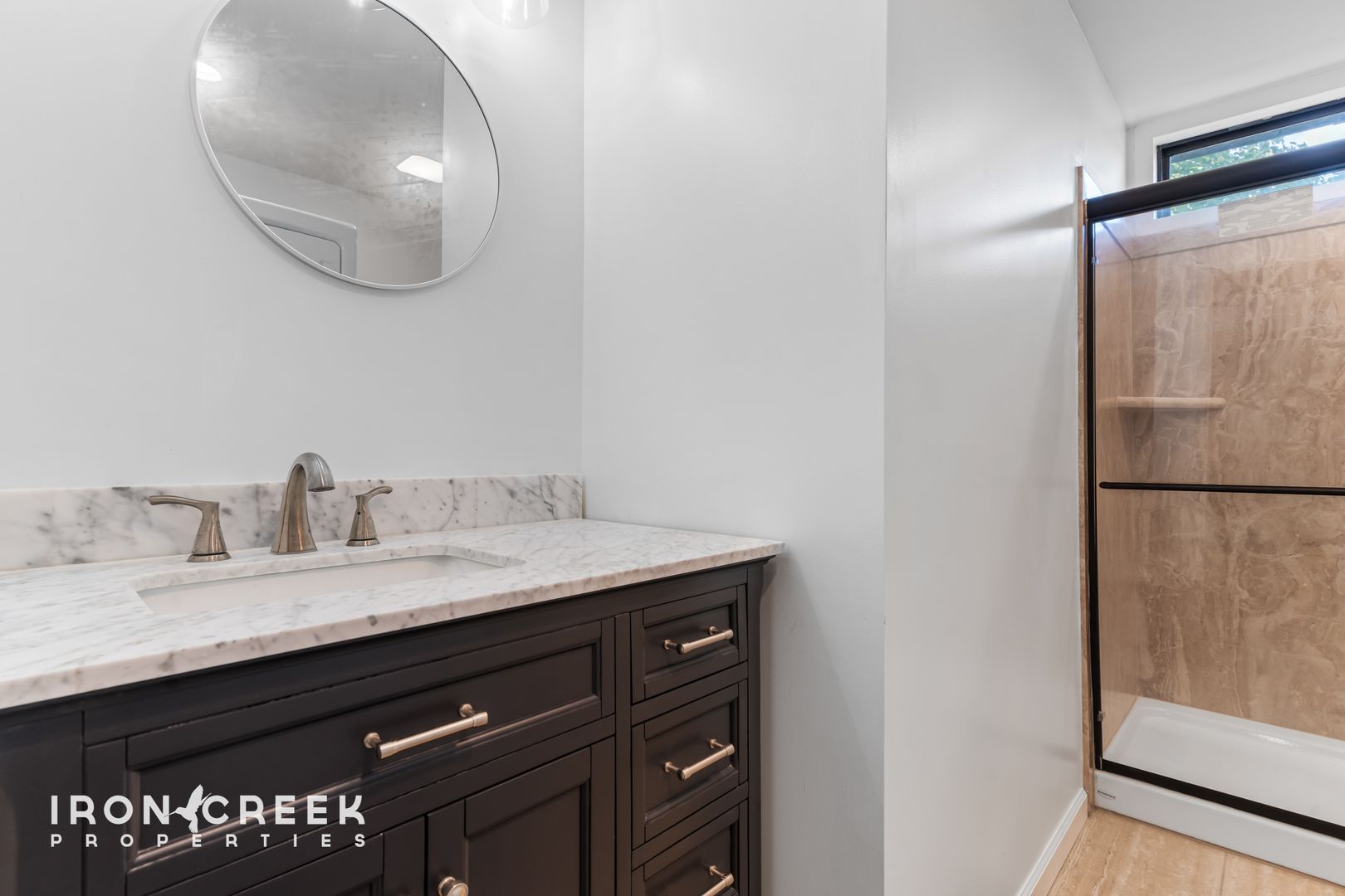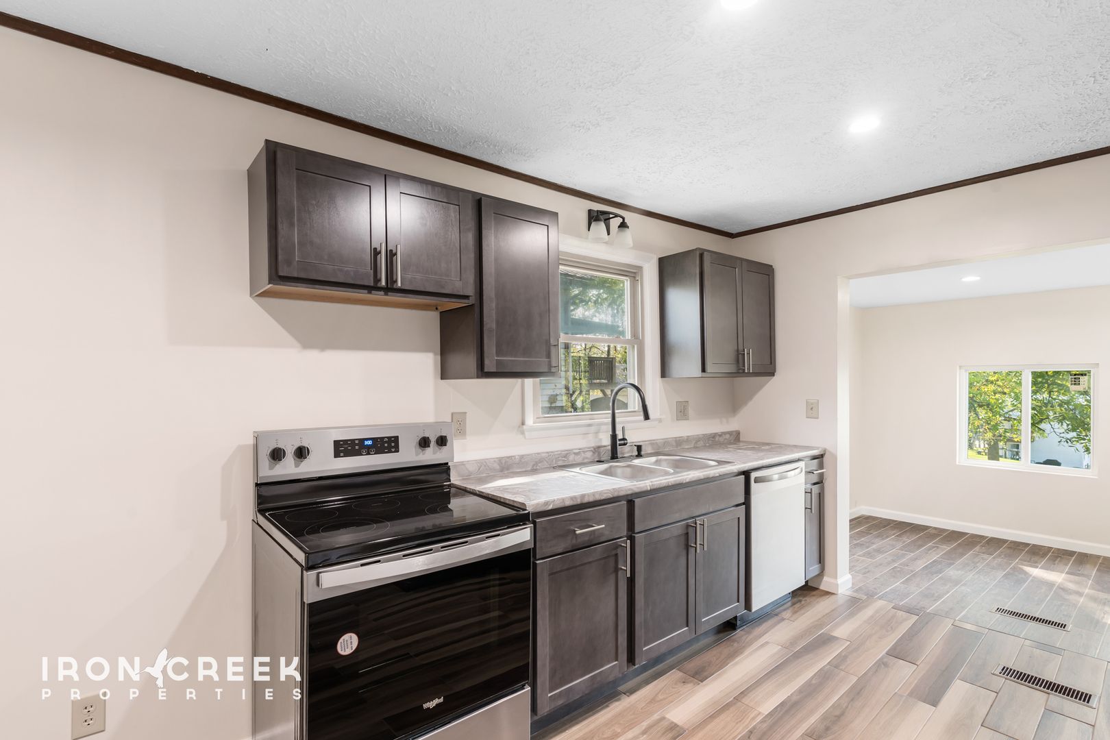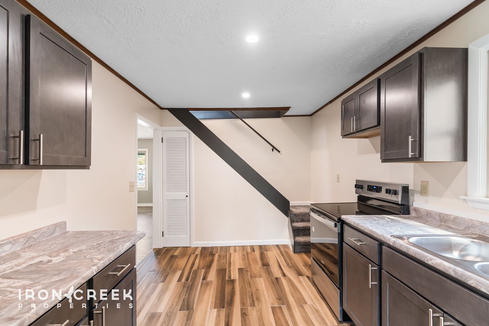 The main level features luxury vinyl plank flooring throughout living areas and wood-look luxury vinyl tile in the kitchen and entry. Two bedrooms on this level provide comfortable sleeping quarters. The kitchen is outfitted with a refrigerator with ice maker, dishwasher, and electric range, all in stainless steel finishes. Natural light fills the open spaces, and the updated full bath includes a walk-in shower with contemporary tile surround.
