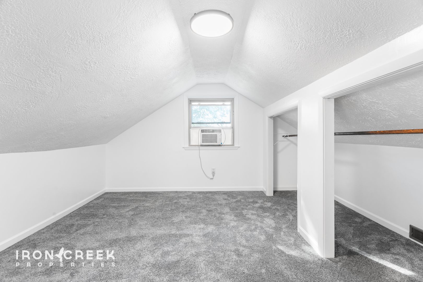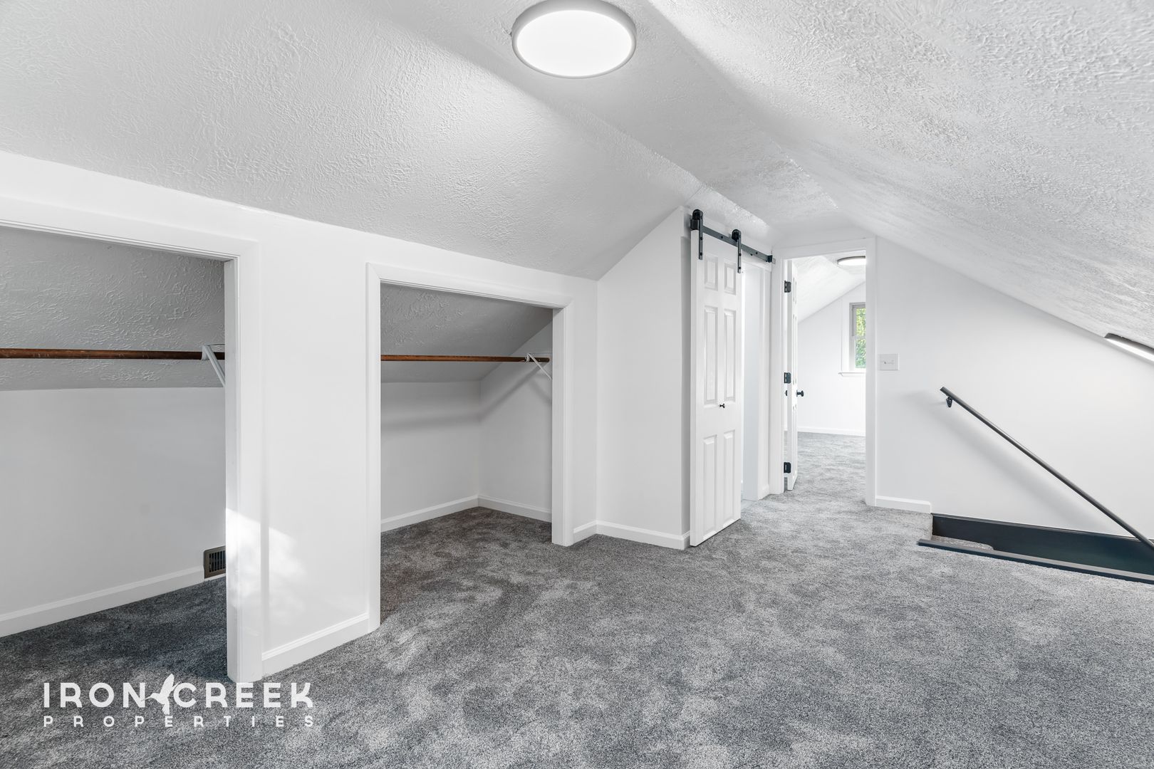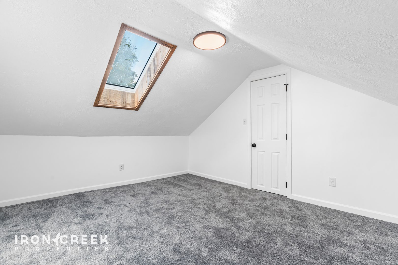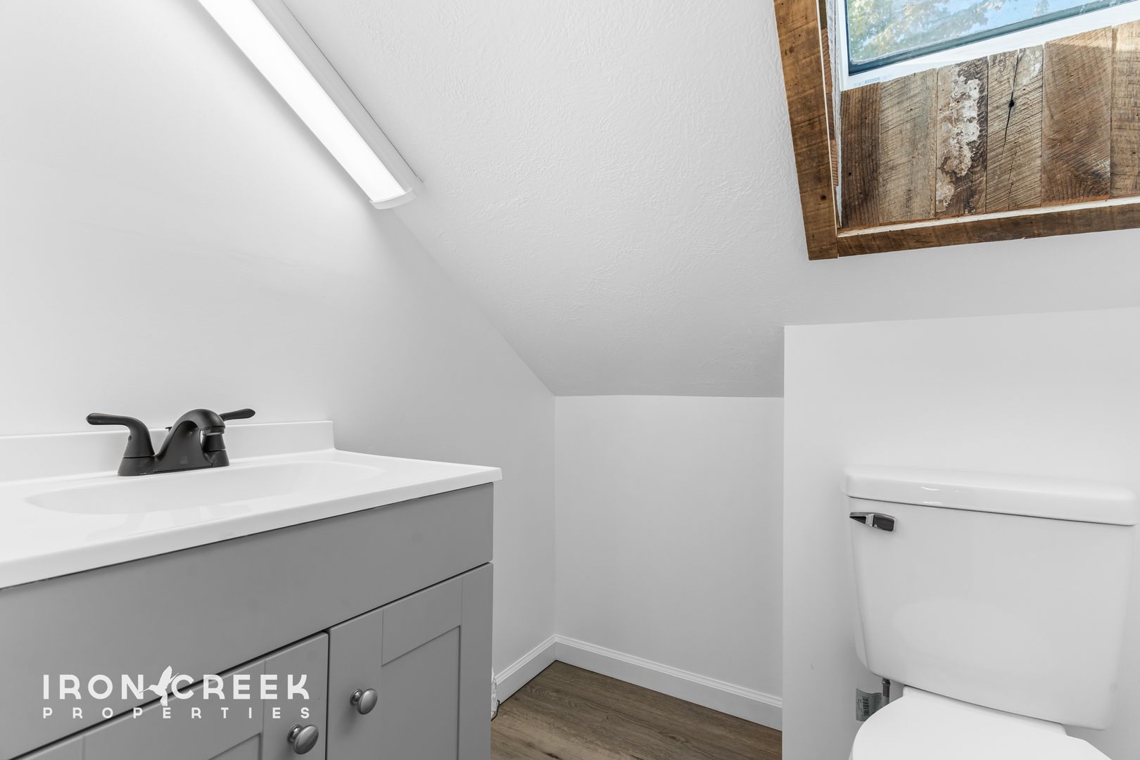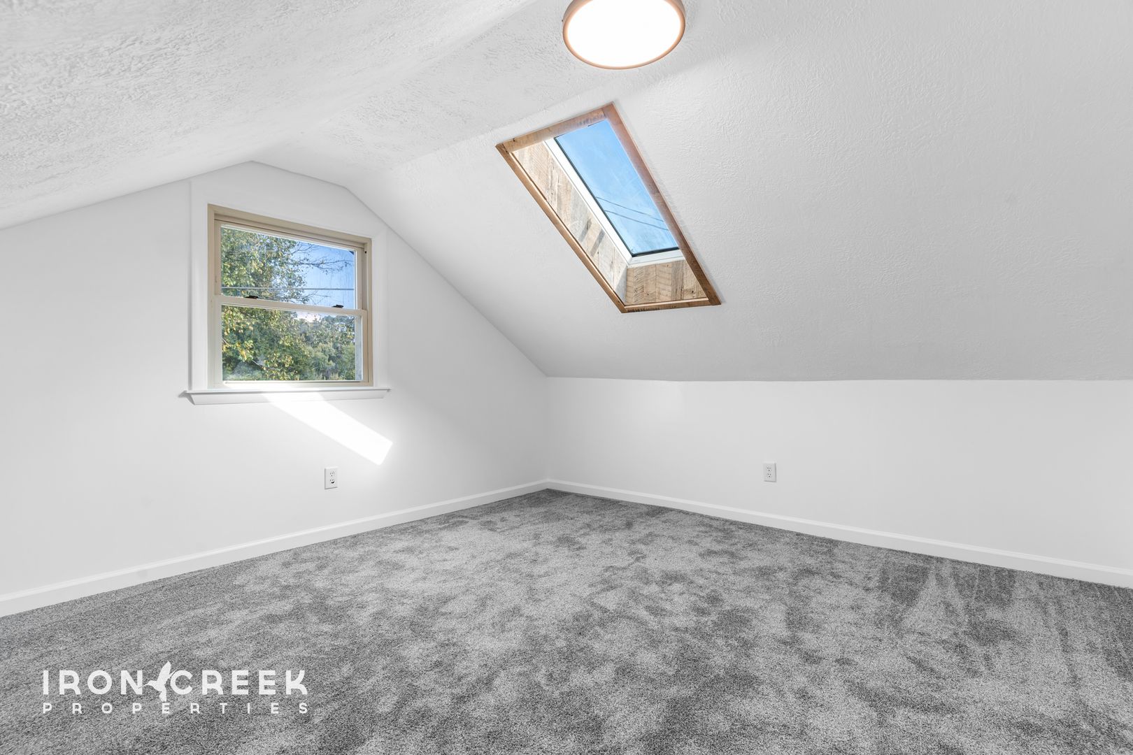 Upstairs, the open loft area showcases vaulted ceilings enhanced by skylights with rustic wood trim, flooding the space with natural light. A third carpeted bedroom offers additional sleeping space, and a convenient half-bath with luxury vinyl plank flooring and its own skylight completes the upper level. The home also includes a washer and dryer for added convenience.
