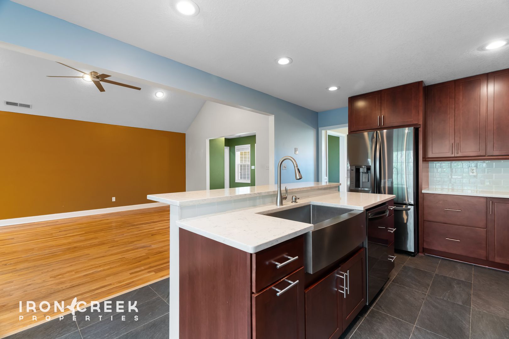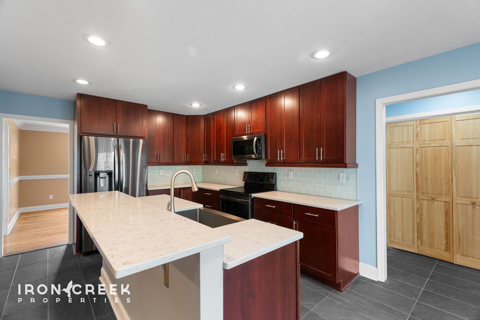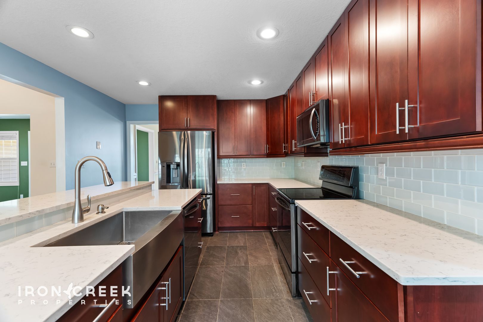 The kitchen is warm and inviting, featuring rich wood cabinetry, granite countertops, a classic tile backsplash, a center island with bar seating and a farmhouse sink. Appliances include a stainless-steel French door refrigerator with built-in ice maker, electric range, over-the-range microwave, and built-in dishwasher.