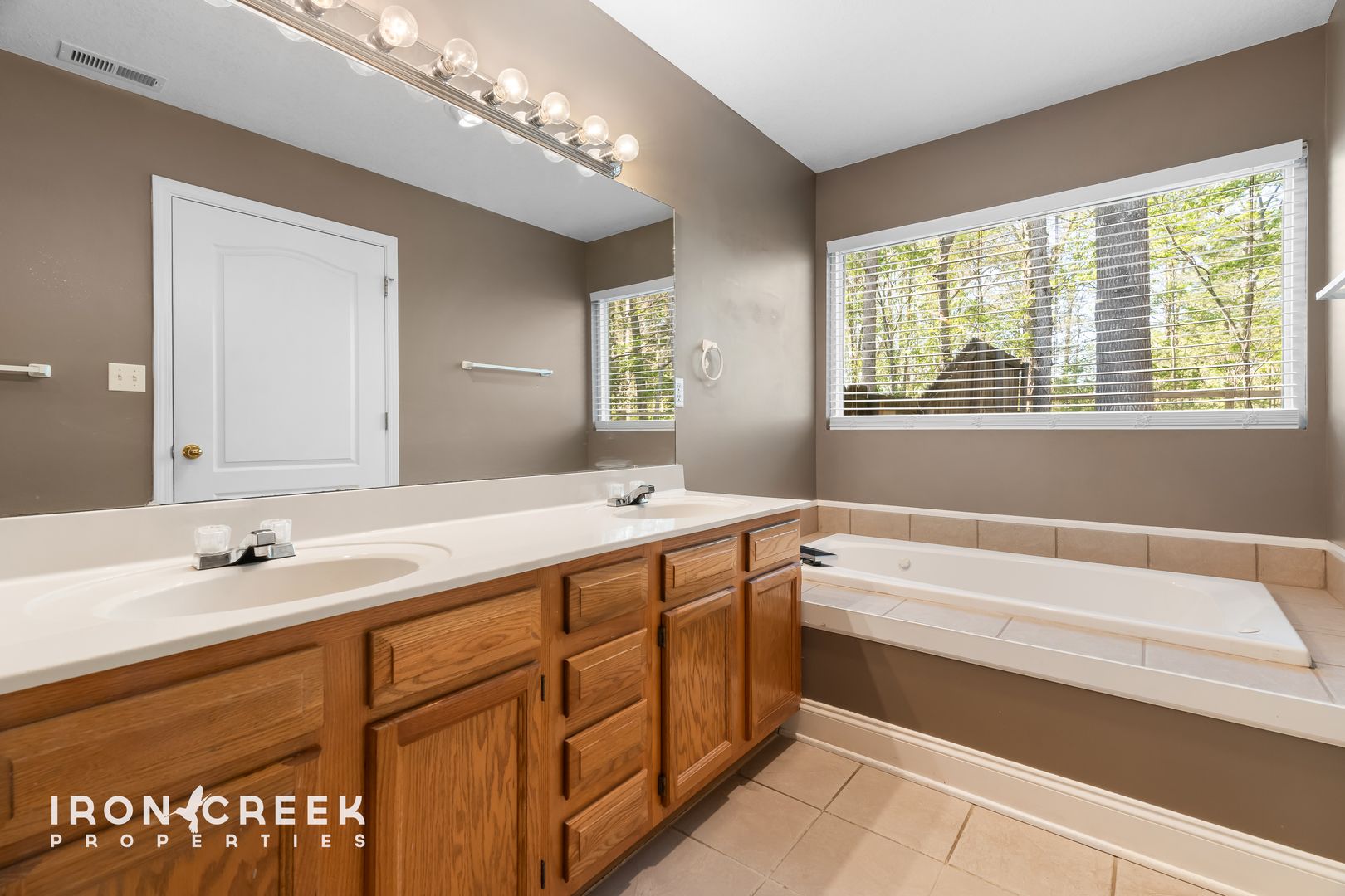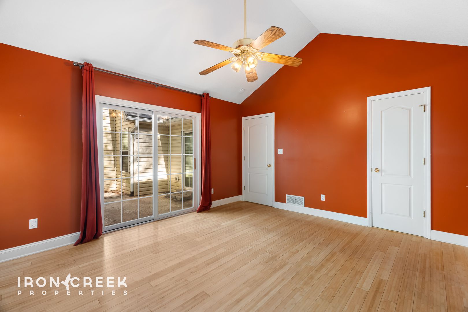 The primary bedroom is spacious and bright, highlighted by vaulted ceilings, a ceiling fan, and sliding glass doors that open directly to the rear patio—perfect for enjoying quiet mornings or unwinding in the evening. It also includes two closets and a private bath with a double vanity and a relaxing garden soaking tub. Two additional bedrooms offer great natural light and ceiling fans, sharing a full bath with a tub and shower.