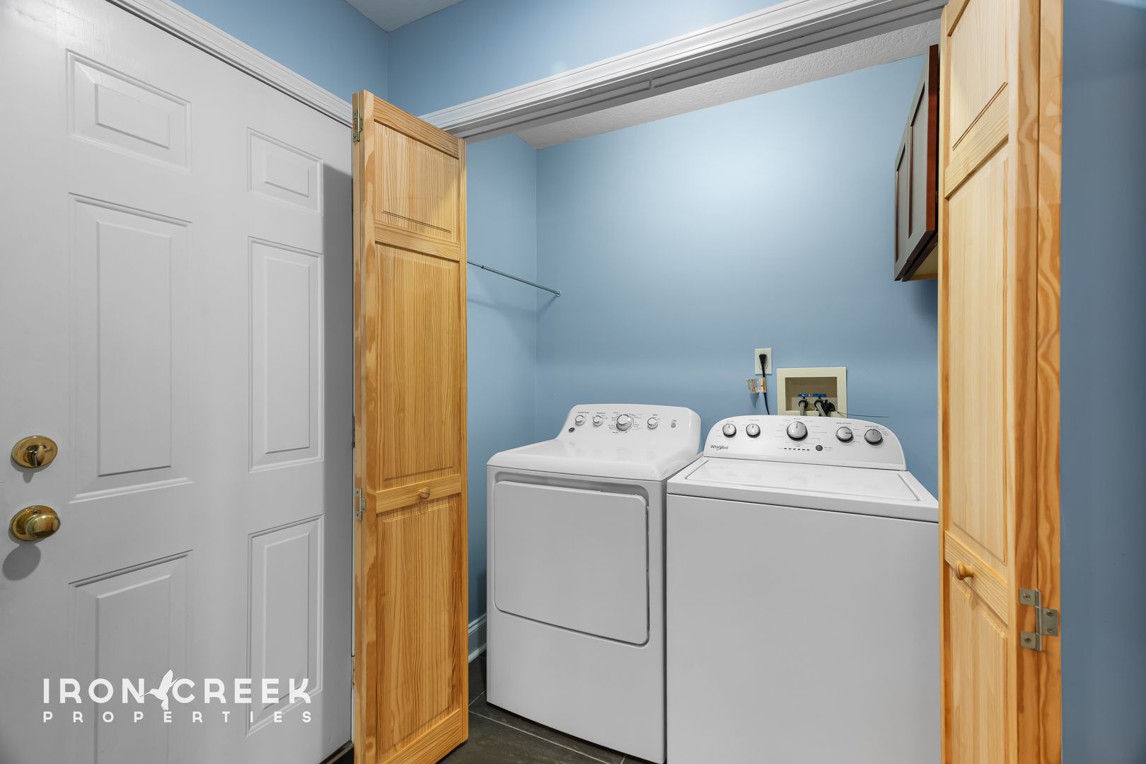The home includes a full-size washer and dryer, gas forced-air heat, and central air conditioning. The attached garage provides covered parking and additional storage, and a storage shed on the property adds even more room for the extras. All of this sits on a fully fenced lot with a back patio and mature trees on all sides.