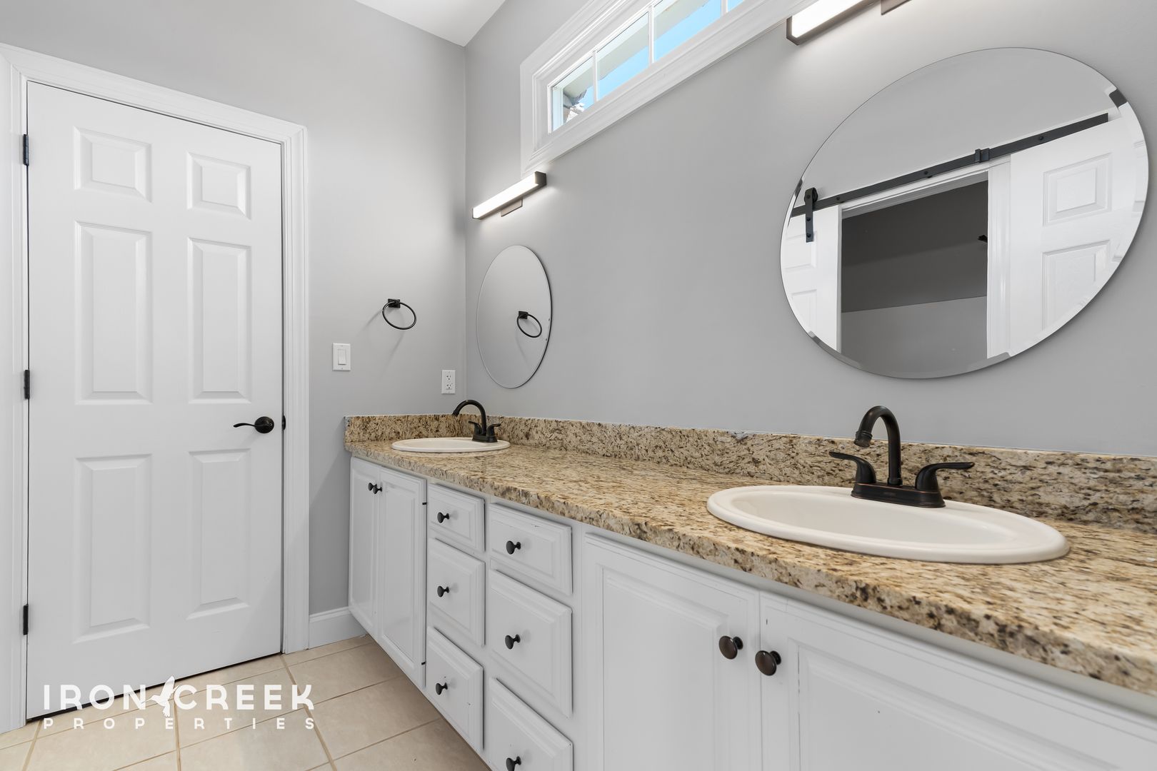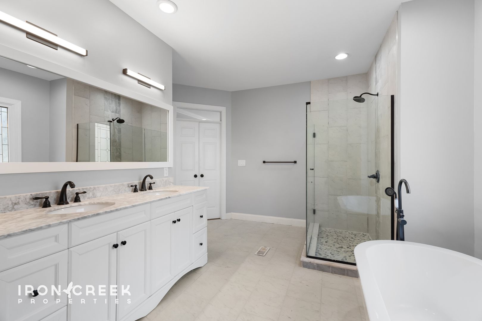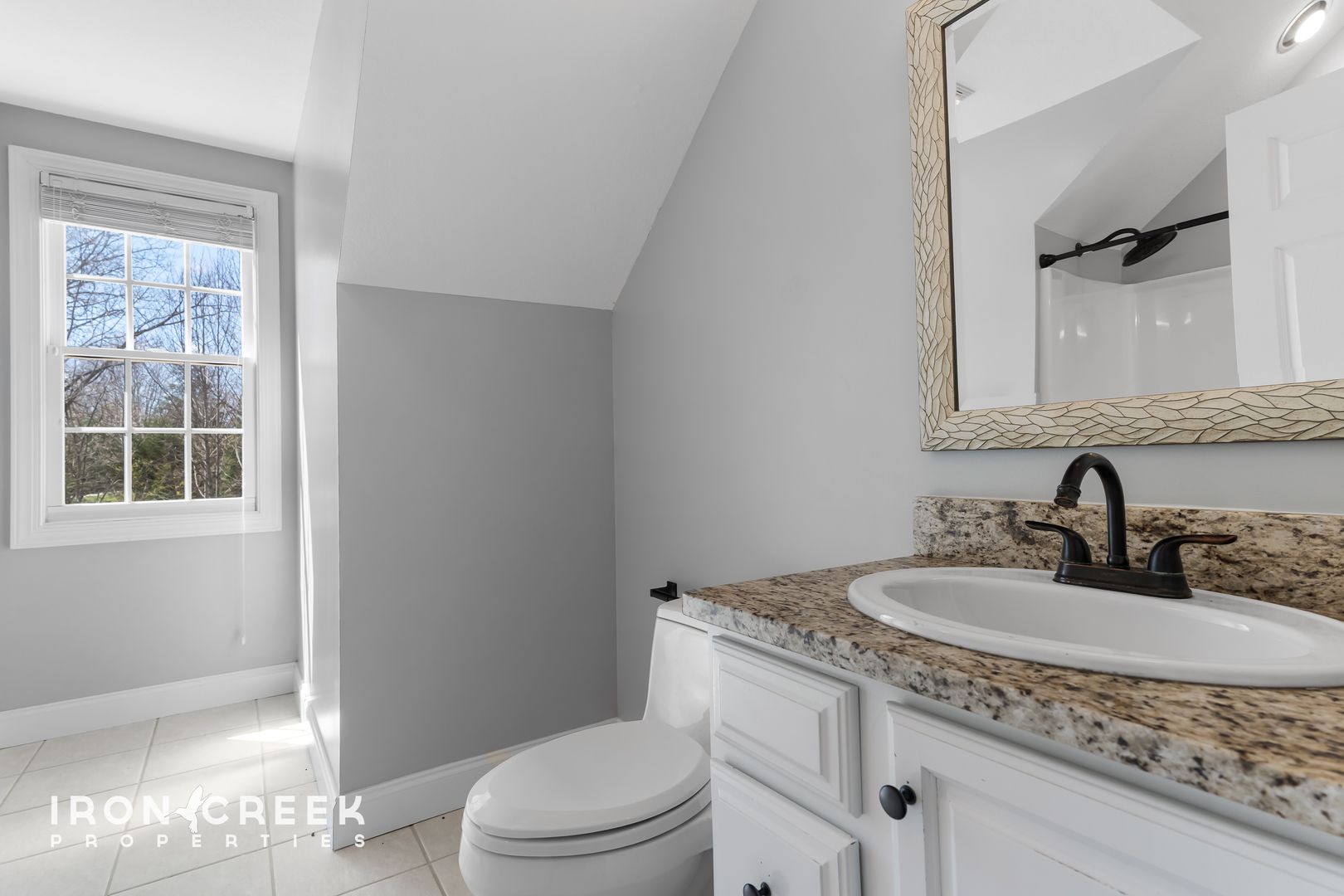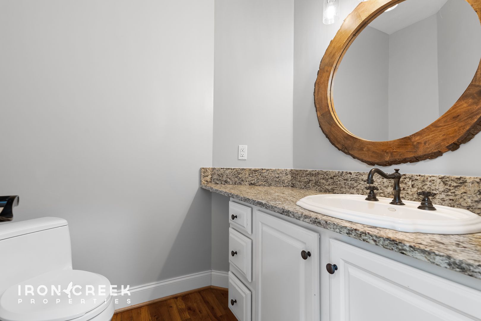 Three bedrooms occupy the main level, including the primary suite with hardwood floors, a walk-in closet, and a private en suite bathroom with a tiled walk-in shower, freestanding soaking tub, and double vanity with granite countertops. The two additional main-level bedrooms share a jack-and-jill bathroom.