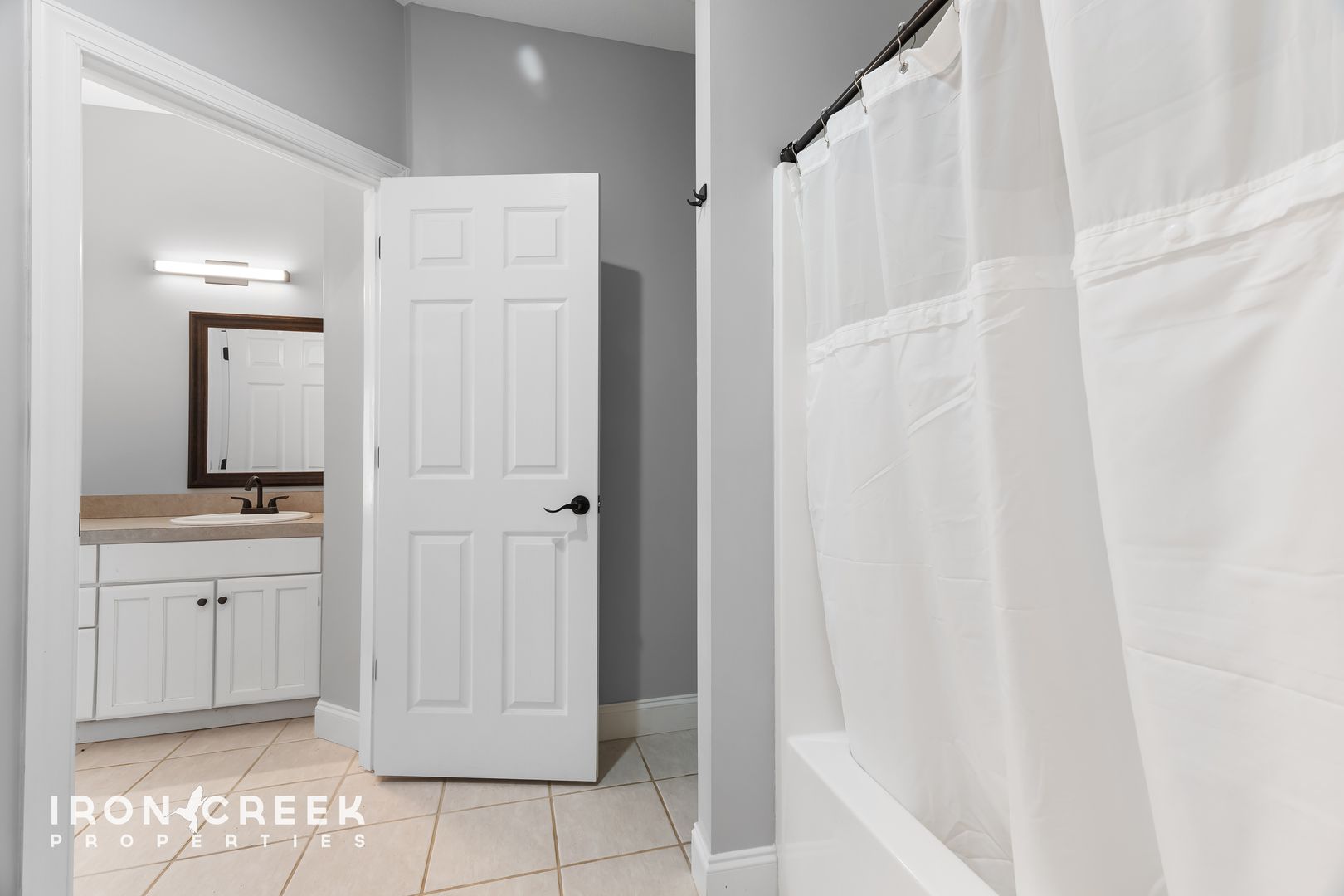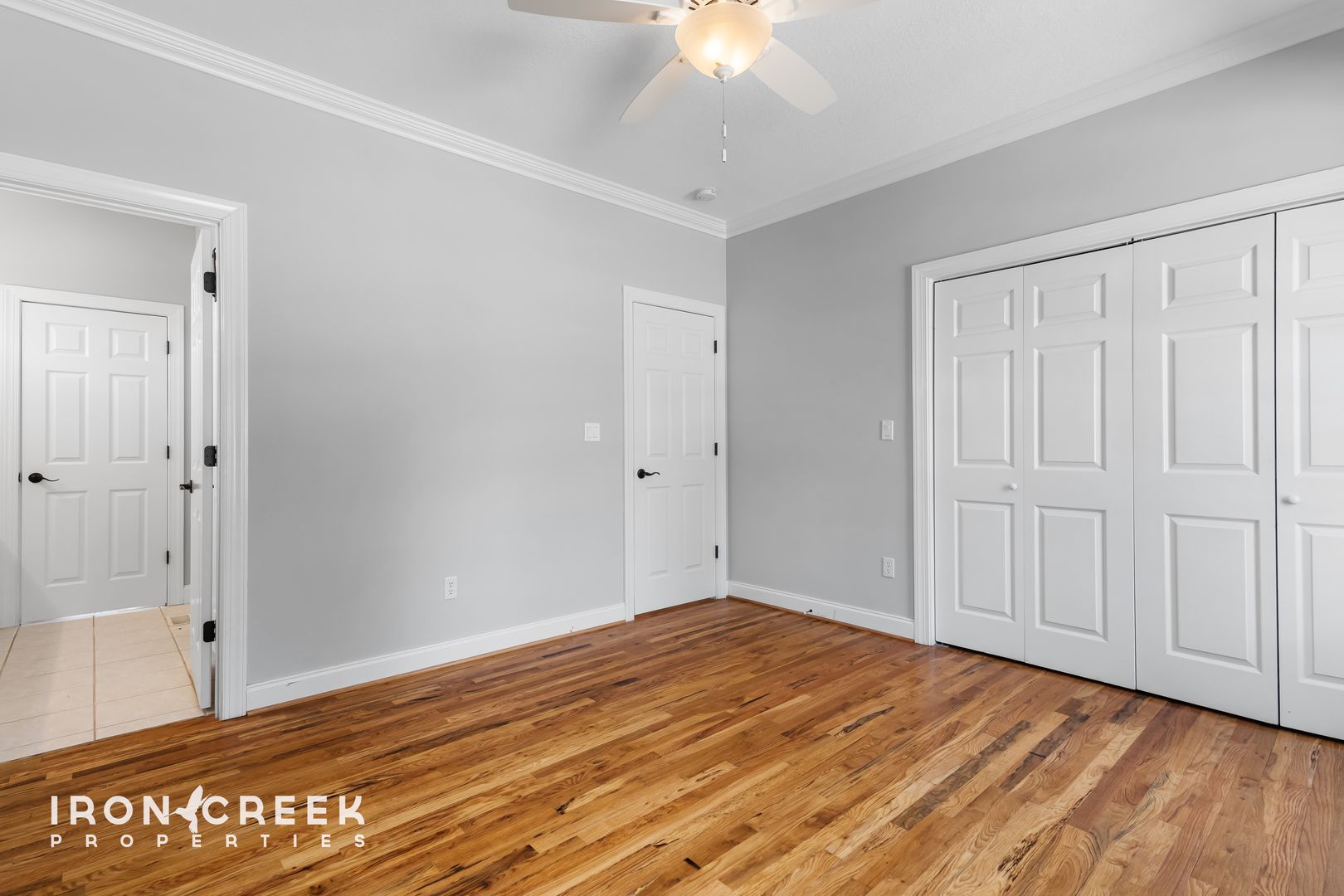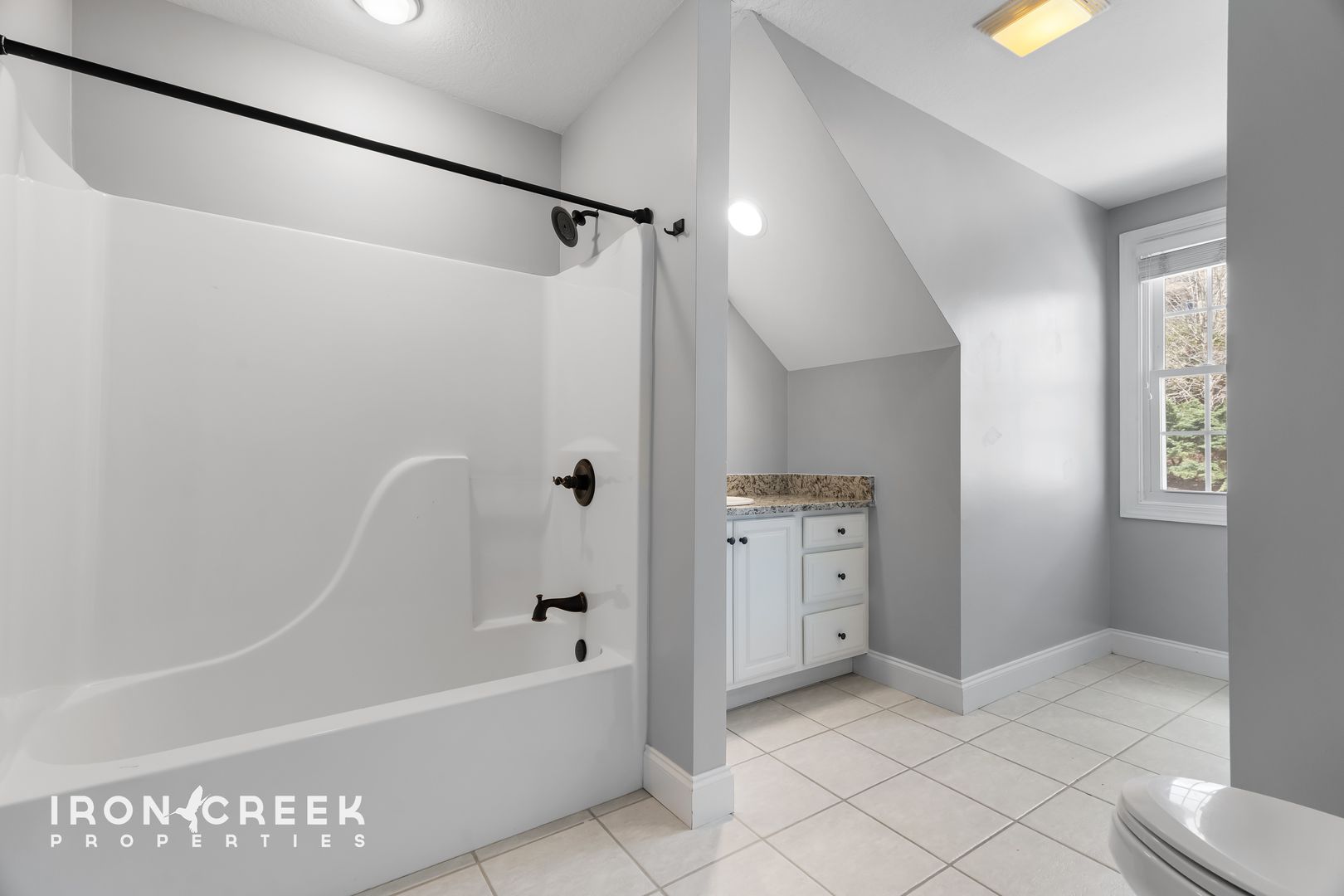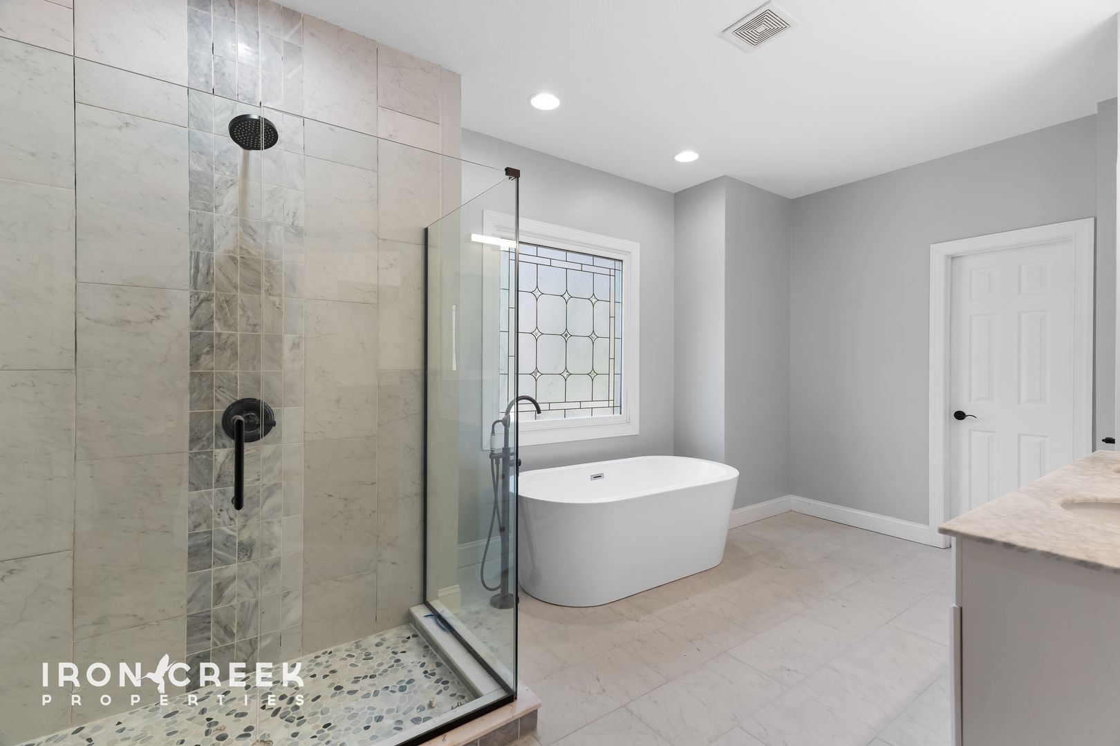 Three bedrooms occupy the main level, including the primary suite with hardwood floors, a walk-in closet, and a private en suite bathroom with a tiled walk-in shower, freestanding soaking tub, and double vanity with granite countertops. The two additional main-level bedrooms share a jack-and-jill bathroom.
