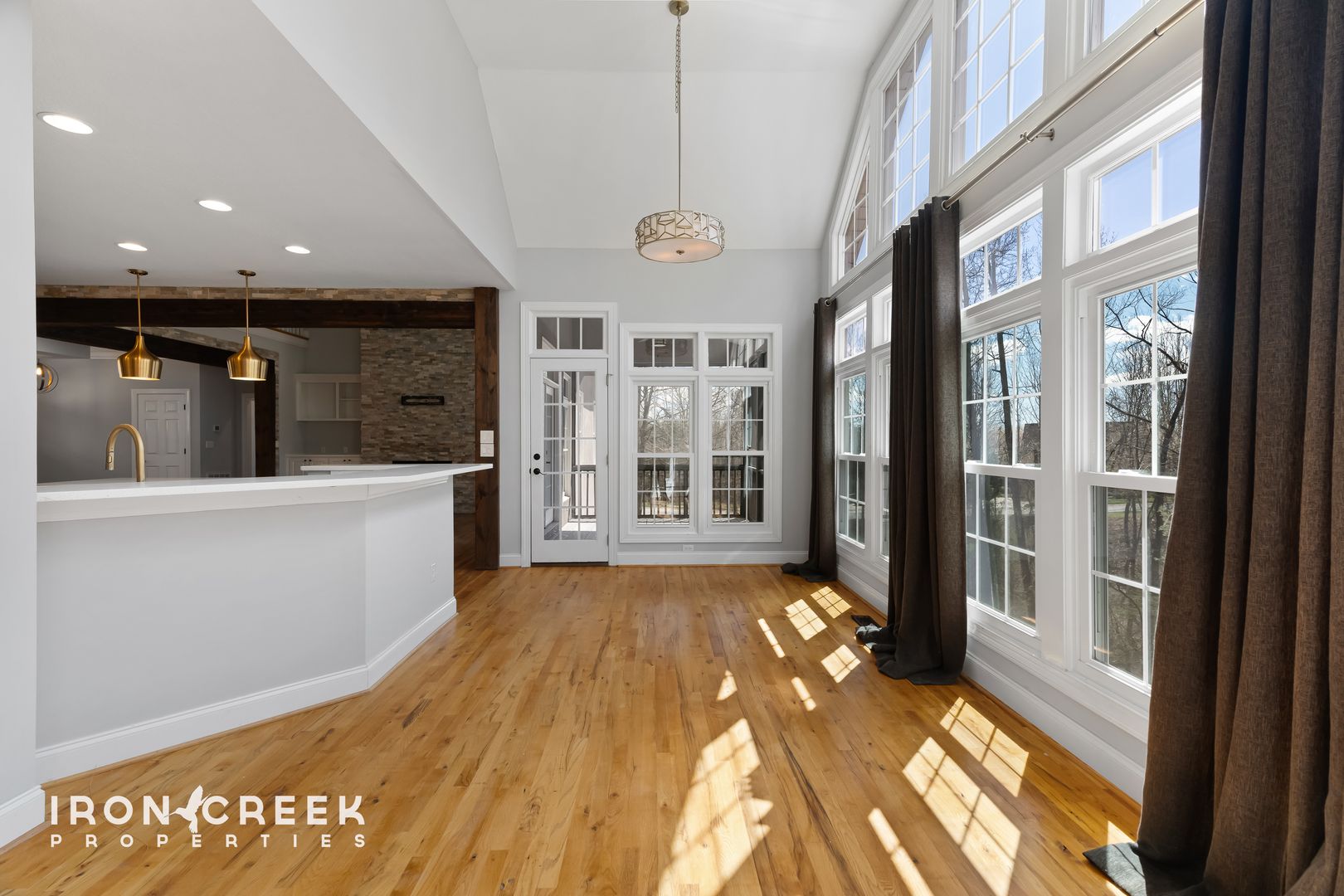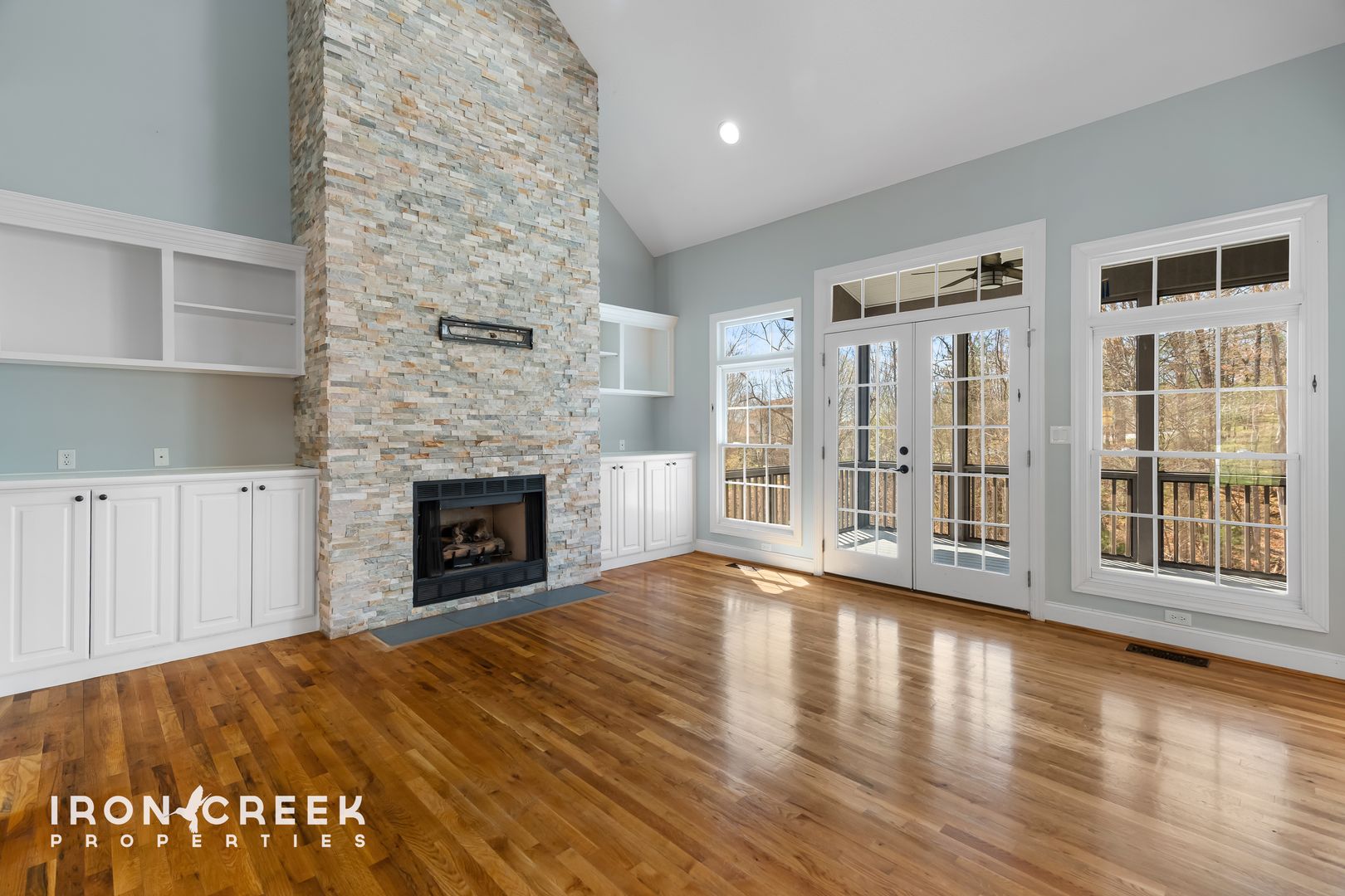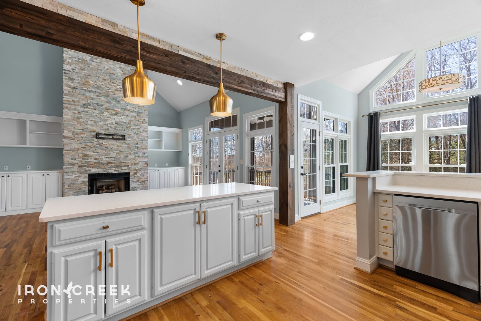 The main level centers on an open kitchen and living area designed for both daily living and entertaining. The kitchen is outfitted with a gas range, built-in dishwasher, and French door refrigerator — all stainless steel — plus a farmhouse sink, quartz countertops, a large wood-clad island, and a tile backsplash. The adjoining living room features a floor-to-ceiling stacked stone gas fireplace flanked by built-in cabinetry, vaulted ceilings, and French doors opening to a screened balcony. A dedicated laundry room outfitted with a full-size washer and dryer sits off the garage on the main level, adjacent to the half bath and dining room.
