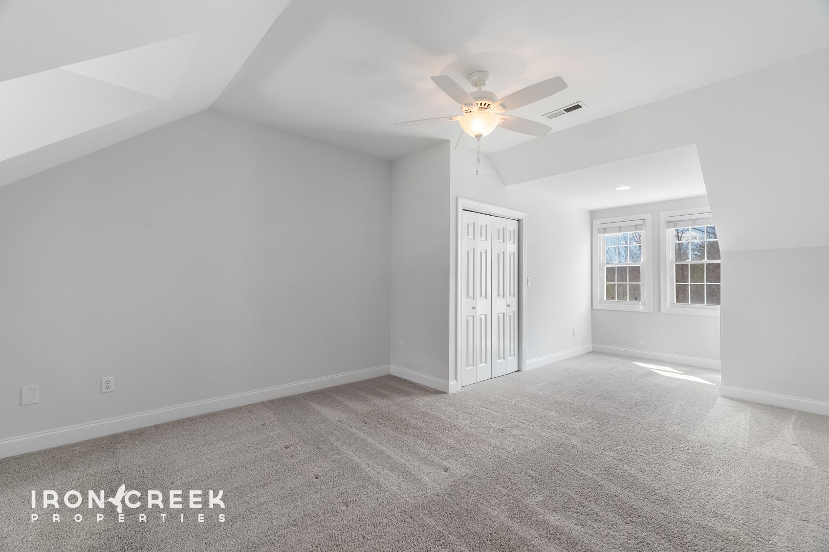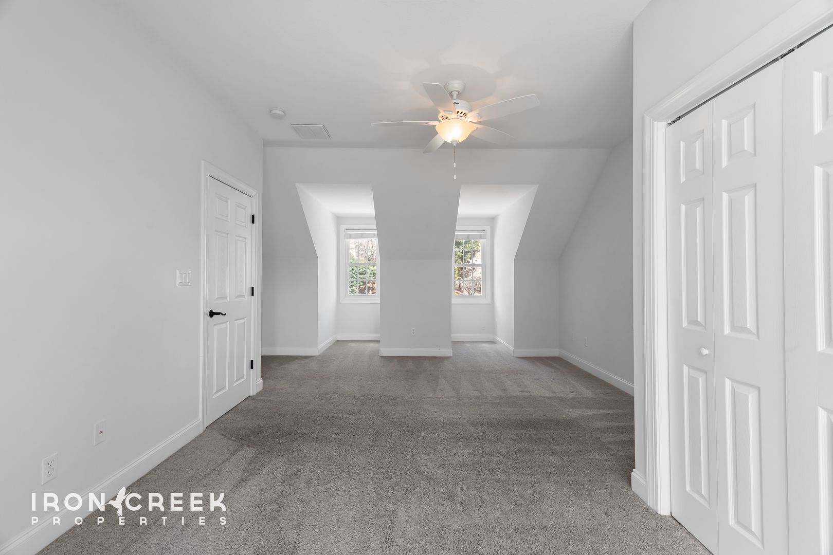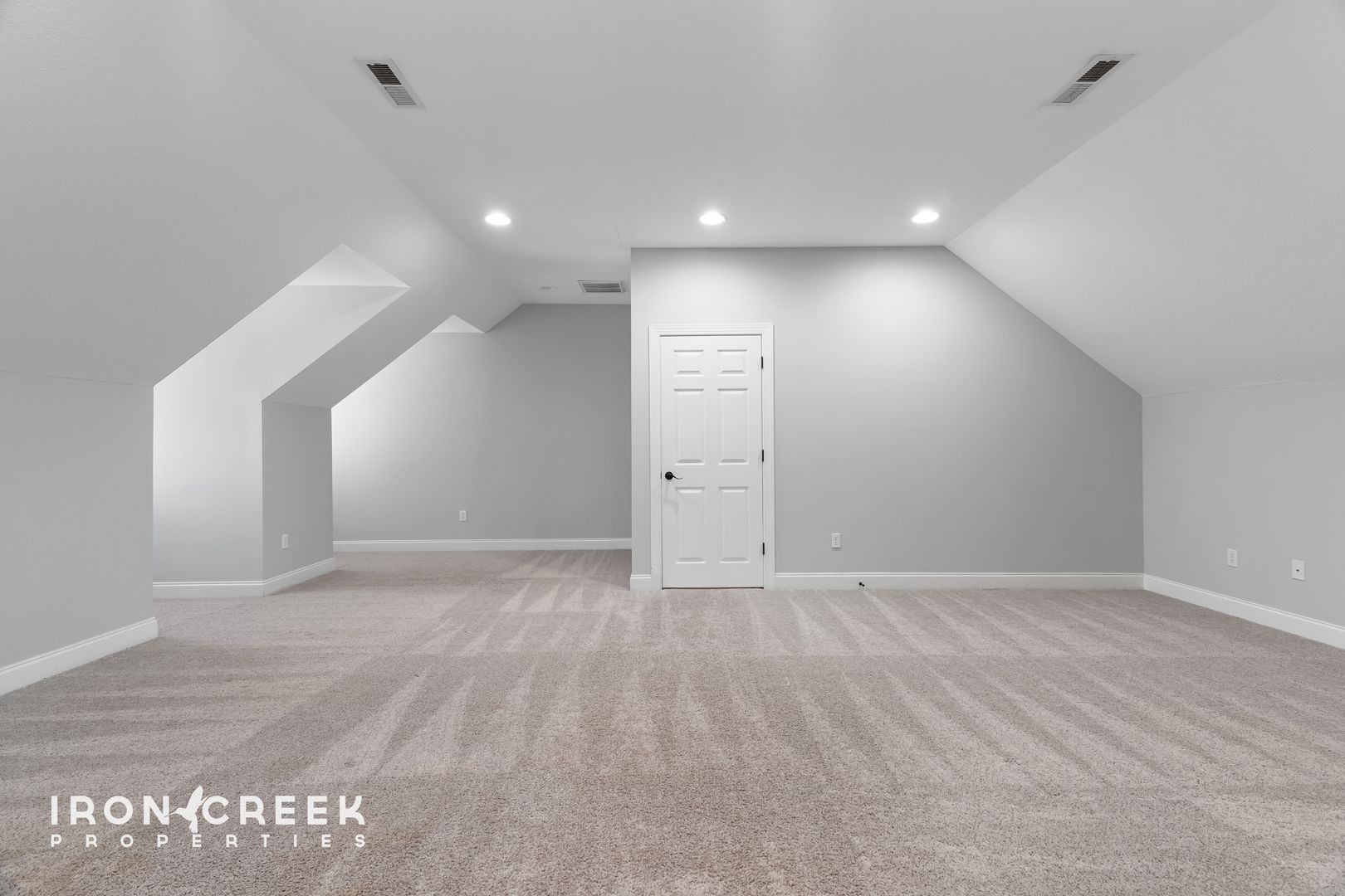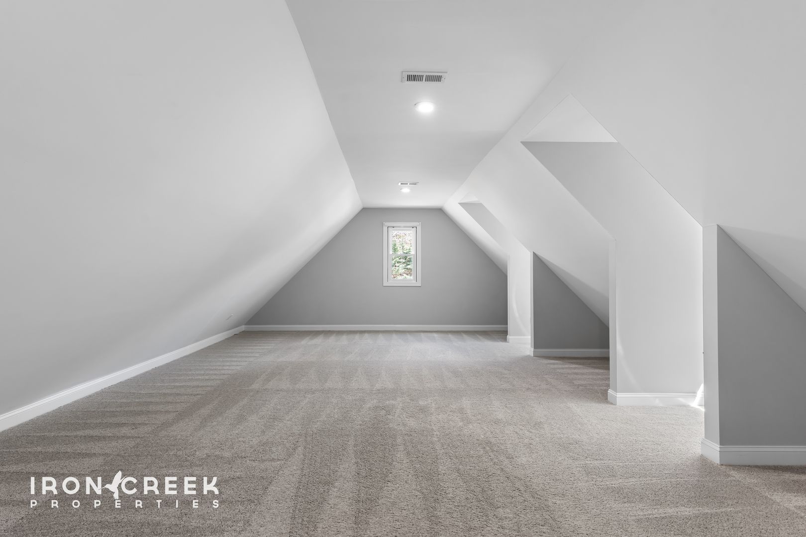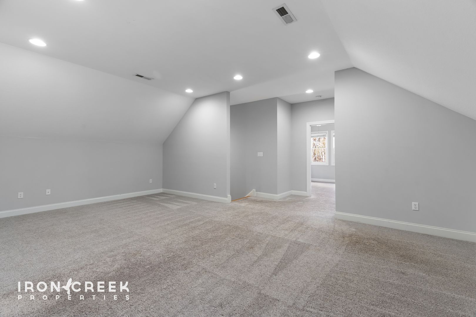 Upstairs, two carpeted bedrooms, a full bathroom, and a large conditioned loft offer flexible space for storage, work, or recreation. The lower level provides a third living area with French doors to the patio, one additional bedroom, and a full bathroom. Central gas heat and air conditioning serve the main and upper levels, with a two-car attached garage completing the home.