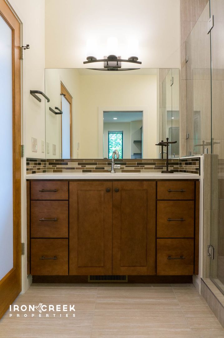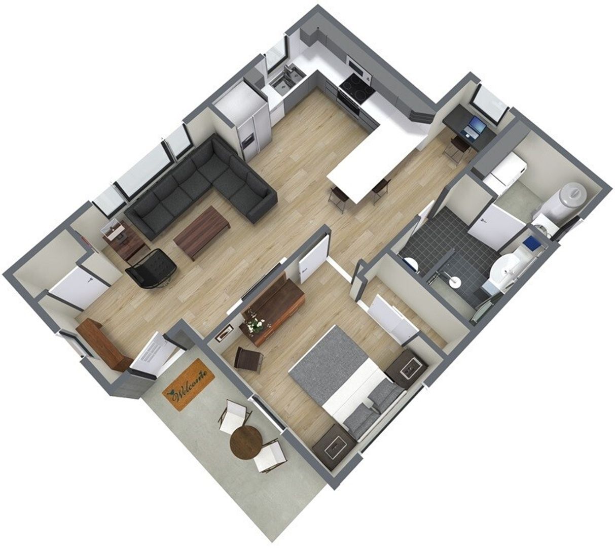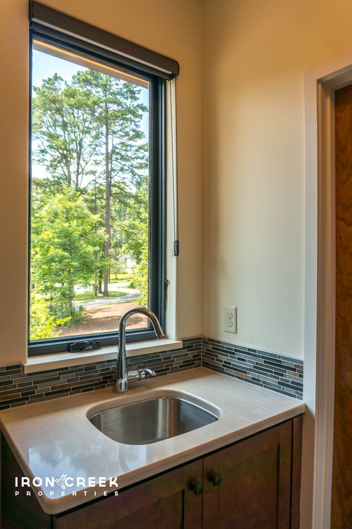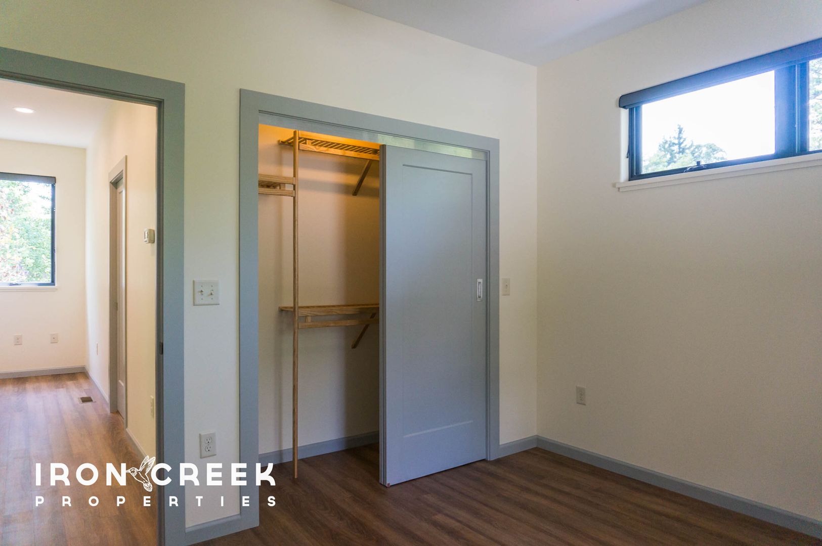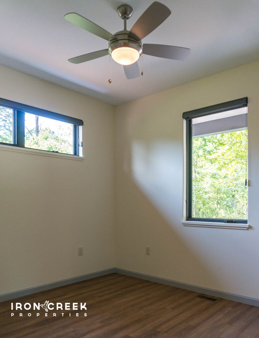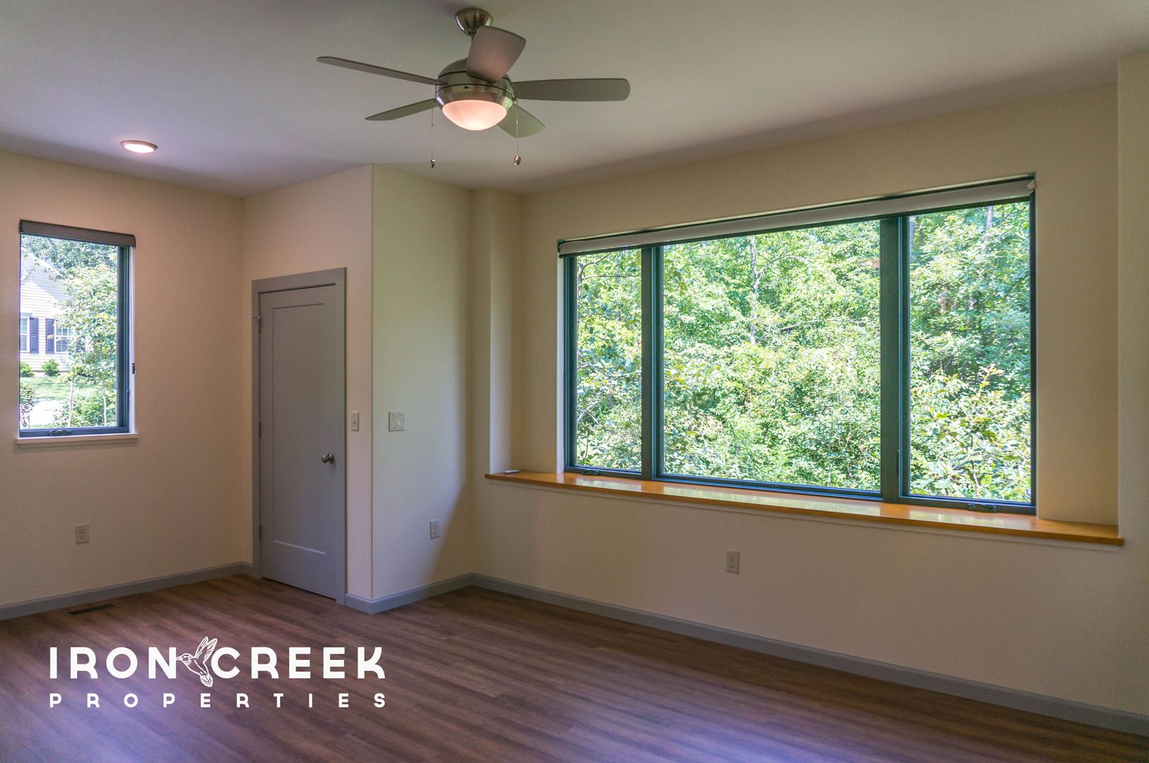 The bright living area showcases a large picture window that bathes the space in natural light while offering tranquil wooded views. Luxury vinyl plank flooring flows throughout the main living areas, providing both beauty and easy maintenance. The bedroom features generous natural light and a ventilated wood closet system for optimal storage. The bathroom offers a refined escape with radiant heat floors, a wood vanity with quartz countertop and tiled backsplash, and a luxurious floor-to-ceiling tiled shower.
