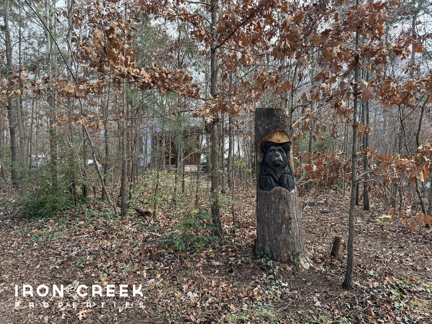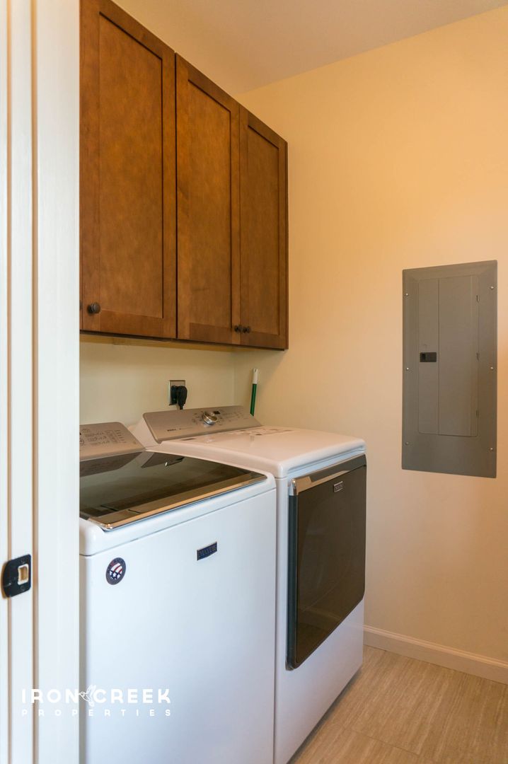 Additional features include a dedicated laundry room with washer and dryer, built-in cabinets, laundry sink with quartz counters, and a floor drain for added convenience. Semi-conditioned attic space provides extra storage. Central air and electric heat ensure year-round comfort. Outside, enjoy a gravel driveway for easy parking and a stone patio nestled in a peaceful tree grove, perfect for morning coffee or evening relaxation.