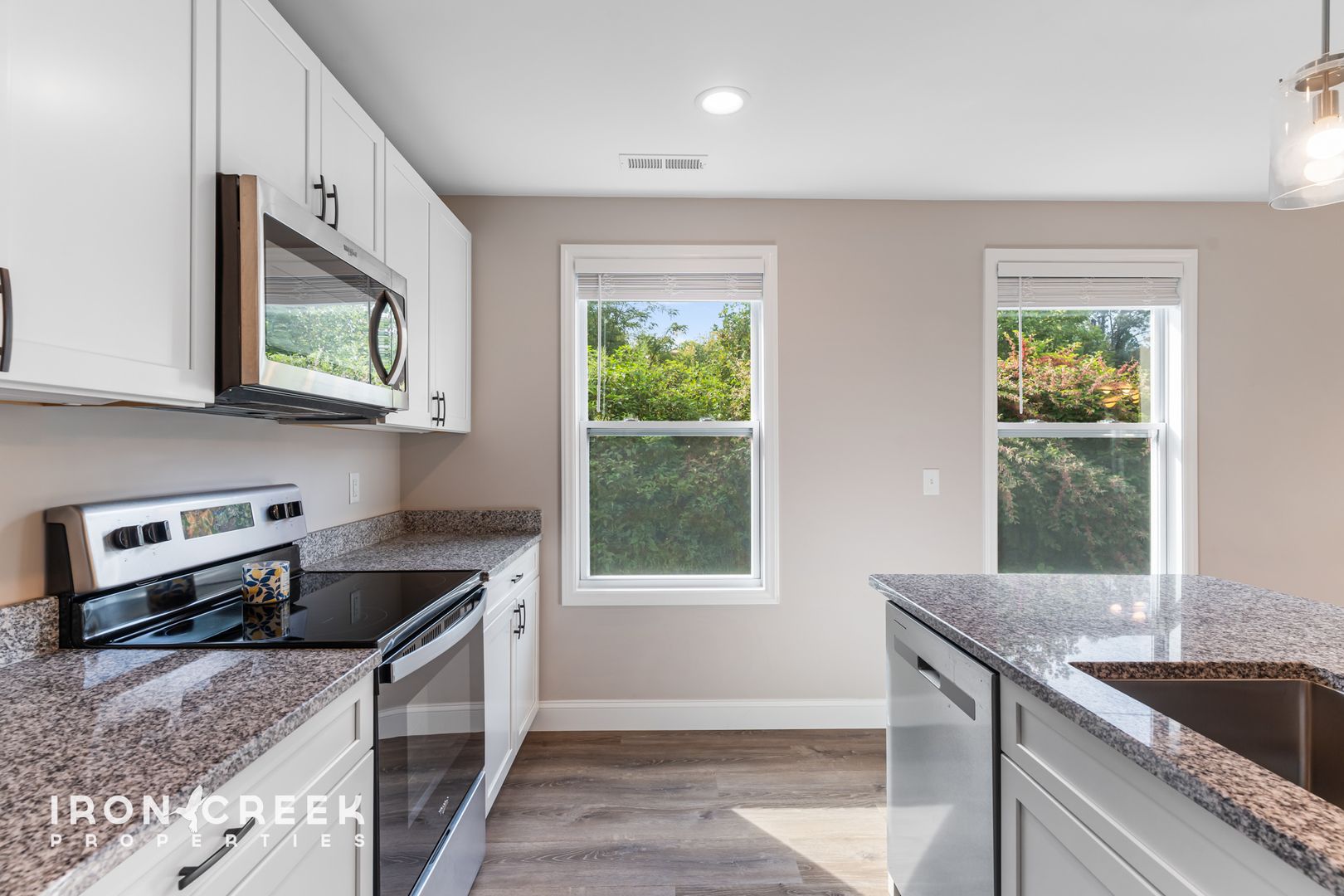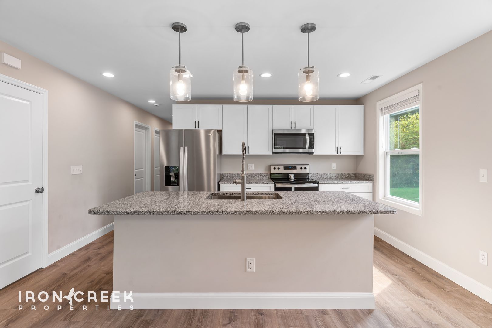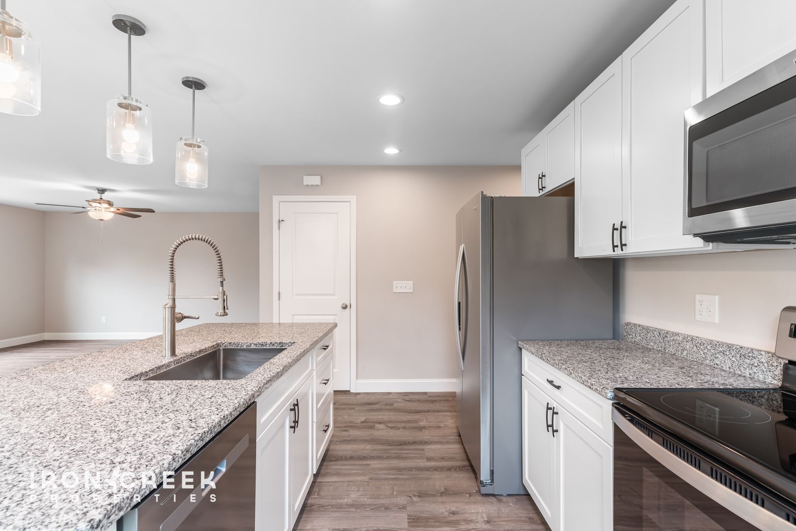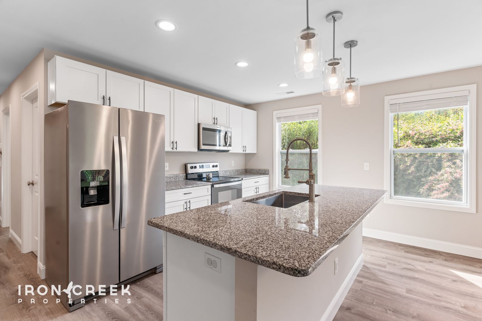 This three-bedroom, two-bath home features premium granite countertops, luxury vinyl plank flooring, and designer pendant lighting. The kitchen is outfitted with stainless steel appliances including a French door refrigerator, over-the-range microwave, electric range, built-in dishwasher, and garbage disposal, complemented by elegant white cabinetry and a spacious island perfect for meal preparation and entertaining.