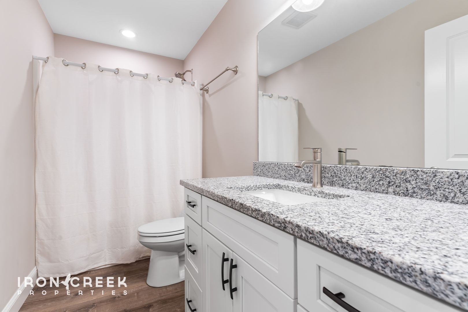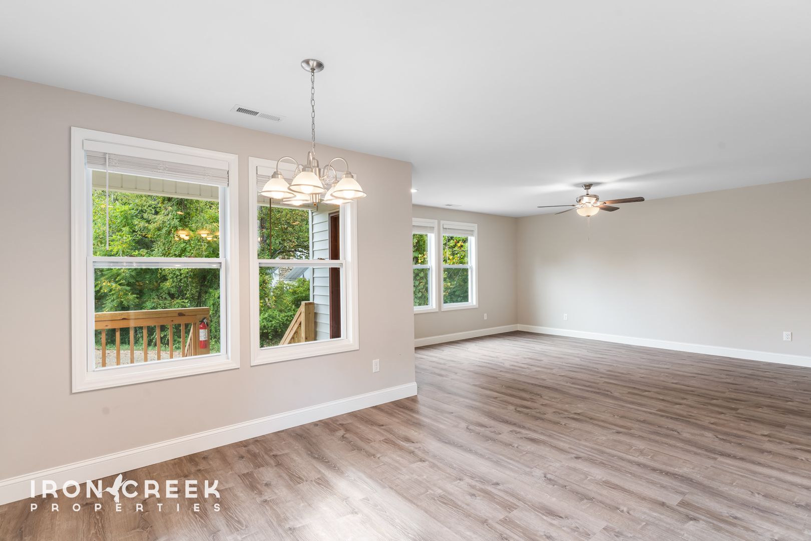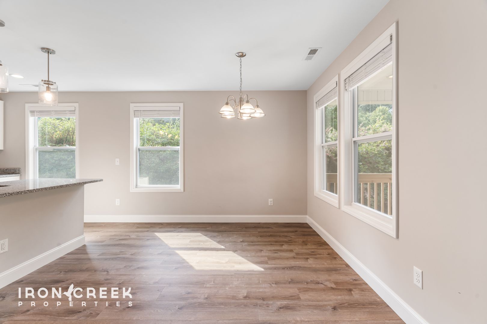 This three-bedroom, two-bath home features premium granite countertops, luxury vinyl plank flooring, and designer pendant lighting. The kitchen is outfitted with stainless steel appliances including a French door refrigerator, over-the-range microwave, electric range, built-in dishwasher, and garbage disposal, complemented by elegant white cabinetry and a spacious island perfect for meal preparation and entertaining.