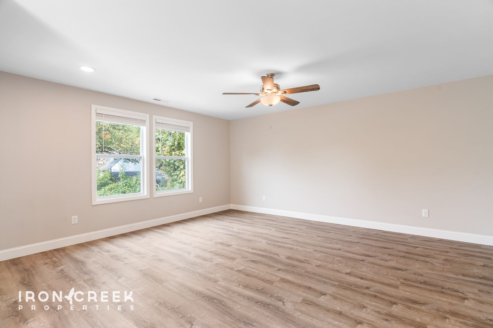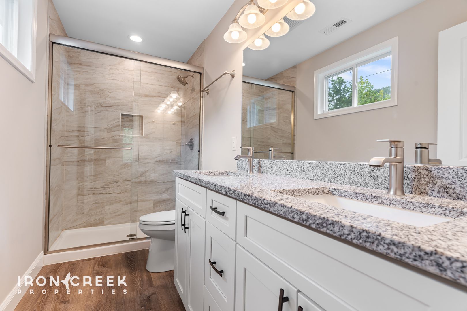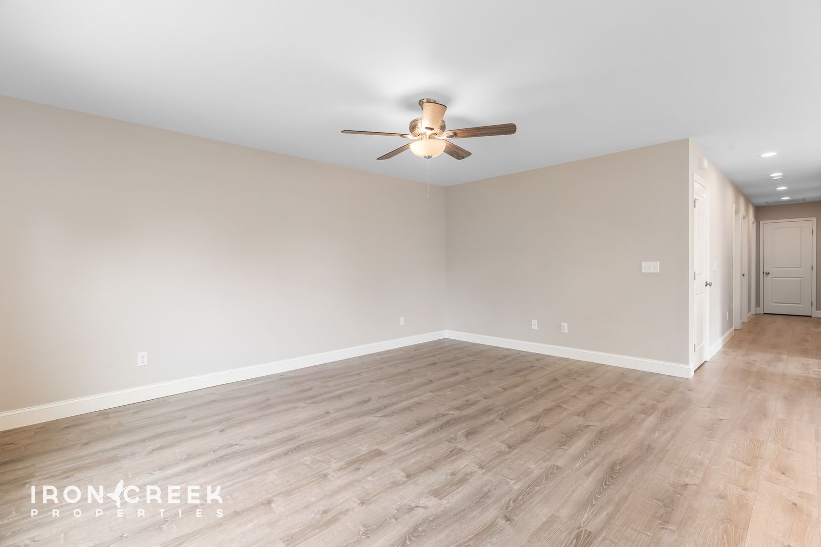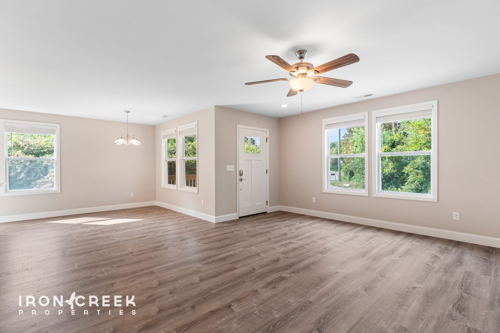 This three-bedroom, two-bath home features premium granite countertops, luxury vinyl plank flooring, and designer pendant lighting. The kitchen is outfitted with stainless steel appliances including a French door refrigerator, over-the-range microwave, electric range, built-in dishwasher, and garbage disposal, complemented by elegant white cabinetry and a spacious island perfect for meal preparation and entertaining.